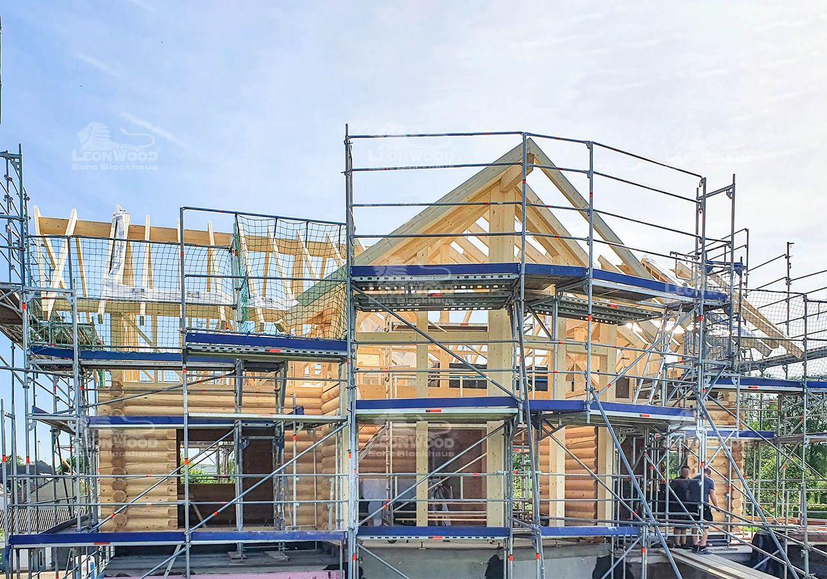 Besonders am „Kodiak Country“ sind zweifelsohne die vier Schiffsgiebel, die sowohl an den eigentlichen Giebelseiten, als auch an den beiden traufseitigen Erkern (Zwerchgiebel) hervorspringen. Einer dieser Giebel wurde zusätzlich großflächig verglast und stellt somit die Schmuckseite dieses Rundstammhauses dar, welches derzeit im Hunsrück realisiert wird. Unsere Bauherren setzen mit der Rundstammwand NordicRound* auf die ursprüngliche Form des Baumes und würzen die extravagante Architektur des Hauses mit natürlichen Formen und Ambiente. Durch den hohen Kniestock können sie sich auf nahezu zwei Vollgeschossen und rund 190m² Wohnfläche entfalten.