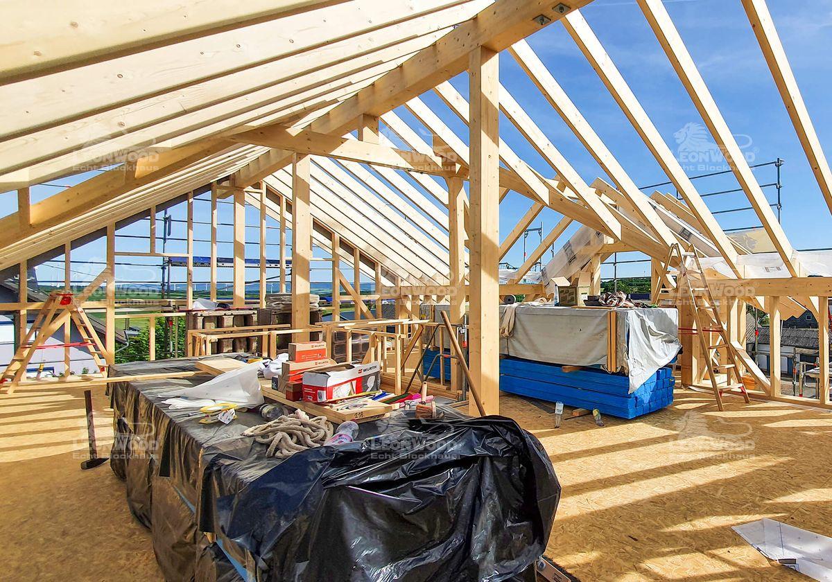 Innenwände: Rundstamm-Innenwände im EG, sonst Ständerbauweise;
