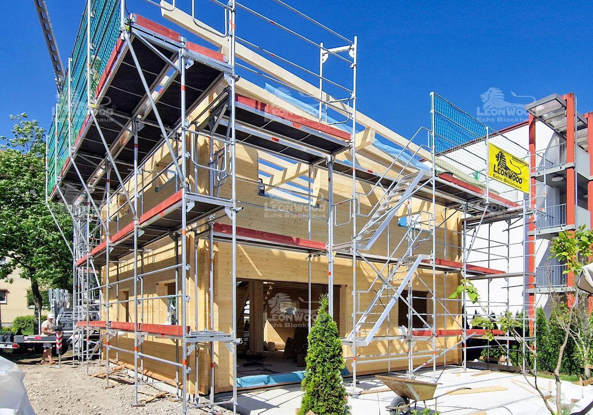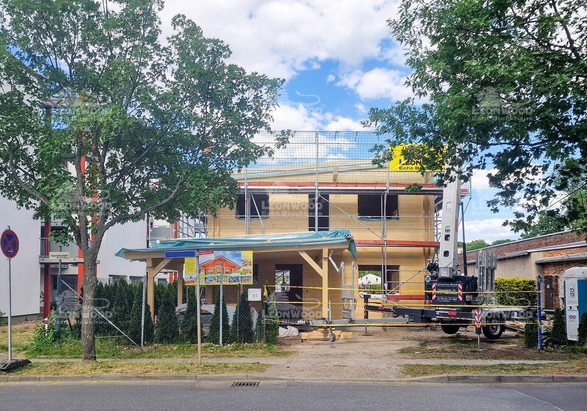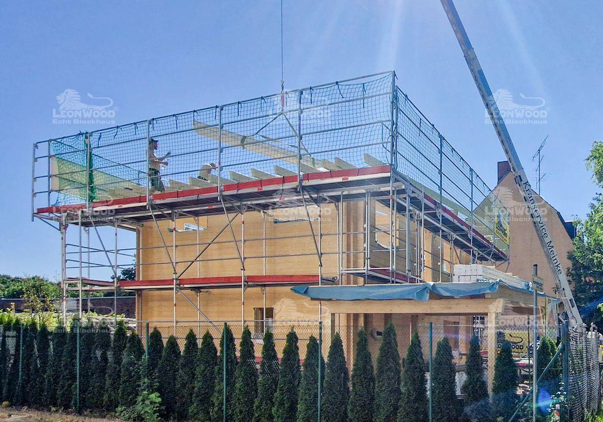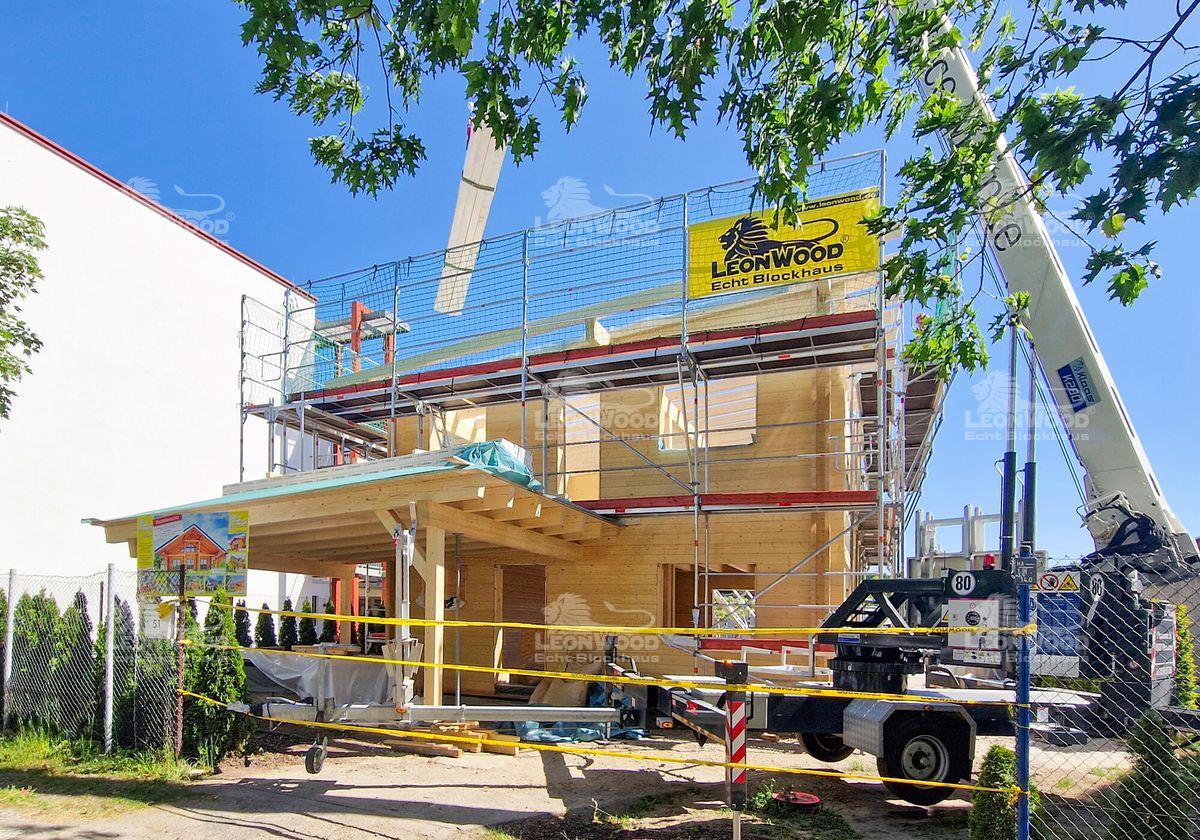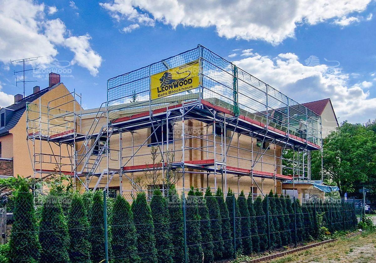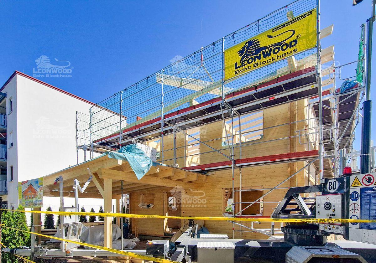 Moderne Architekturen sind im Blockhausbau mittlerweile Gang und Gäbe. Auch hier entsteht derzeit ein Holzhaus im kubischen Design: eine quadratische Grundfläche, zwei Vollgeschosse und ein leicht geneigtes Flachdach machen diesen Entwurf aus. Unser Bauherr aus dem Brandenburgischen Cottbus lässt sich darüber hinaus einen Carport an das Haus konstruieren. Die atmungsaktive BIO-Doppelwand® von LéonWood® wurde über beide Etagen verbaut. So können sich ihre wohngesunden Eigenschaften im ganzen Haus entfalten. Das Holzhaus wird zusätzlich mit Polar-Fenster mit 5-fach-Wirkung ausgestattet. Diese verfügen zum Beispiel über einen praktischen Lüftungsflügel, der eine seichte, konstante Belüftung des Blockhauses gewährleistet. Auf insgesamt 120m² Wohnfläche kann sich unser Bauherr später entfalten.