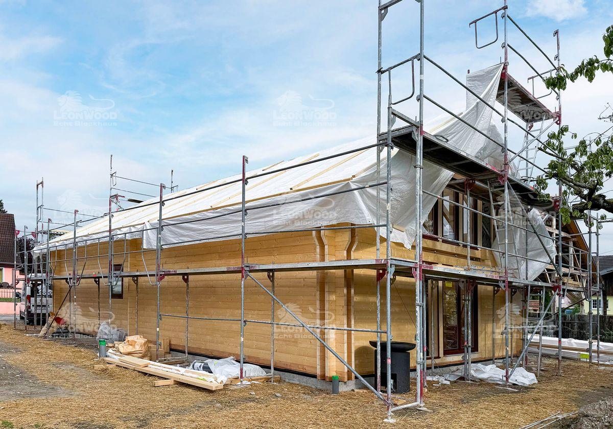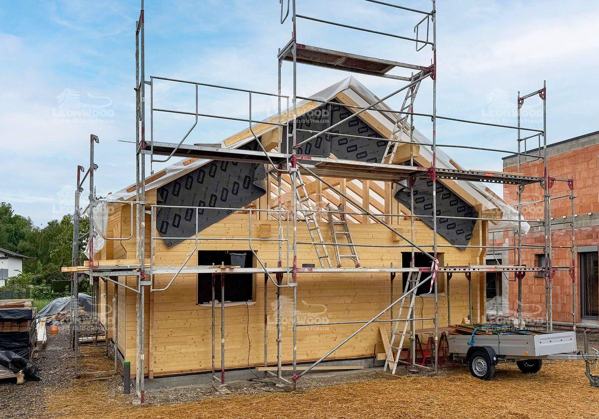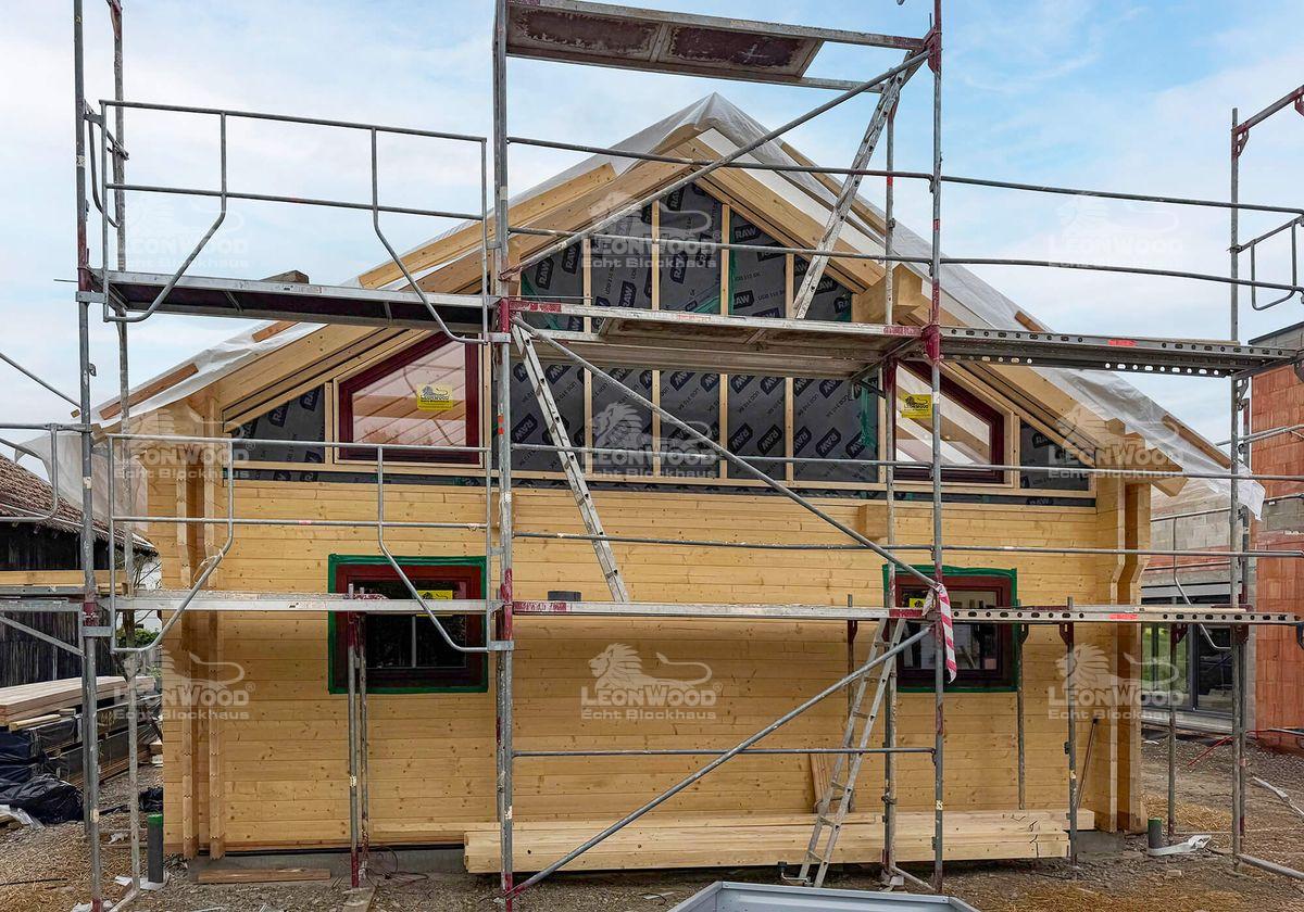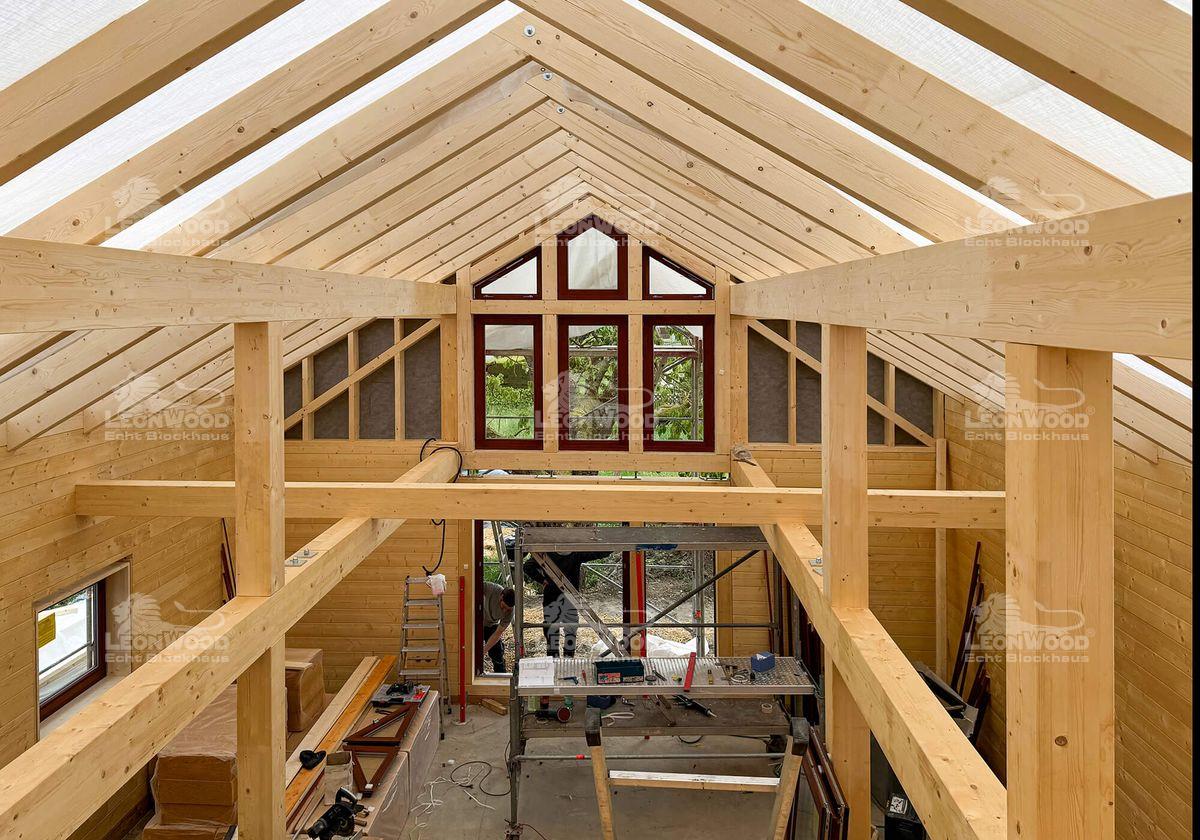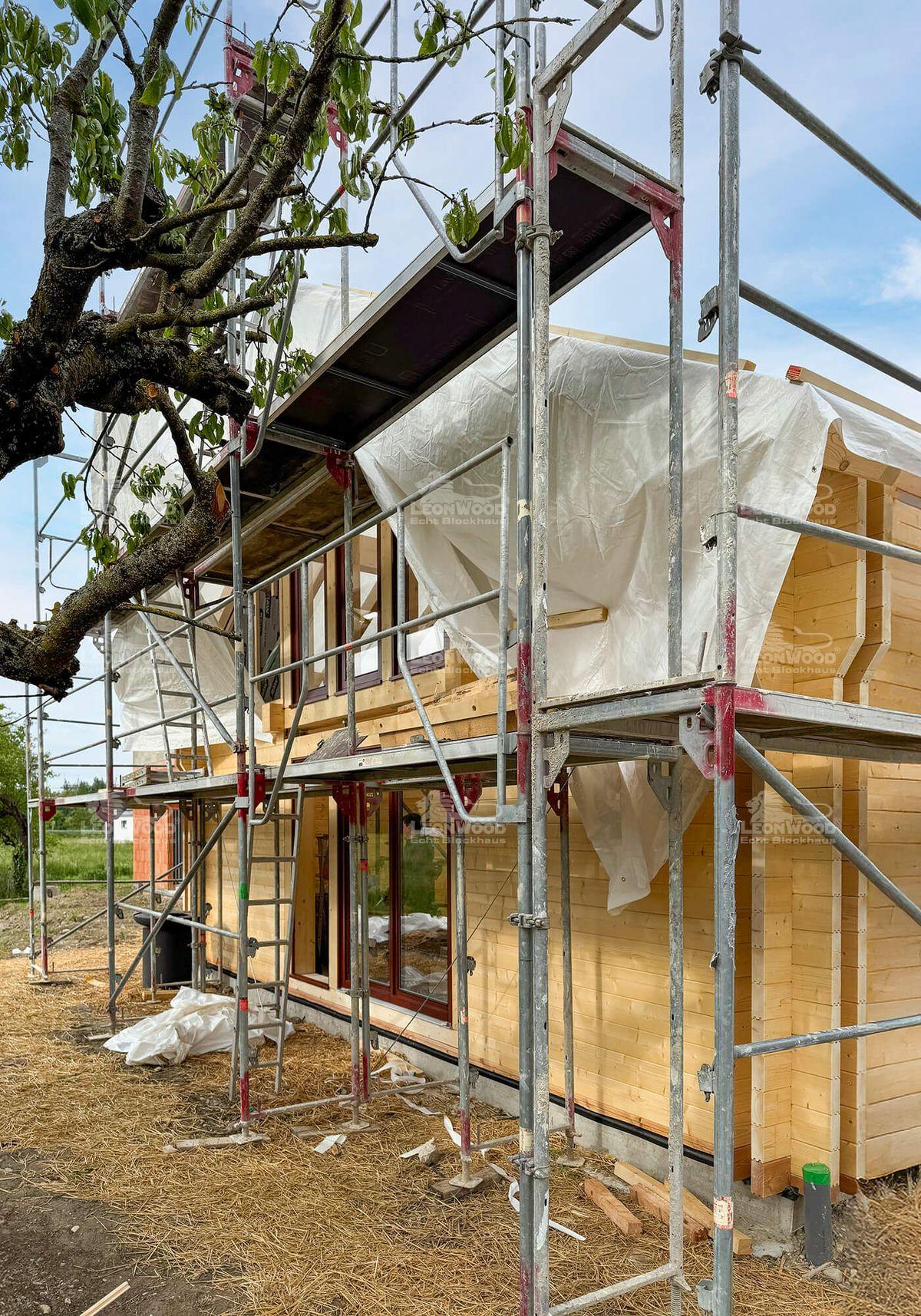 Auf der Baustelle im malerischen Elsass entsteht derzeit ein individuell geplantes Blockhaus. Auffällig ist die großflächige Verglasung an der Giebelseite sich über die gesamte Haushöhe erstreckt. Diese lichtdurchflutete Fassade bietet einen atemberaubenden Blick nach außen und holt die Natur so direkt ins Haus. Das Innere besticht durch einen großzügigen Grundriss mit Galerie und offenem Luftraum, der den Blick direkt auf die sichtbare Dachkonstruktion freigibt – ein echtes Highlight des Hauses. Getreu dem ökologischen Baukonzept, hat sich unsere Bauherrin bewusst für nachhaltige, natürliche Baustoffe entschieden: die Außenwand besteht aus einer Kombination von Holz und Kork in der innovativen BIO-Doppelwand®, die hervorragende Dämmwerte aufweist. Auch die Innenwände bestehen aus massivem Holz, die für eine warme, natürliche Atmosphäre sorgen und ein behagliches Wohngefühl vermitteln. Beim Fußboden wurde ebenfalls auf ökologische Materialien gesetzt: der sogenannte Polar-Fußboden ist mit Kork gedämmt und trägt so zu einem gesunden Raumklima bei. Insgesamt umfasst das Haus 130 m² Wohnfläche und verbindet modernes Design mit umweltbewusstem Bauen – für ein nachhaltiges Zuhause im Einklang mit der Natur.
