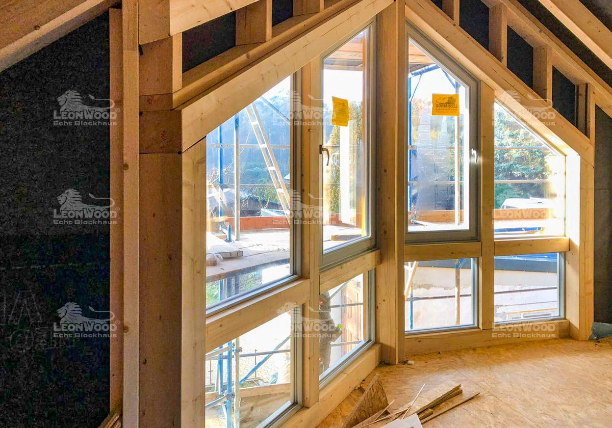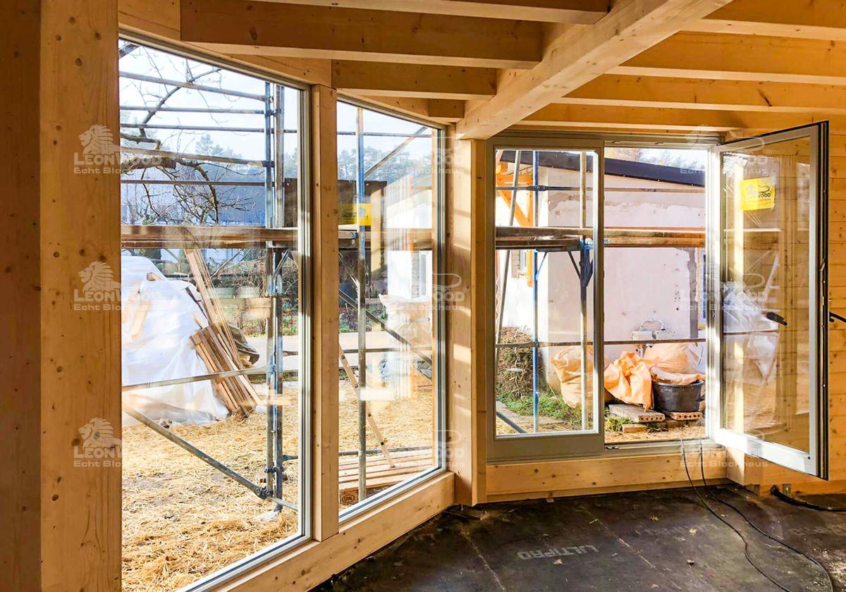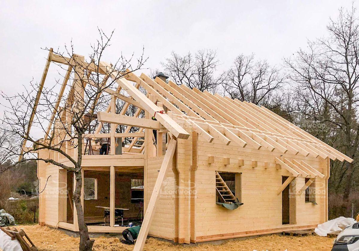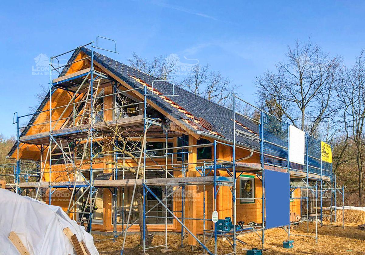 Wieder einmal ein Heimspiel für LéonWood®. Dieses Blockhaus entsteht ganz in der Nähe der LéonWood®-Zentrale in Maust. Markant beim hier entstehenden Haustypen „Adria 140“ ist der große Glasgiebel, der halbseitig eingerückt ist. Durch den großen Dachüberstand entsteht hier ein überdachter Bereich, der wunderbar mit einer Terrasse ergänzt werden kann. Ein hoher Kniestock sorgt für hohe Raumhöhen im Obergeschoss und damit für maßgeblich mehr Wohnkomfort. Daneben ist der Kniestock als Blockwand ausgeführt: die wohngesunden Eigenschaften den innovativen Wandsystems BIO-Doppelwand® können auch im Obergeschoss wirken. Unsere Brandenburger Bauherren entschieden sich für die extra starke Dämmschicht mit fast 20 Zentimetern Kork. Ein hohes Energieeinsparpotential ist garantiert.