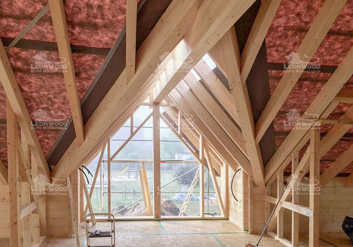 Verschalung der Giebelseiten mit 44mm starken, massiven Blockbohlen (Optik wie Außenwand EG);