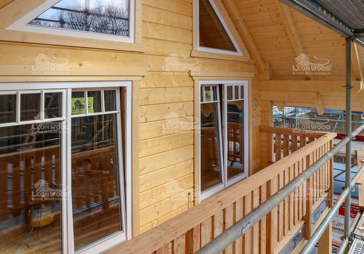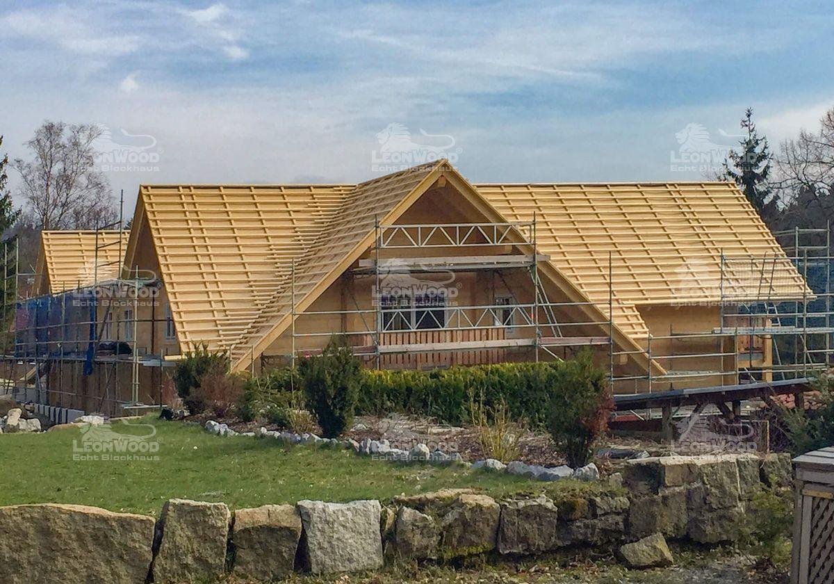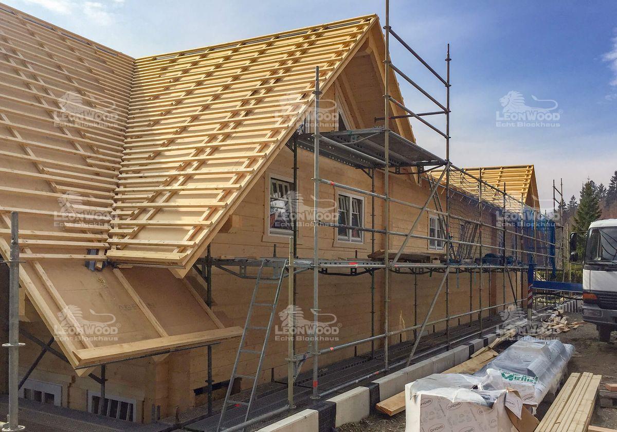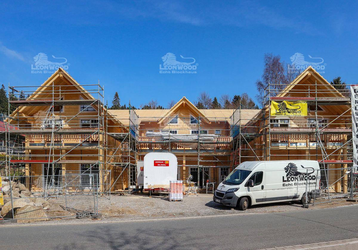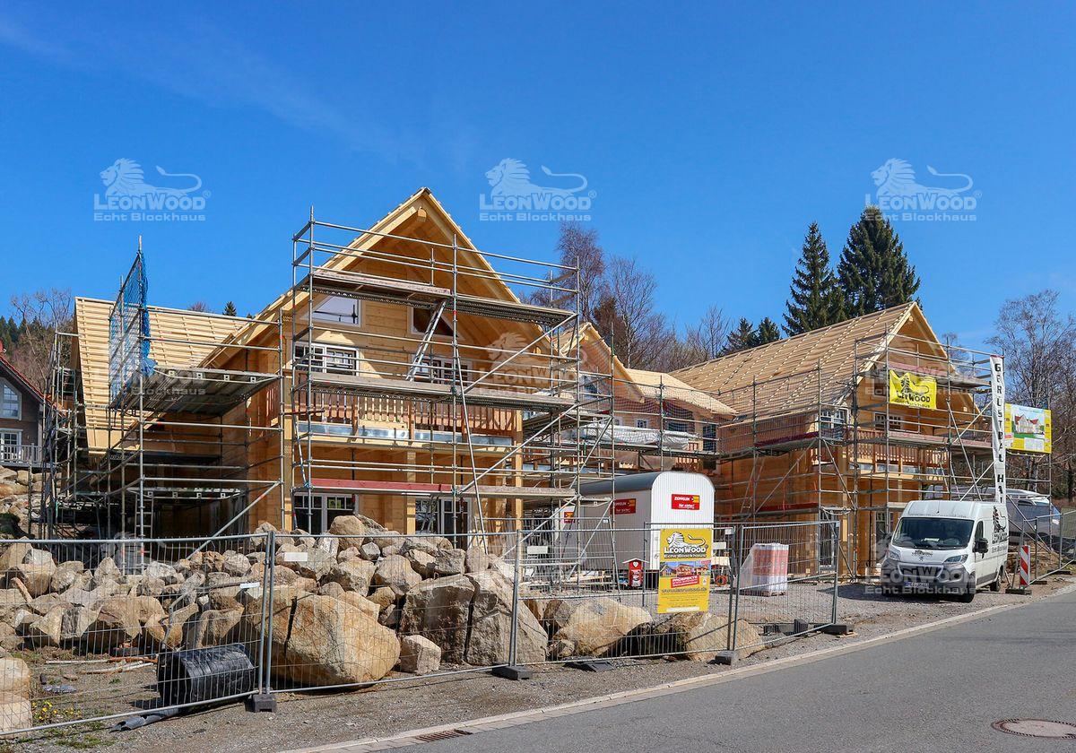 Hier sind große Visionäre am Werk: um den Harzer Ferienort Schierke um eine Attraktion reicher zu machen, entschieden sich die beiden Investoren Thomas Rader und Thorsten Rau (kurz Radau) für einen kombinierten, öffentlichen Blockhausbau. Das darin neu entstehende „Montevino“ soll ein Treffpunkt werden: eine italienische Schankwirtschaft, in der man authentisches Essen verzehren und südländische Weine genießen kann. Eine offene, freundliche Atmosphäre kann in den ca. 100m² großen Gastraum einziehen, der durch zahlreiche Fenstertüren erhellt wird. Auf der davor gelegenen Terrasse darf später auch gespeist werden. Verschiedene Personalräume, die Osteria-Küche sowie die sanitären Einrichtungen finden sich ebenfalls im Gaststättenkomplex wieder. Ergänzt wird das Restaurant durch insgesamt neun Ferienwohnungen, die „Bergwald Lofts“: drei Wohnungen im Erdgeschoss und weitere sechs im Obergeschoss, die über eine Außentreppe erreichbar sind. Jede der Wohnungen mit zirka 50m² Größe. Vier Wohnungen im Obergeschoss verfügen zusätzlich über einen Balkon sowie einen Schlafboden. Gäste können so direkt unter dem massiven und sakral, anmutenden Sparren-Pfettendachstuhl nächtigen. Die Wohnungen im Erdgeschoss werden durch Sonnenterrassen ergänzt. Die ganze Großbaustelle, die LéonWood® seit Anfang des Jahres realisiert, ist eine Klasse für sich: so ist schon der Baustoff Holz wohlüberlegt, ist der Harz doch ursprünglich eine Region für Holzfäller und Holzbearbeiter. Der Umfang der Großbaustelle in Schierke entspricht in etwa sechs bis sieben Einfamilienhäusern. Ganze fünf voll beladene Sattelschlepper mussten anrücken, um die massiven Fichtenstämme mit einer Masse von über 250 Kubikmeter zur Baustelle anzutransportieren. Damit ist das „Montevino“ der Radau GbR die derzeit wohl größte Blockhausbaustelle Deutschlands. Realisiert wurde der Gewerbebau mit der Wandausführung LéonBloc*, die aus 20 Zentimeter starken und massiven Fichtenbohlen besteht. Auf Grund der Stärke dieser Wandausführung ist keine weitere Dämmung notwendig. Holz, als atmungsaktiver und klimaregulierender Baustoff, kann im ganzen Haus wirken.