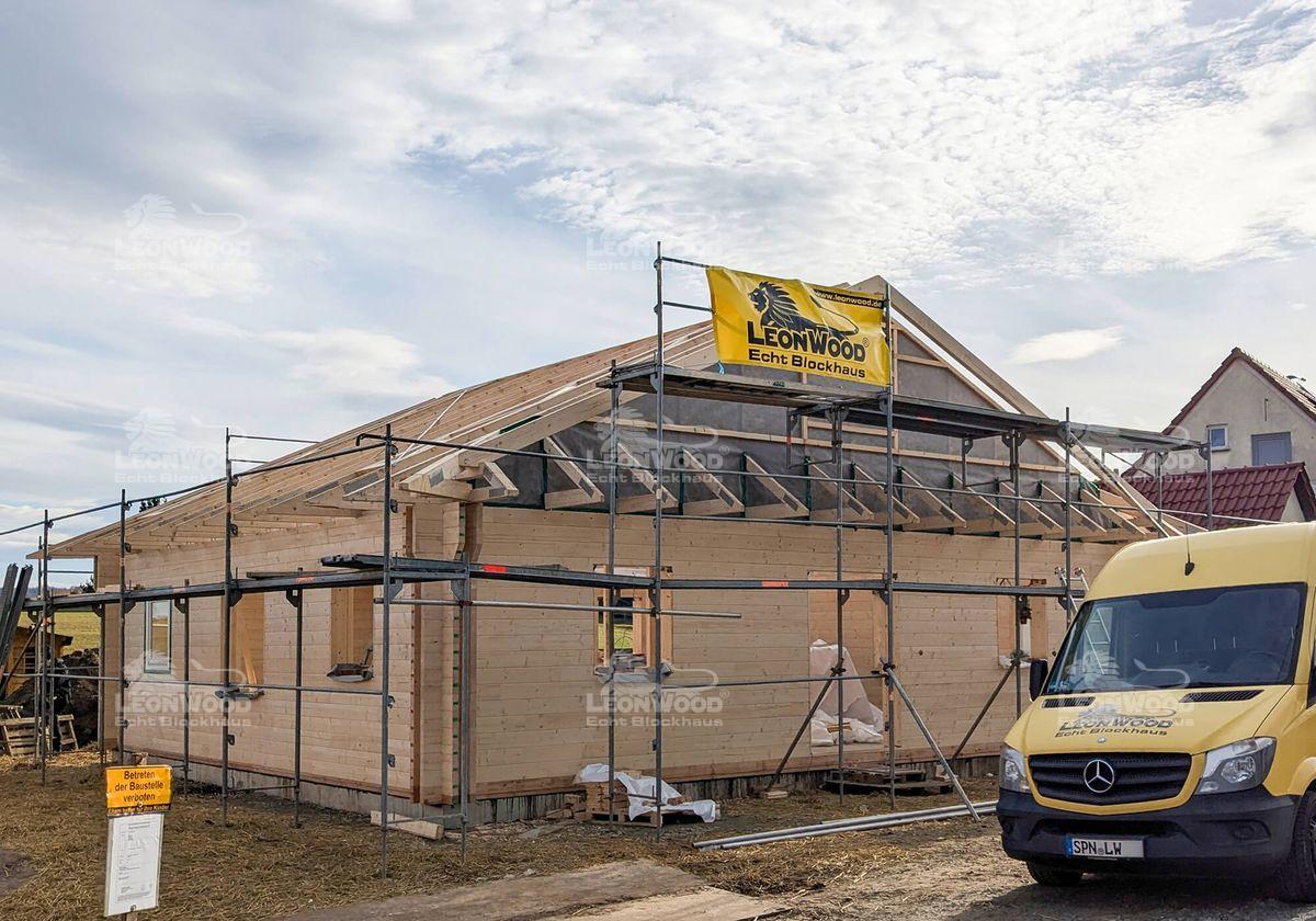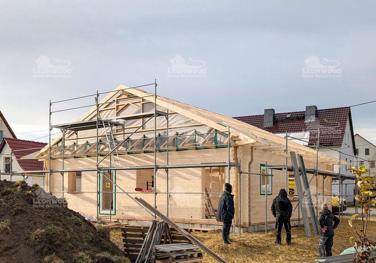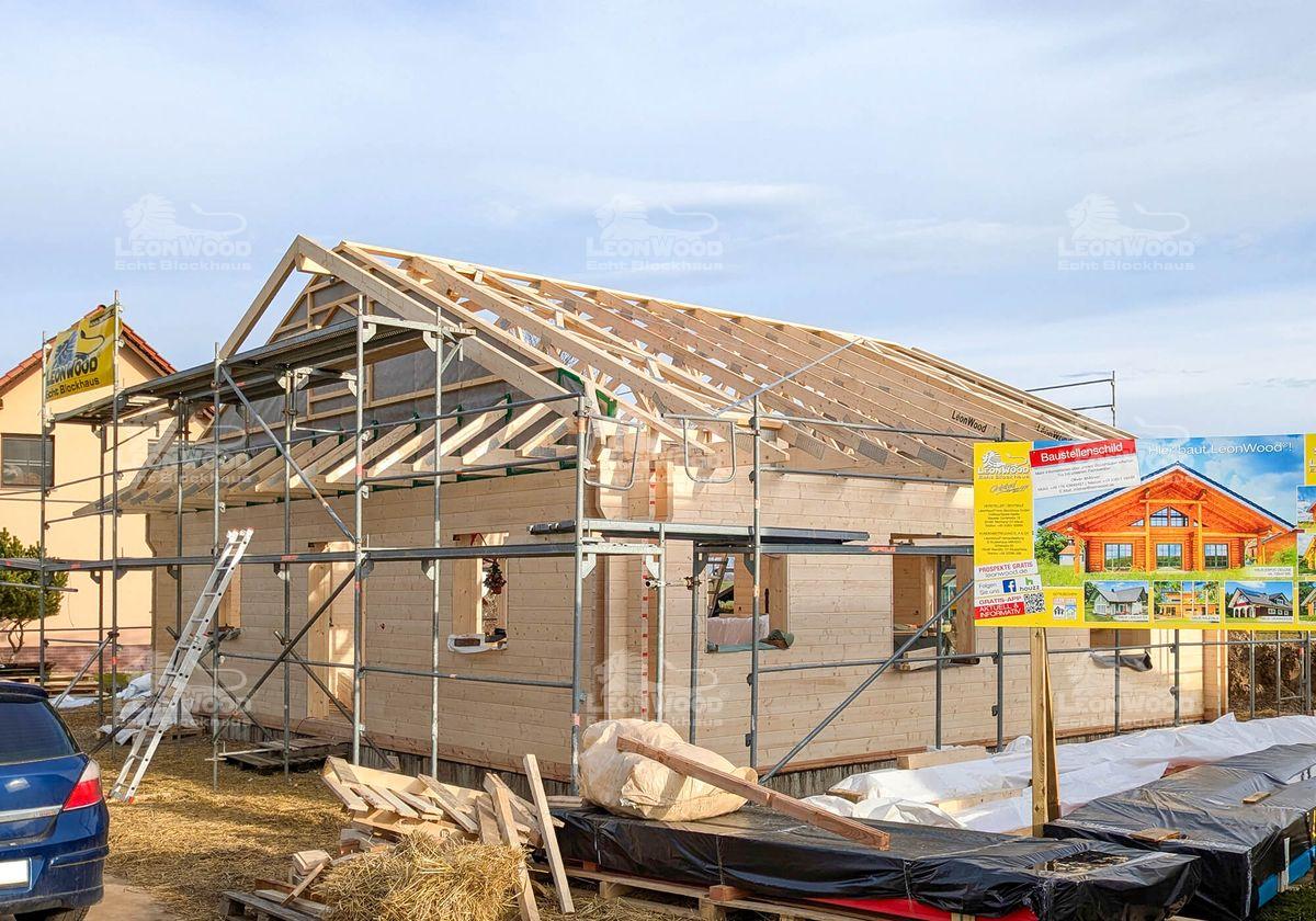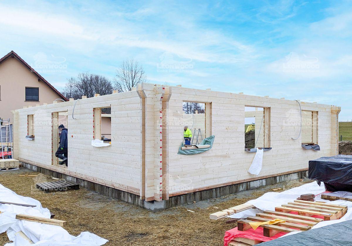 Dieses Massivholzhaus vom Typ „Victoria“ entsteht derzeit bei Görlitz in Sachsen. Es besticht durch seine ebenerdige Bungalowbauweise und einen großzügigen Grundriss von 11,50 x 10,00 m. Der Einsatz der hochwertigen BIO-Doppelwand DuoPlus* mit zwei massiven 68 mm Fichtenblockbohlen und einem 132 mm breiten Dämmstoffraum für Korkgranulat sorgt für hervorragende Isolierung und ein angenehmes Raumklima. Die Innenwände sind in Ständerbauweise ausgeführt und können somit individuell gestaltet werden. Unser Bauherr hat sich für eine Satteldachkonstruktion anstatt dem haustypischen Walmdach entschieden. Er erhält somit zusätzliche Lagerfläche im Dachboden. Die großen Dachüberstände bieten nicht nur konstruktiven Holzschutz, sondern tragen auch zur Langlebigkeit des Blockhauses bei.