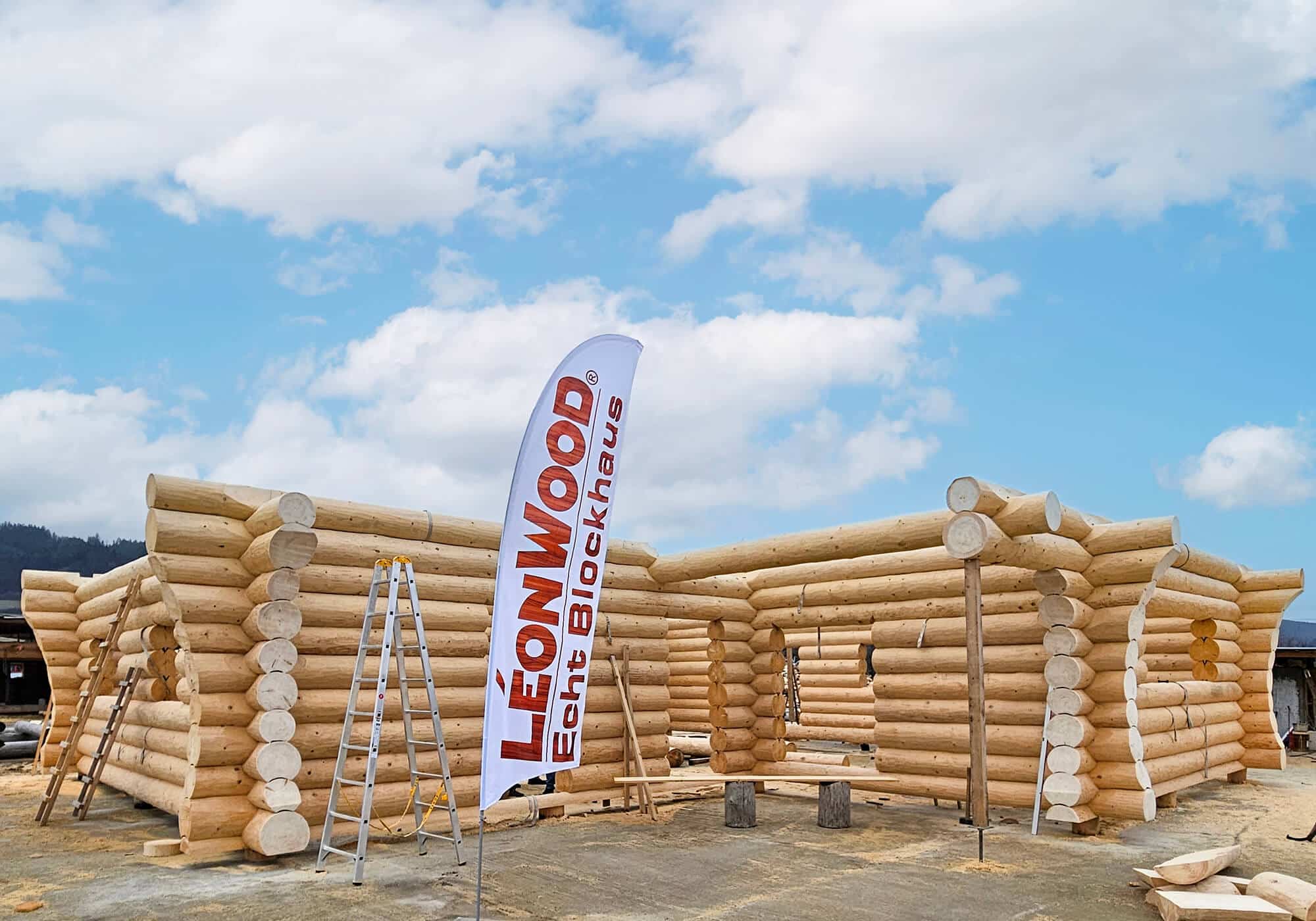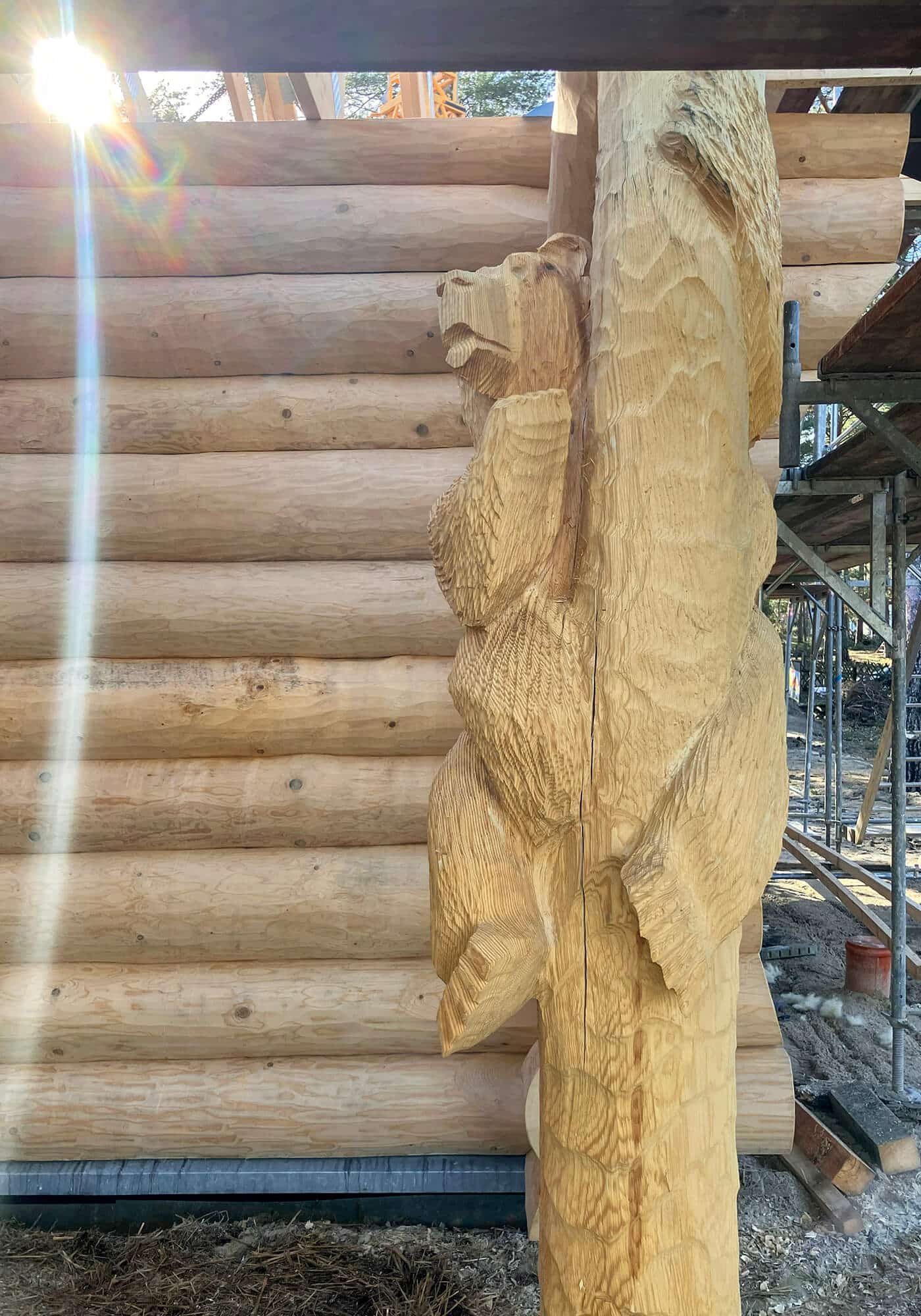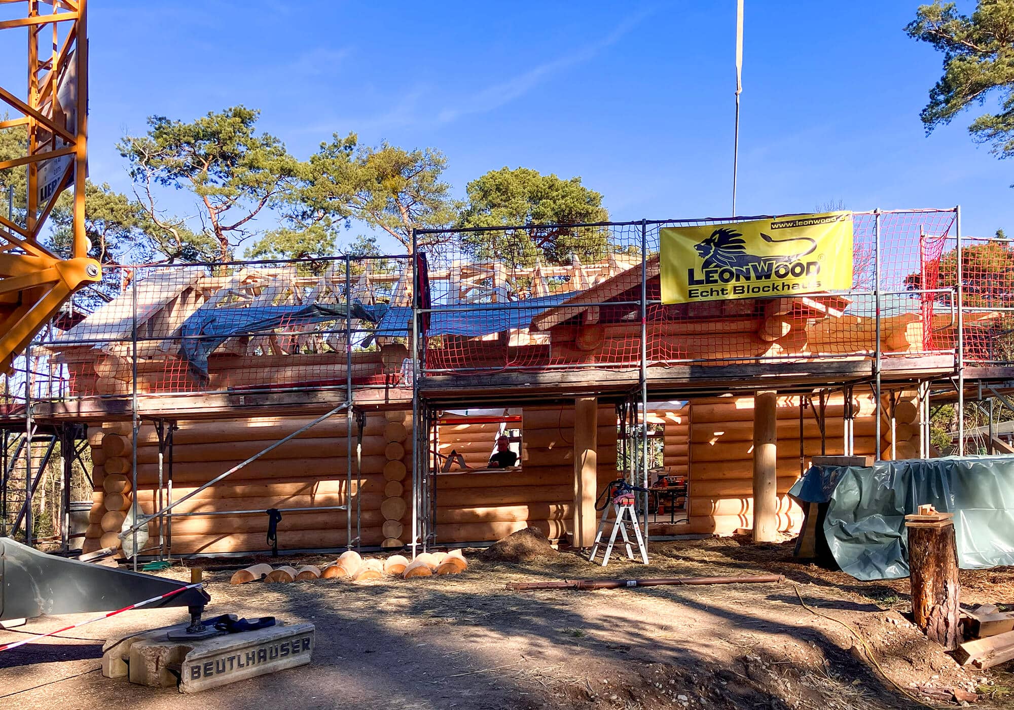 Im Landkreis Dahme Spreewald entsteht derzeit ein ganz besonderes Wohnhaus: ein Naturstammhaus vom Typ „Yukon Canada“ – ein ebenerdiger Winkelbungalow mit rund 120 m² Wohnfläche, gebaut aus weitgehend naturbelassenen Stämmen. Diese Bauweise gehört zur Königsklasse des Blockhausbaus, denn jedes Naturstammhaus ist ein echtes Unikat. Naturstammhäuser leben von der Individualität jedes einzelnen Stammes. Die Stämme werden lediglich entrindet, behauen und geschliffen, behalten aber ihre natürliche Form und Maserung. Damit alles perfekt ineinandergreift, wird das Haus zweimal gebaut: Erst im Werk, wo jeder Stamm millimetergenau angepasst wird. Auf der Baustelle findet der finale Aufbau statt. Hier erfolgt der Feinschliff. Dieser doppelte Bauprozess ist aufwendig, aber er schafft eine Wohnqualität, die ihresgleichen sucht: warm, ursprünglich und archaisch schön. Unsere Brandenburger Bauherren haben sich für einen Winkelbungalow entschieden, der im Innen- wie Außenbereich besondere Akzente setzt. Im geschützten Winkel des Hauses kann eine teilüberdachte Terrasse entstehen, die später zum Lieblingsplatz an warmen Tagen werden dürfte. Ein echter Blickfang ist der Stamm, der das Terrassendach trägt: Er wird von einer geschnitzten Bärenskulptur begleitet – der sogenannten Bärchensäule, die jedem Blockhaus eine persönliche Note verleiht. Auch im Inneren zeigt sich die Individualität des Hauses. Der großzügige Wohn Koch Essbereich erhält durch eine Scherenbinder-Konstruktion deutlich erhöhte Raumhöhen. Dadurch entsteht ein luftiges, offenes Ambiente, das perfekt zu den mächtigen Naturstämmen passt und dem Raum eine beeindruckende Großzügigkeit verleiht.