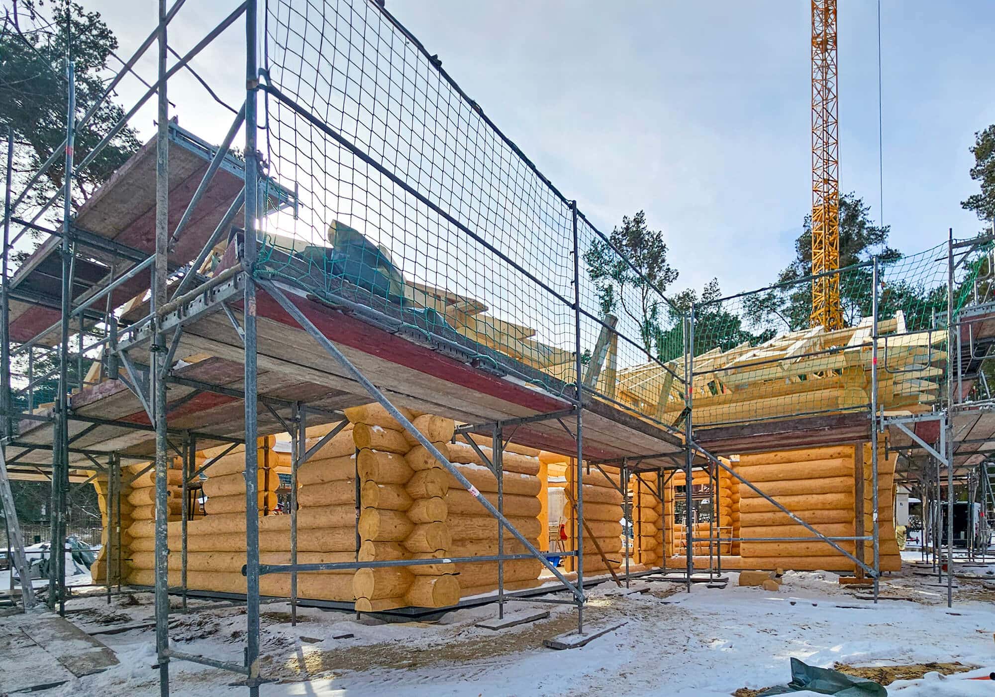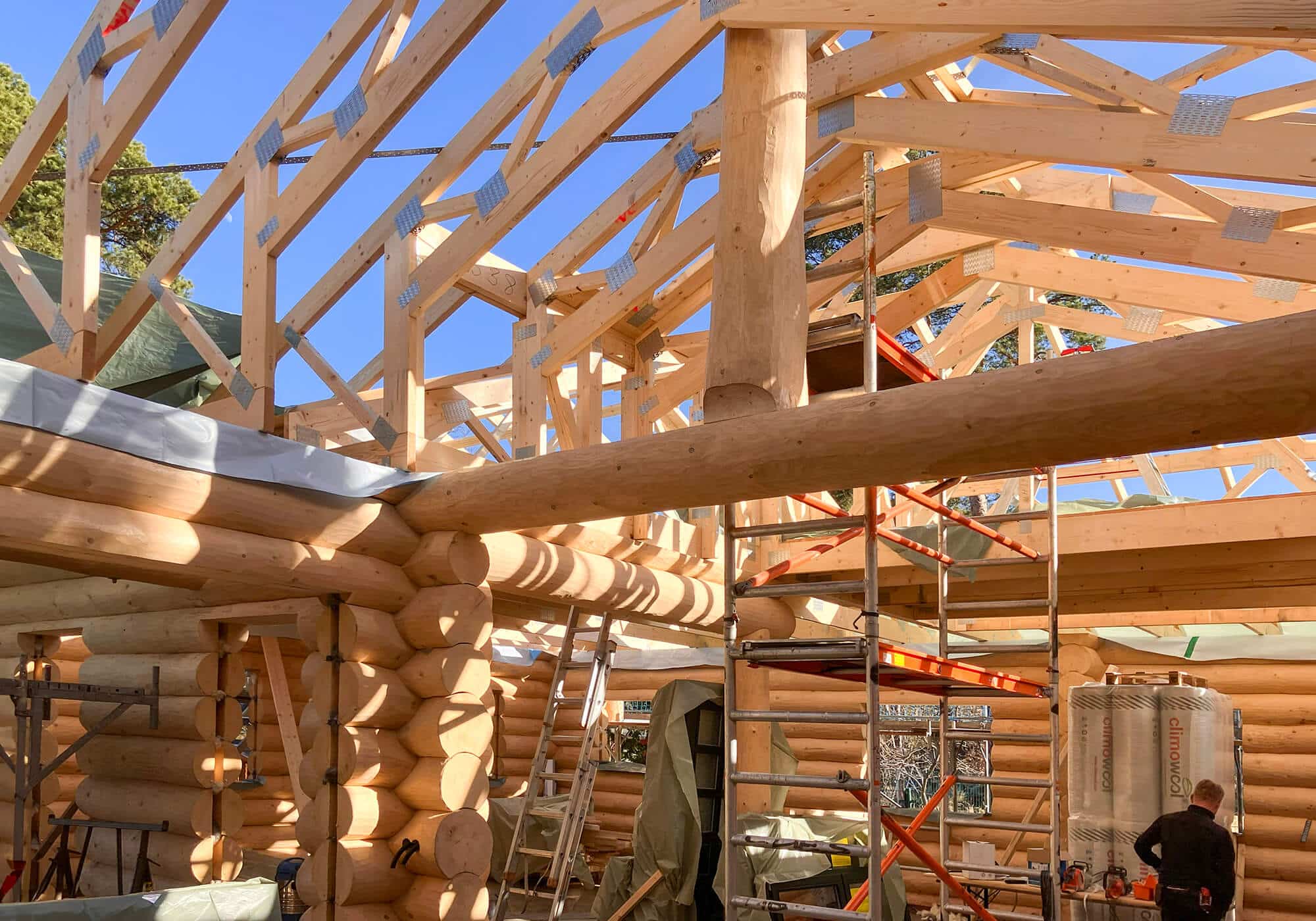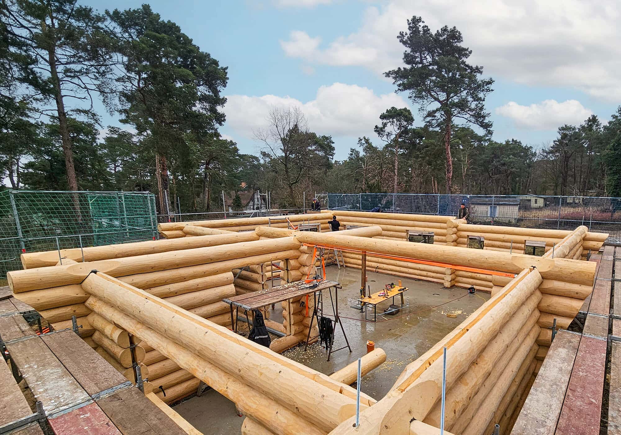 Im Landkreis Dahme Spreewald entsteht derzeit ein ganz besonderes Wohnhaus: ein Naturstammhaus vom Typ „Yukon Canada“ – ein ebenerdiger Winkelbungalow mit rund 120 m² Wohnfläche, gebaut aus weitgehend naturbelassenen Stämmen. Diese Bauweise gehört zur Königsklasse des Blockhausbaus, denn jedes Naturstammhaus ist ein echtes Unikat. Naturstammhäuser leben von der Individualität jedes einzelnen Stammes. Die Stämme werden lediglich entrindet, behauen und geschliffen, behalten aber ihre natürliche Form und Maserung. Damit alles perfekt ineinandergreift, wird das Haus zweimal gebaut: Erst im Werk, wo jeder Stamm millimetergenau angepasst wird. Auf der Baustelle findet der finale Aufbau statt. Hier erfolgt der Feinschliff. Dieser doppelte Bauprozess ist aufwendig, aber er schafft eine Wohnqualität, die ihresgleichen sucht: warm, ursprünglich und archaisch schön. Unsere Brandenburger Bauherren haben sich für einen Winkelbungalow entschieden, der im Innen- wie Außenbereich besondere Akzente setzt. Im geschützten Winkel des Hauses kann eine teilüberdachte Terrasse entstehen, die später zum Lieblingsplatz an warmen Tagen werden dürfte. Ein echter Blickfang ist der Stamm, der das Terrassendach trägt: Er wird von einer geschnitzten Bärenskulptur begleitet – der sogenannten Bärchensäule, die jedem Blockhaus eine persönliche Note verleiht. Auch im Inneren zeigt sich die Individualität des Hauses. Der großzügige Wohn Koch Essbereich erhält durch eine Scherenbinder-Konstruktion deutlich erhöhte Raumhöhen. Dadurch entsteht ein luftiges, offenes Ambiente, das perfekt zu den mächtigen Naturstämmen passt und dem Raum eine beeindruckende Großzügigkeit verleiht.