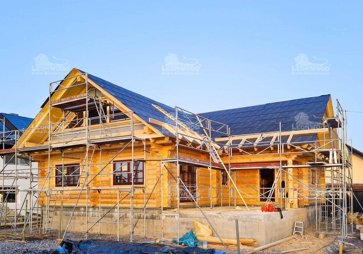 An der Donau, in der Nähe des Bayerischen Deggendorf, entsteht derzeit ein echter Holzhaus-Kracher. Unsere Bauherren haben sich für den LéonWood®-Haustypen „Canada“ entschieden und in kräftig auf ihre Bedürfnisse angepasst. Das Rundstammhaus wurde mit teilausgebautem Dachgeschoss realisiert. Durch eine zusätzliche Gaube können unsere Bauherren den Wohnraum im Obergeschoss noch erweitern. Im Erdgeschoss setzten zwei massive Naturstammstützen rustikale Akzente. Highlight ist der offene Galeriebereich, der die Blicke bis unter die sichtbare Dachstuhl-Konstruktion freigibt und für ein luftiges Raumgefühl im ganzen Haus sorgt. Natürliche Dämmstoffe in Fußboden und Innenwänden lassen das Haus auch ökologisch atmen. Insgesamt verfügt dieses Rundstammhaus über rund 200m² Wohnfläche.