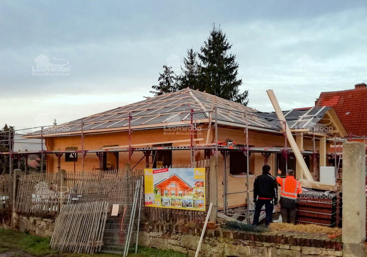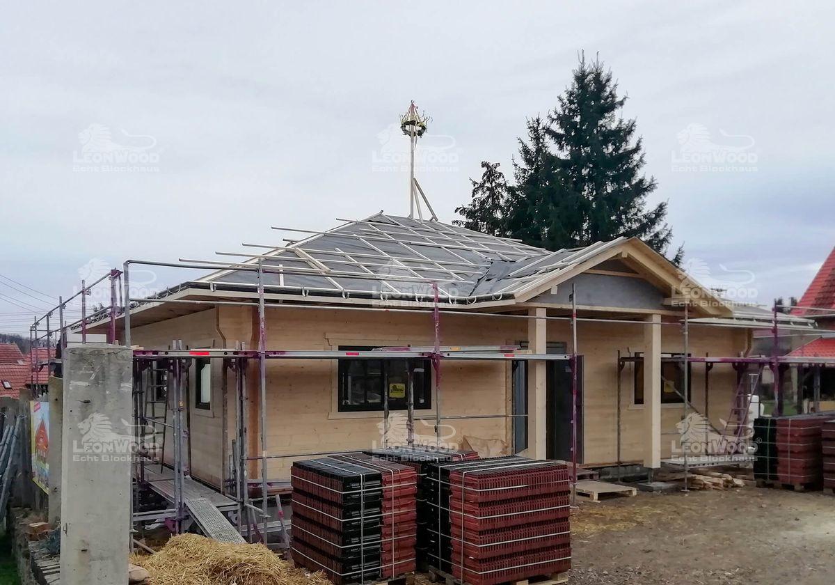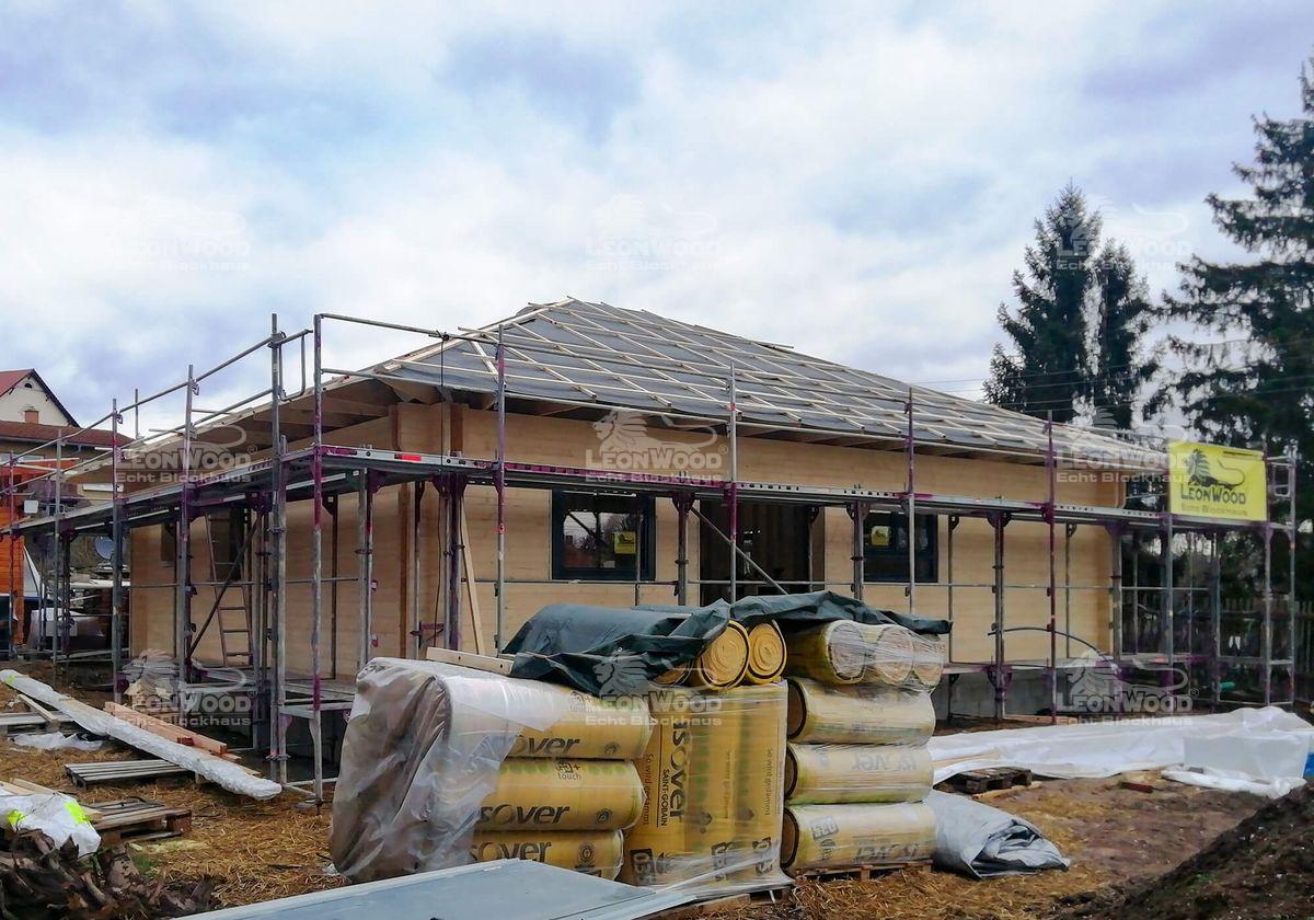 Bei Jena wird derzeit ein moderner Bungalow vom Typ „Victoria“ errichtet. Dieses klassische Walmdachhaus zeichnet sich durch eine schnörkellose Architektur aus und bietet ebenerdiges Wohnen mit einem minimalistischen Raumkonzept. Das Herzstück des Blockhauses ist ein großzügiger Wohn-Koch-Essbereich, der als Treffpunkt für die Familie dient. Natürlich steht auch bei diesem Projekt das ökologische und klimafreundliche Bauen im Vordergrund, denn der Bungalow wird mit der innovativen BIO-Doppelwand® von LéonWood® realisiert. Sie besteht aus geraden Bohlen und unterstreicht das straighte Antlitz des Hauses noch zusätzlich. Diese Bauweise kombiniert zwei parallel verlaufende Fichtenbohlen mit einem dazwischenliegenden Dämmstoffraum, der mit Korkgranulat gefüllt ist. Diese ökologische Dämmung sorgt für hervorragende Energieeffizienz und ist besonders umweltfreundlich. Die natürlichen Materialien sorgen darüber hinaus für das charakteristische gesunde Raumklima, auf das sich unsere Bauherren bereits jetzt freuen können. Auf rund 100m² Wohnfläche können sich die Bewohner demnächst ausleben. Der Bungalow „Victoria“ bietet somit ein harmonisches und ökologisch bewusstes Wohnerlebnis.