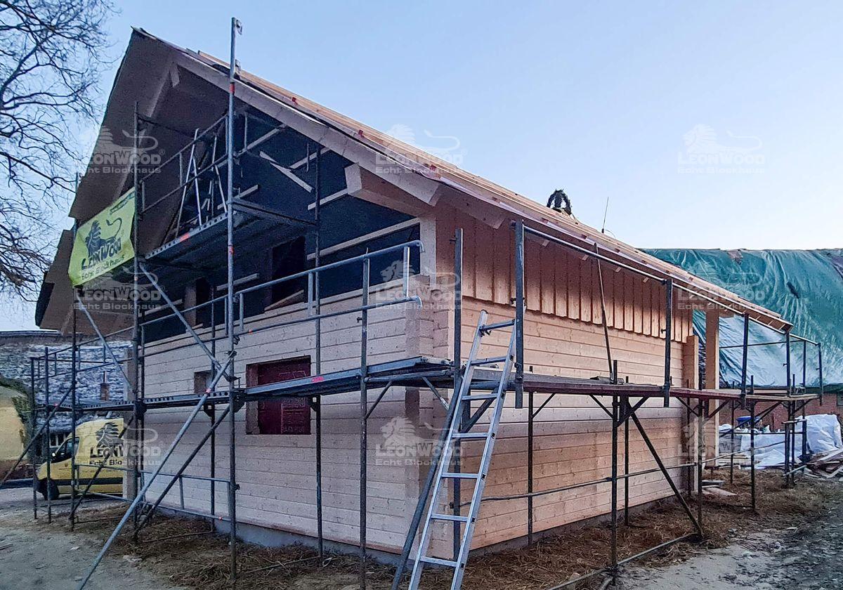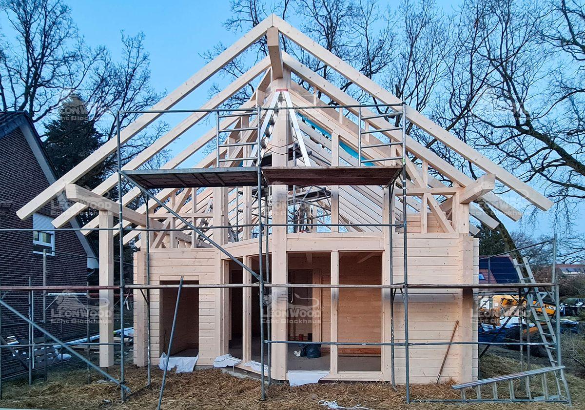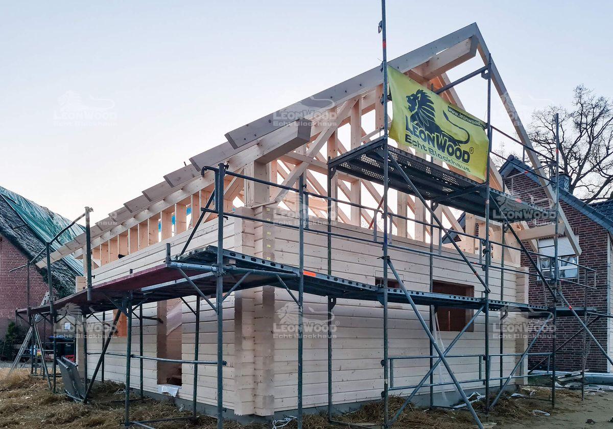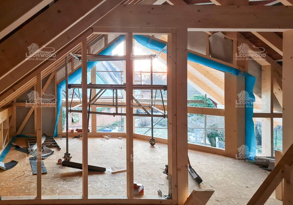 In der Nähe von Bremen entsteht derzeit ein Massivholzhaus vom Typ „Adria 100“, das trotz seiner etwas kleineren Grundfläche durch den großzügigen Kniestock deutlich an Höhe gewinnt. Besonders prägend für die Architektur ist eine der Giebelseiten, die mit einer großen Fensterfront bis hinauf zum First ausgestattet ist. Sie öffnet den Innenraum nach außen und lässt über den gesamten Tagesverlauf hinweg reichlich Licht ins Haus strömen. Unsere Bauherren haben sich als echte Holz-Enthusiasten erwiesen: Mit der Dickbalkenwand LéonBloc* wählen sie eine Wandvariante, die vollständig aus Holz besteht – innen wie außen. Dank einer Wandstärke von 20 Zentimetern ist keine zusätzliche Dämmung erforderlich, was die Konstruktion besonders klar und natürlich wirken lässt. Auch im Innenraum setzen die Bauherren auf massive Block-Innenwände, wodurch ein durchgehend warmes, holzbetontes Ambiente entsteht, das dem Haus seinen unverwechselbaren Charakter verleiht. Mit insgesamt rund 95 Quadratmetern Wohnfläche bietet das Massivholzhaus eine gemütliche, kompakte Wohnlösung, die durch ihre klare Formensprache und die konsequente Materialwahl überzeugt.