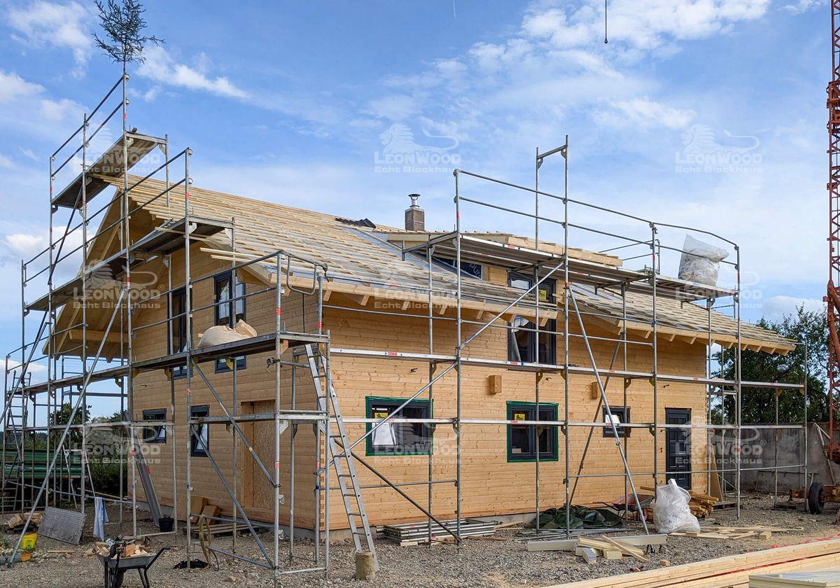 Das Blockbohlenhaus „Salzburger Land“ ist ein Haus im bayerischen Stil mit einem geradlinigen Aufbau und flachem Satteldach, dass durch zwei Gauben unterbrochen wird. Die breiten Giebelseiten und der hohe Kniestock wurden, wie das Erdgeschoss, mit der BIO-Doppelwand® realisiert. Die Bewohner profitieren auf beiden Etagen von den wohngesunden Eigenschaften der innovativen Wandvariante mit Korkdämmung. Der Dämmstoff Kork kommt auch beim Fußboden zum Einsatz (der sogenannten Polar-Fußboden). Unser Bauherr entscheidet sich damit für eine gänzlich trockene Fußbodenkonstruktion und kann so auf einen nassen Aufbau mit Estrich und lange Wartezeiten verzichten. Durch die hervorragenden, dämmenden Eigenschaften des Naturmaterials ist ihm zudem ein warmes Laufgefühl sicher. Generell ist das „Salzburger Land“ eines der größeren Blockhäuser von LéonWood®. Mit stattlichen 185m² richtet sich unser Bauherr so gleich zwei Wohneinheiten ein.