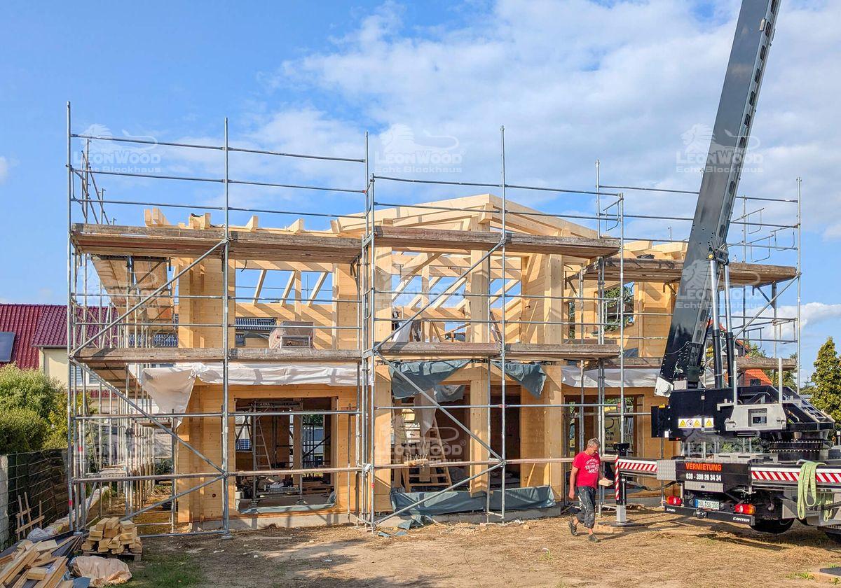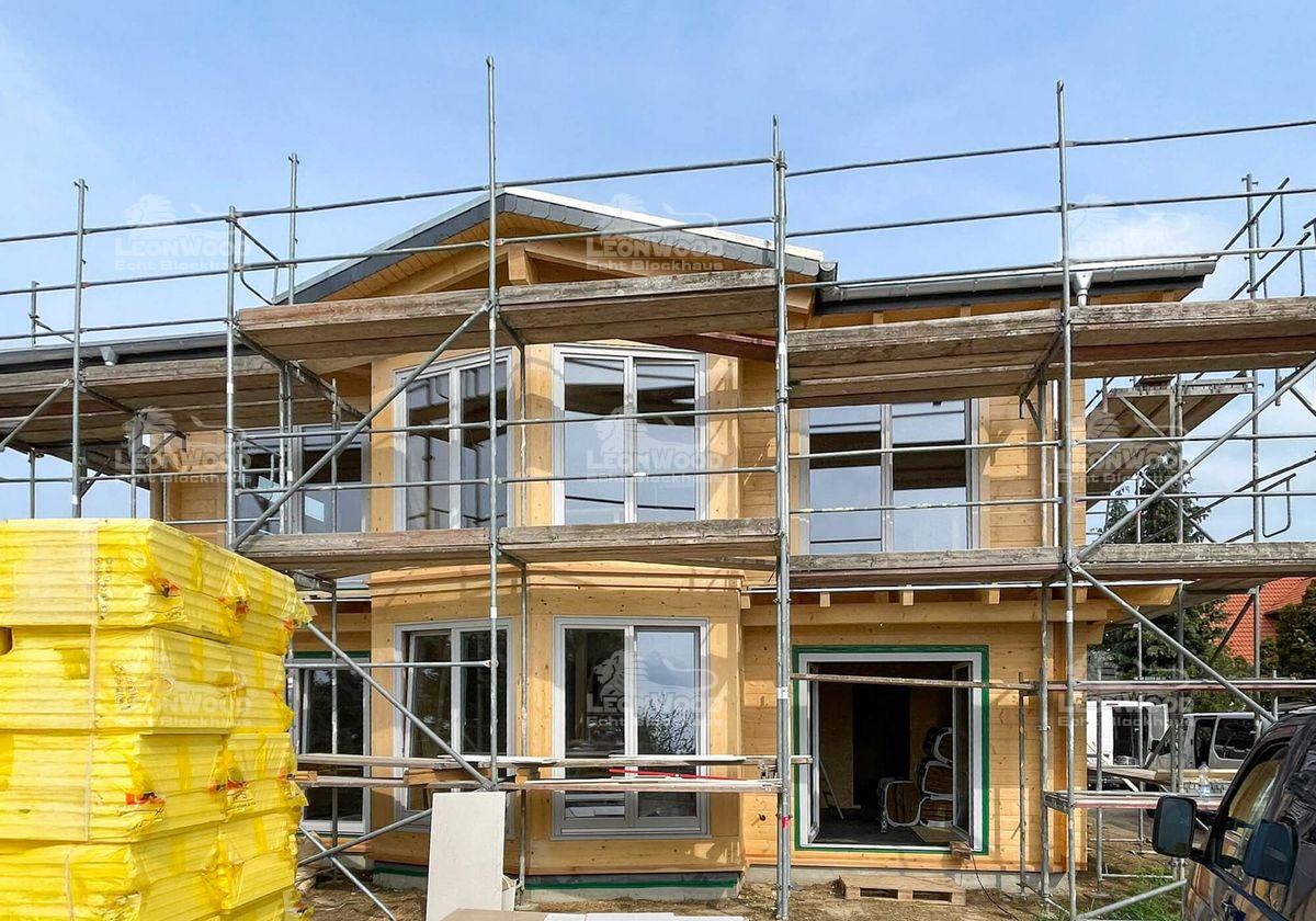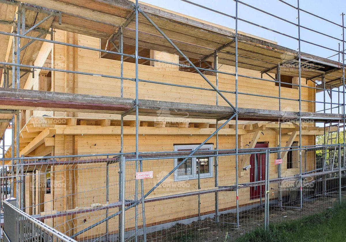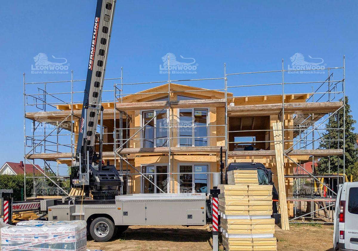 In der Nähe der brandenburgischen Landeshauptstadt Potsdam entsteht derzeit das Blockhaus „Villa Siena“, das mediterrane Eleganz mit nordischer Holzbaukunst vereint. Die zweigeschossige Stadtvilla wird nach den individuellen Wünschen unserer Bauherren gestaltet. Mit einer Grundfläche von 10 mal 11 Metern und einer Wohnfläche von über 190 Quadratmetern bietet das Haus großzügigen Raum für modernes Leben in natürlicher Umgebung. Besonders markant ist der verglaste Zwerchgiebel, den die Bauherren ihrem Entwurf hinzugefügt haben. Er durchflutet die Innenräume mit Tageslicht und verleiht dem Gebäude eine offene, lichtdurchflutete Atmosphäre. Die klare Linienführung und die umlaufende Attika unterstreichen den mediterranen Charakter. Die Konstruktion wurde mit der BIO-Doppelwand® von LéonWood® realisiert, bestehend aus zwei 68 mm starken Blockbohlen aus Fichte und einem 132 mm breiten Dämmstoffraum, der mit natürlichem Korkgranulat gefüllt ist. Diese Kombination sorgt für hervorragende Wärmedämmung und ein gesundes Raumklima. Auch bei Fenstern und Türen setzen die Bauherren auf Qualität und Individualität: Nadelholzrahmen mit dreifacher Wärmeschutzverglasung, Fenster ohne Sprossenkreuze, gerade Bekleidungsbretter und ein Sonderfarbton in Telegrau prägen das Erscheinungsbild. Die Hauseingangstür in Rubinrot setzt einen lebendigen Akzent und wird durch eine Überdachung ergänzt. Das Satteldach mit einer zarten Neigung von 8 Grad wird als Sparren-Pfetten-Dachstuhl ausgeführt. Die Dachkonstruktion bleibt im Innenraum sichtbar.