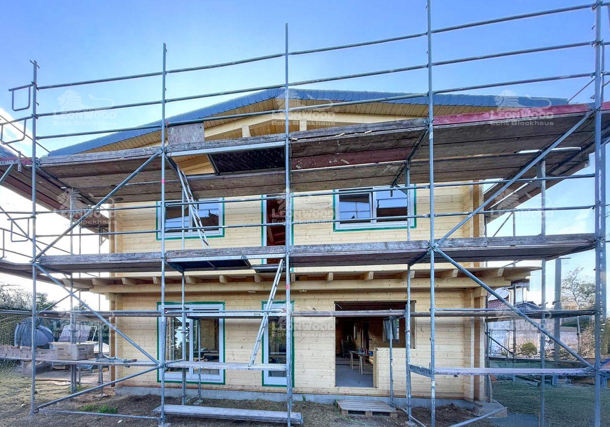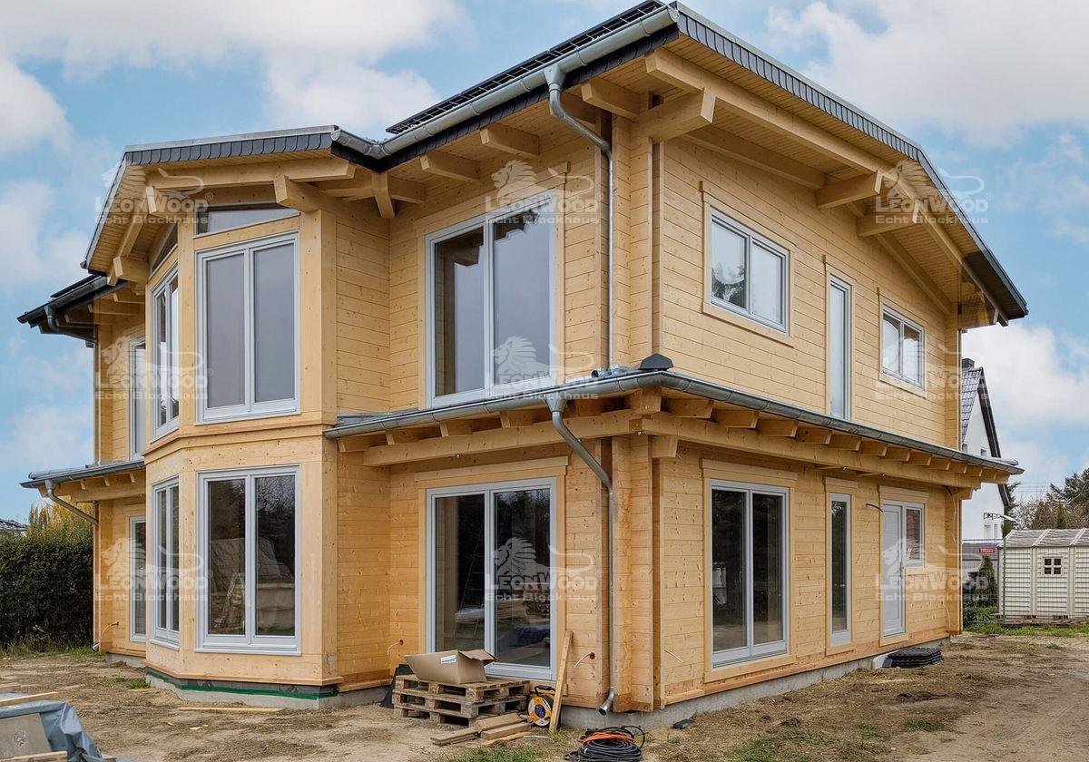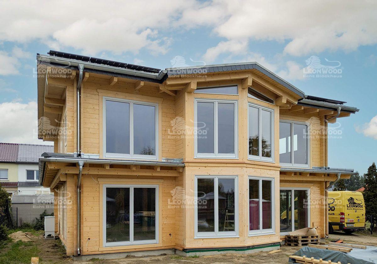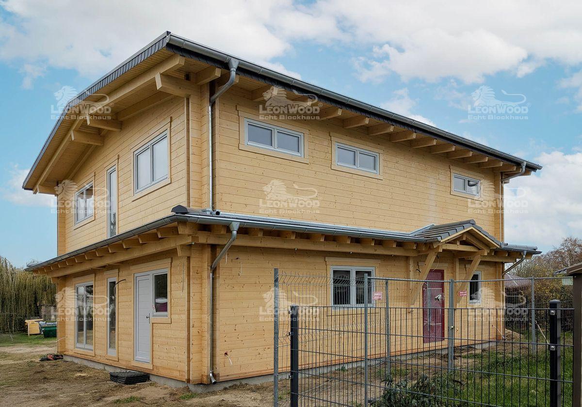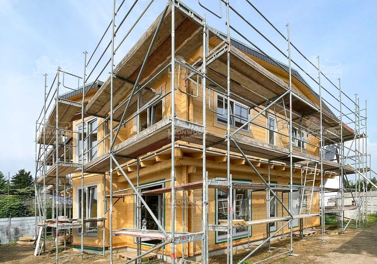 In der Nähe der brandenburgischen Landeshauptstadt Potsdam entsteht derzeit das Blockhaus „Villa Siena“, das mediterrane Eleganz mit nordischer Holzbaukunst vereint. Die zweigeschossige Stadtvilla wird nach den individuellen Wünschen unserer Bauherren gestaltet. Mit einer Grundfläche von 10 mal 11 Metern und einer Wohnfläche von über 190 Quadratmetern bietet das Haus großzügigen Raum für modernes Leben in natürlicher Umgebung. Besonders markant ist der verglaste Zwerchgiebel, den die Bauherren ihrem Entwurf hinzugefügt haben. Er durchflutet die Innenräume mit Tageslicht und verleiht dem Gebäude eine offene, lichtdurchflutete Atmosphäre. Die klare Linienführung und die umlaufende Attika unterstreichen den mediterranen Charakter. Die Konstruktion wurde mit der BIO-Doppelwand® von LéonWood® realisiert, bestehend aus zwei 68 mm starken Blockbohlen aus Fichte und einem 132 mm breiten Dämmstoffraum, der mit natürlichem Korkgranulat gefüllt ist. Diese Kombination sorgt für hervorragende Wärmedämmung und ein gesundes Raumklima. Auch bei Fenstern und Türen setzen die Bauherren auf Qualität und Individualität: Nadelholzrahmen mit dreifacher Wärmeschutzverglasung, Fenster ohne Sprossenkreuze, gerade Bekleidungsbretter und ein Sonderfarbton in Telegrau prägen das Erscheinungsbild. Die Hauseingangstür in Rubinrot setzt einen lebendigen Akzent und wird durch eine Überdachung ergänzt. Das Satteldach mit einer zarten Neigung von 8 Grad wird als Sparren-Pfetten-Dachstuhl ausgeführt. Die Dachkonstruktion bleibt im Innenraum sichtbar.