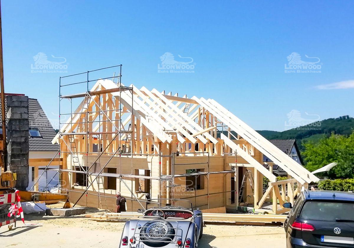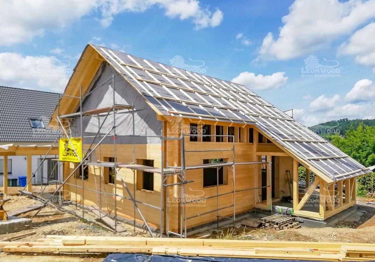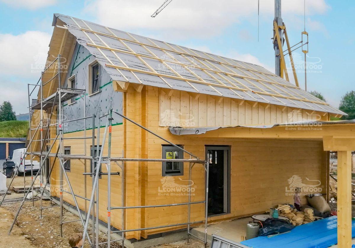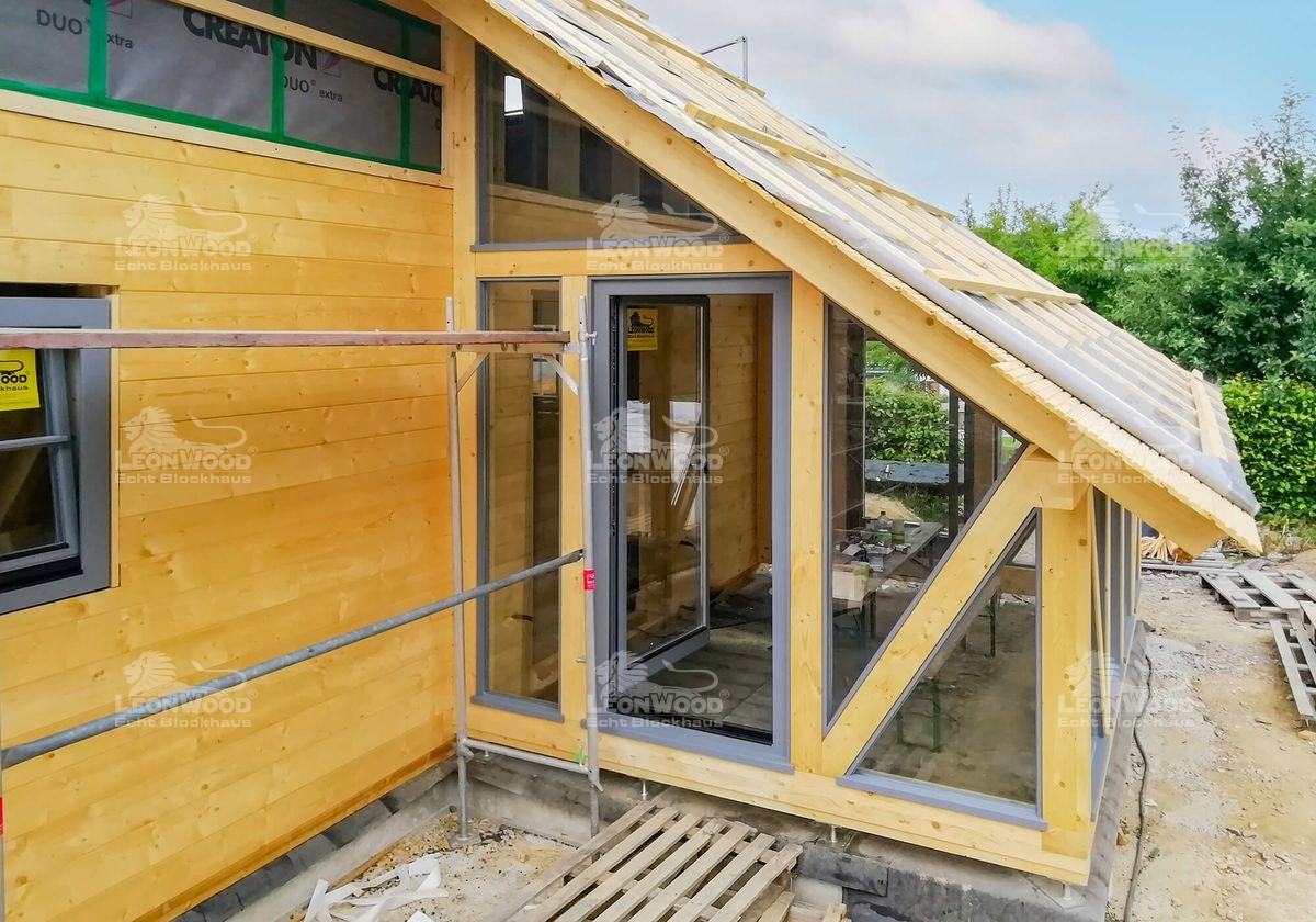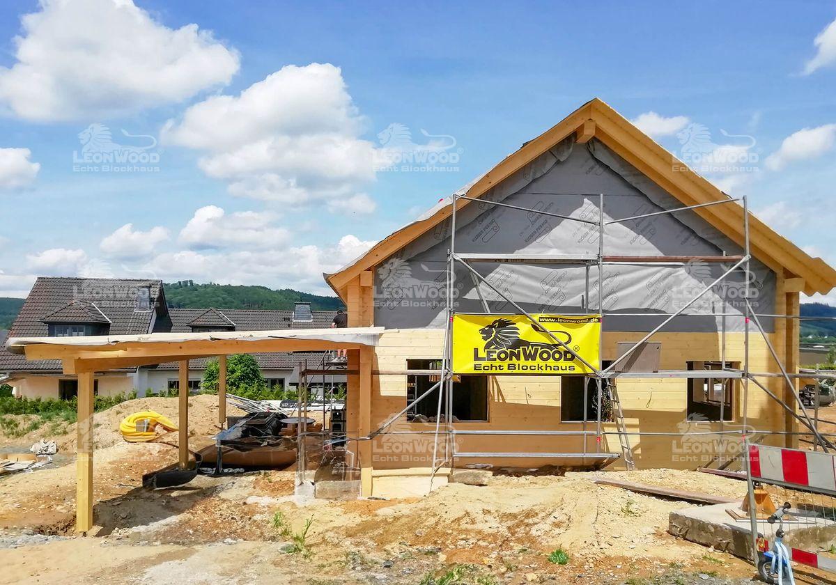 Ein kompaktes Haus mit dem Extra an Natürlichkeit: das Holzhaus „Spreeblick“ mit seiner rund 120m ² Wohnfläche ist das ideale Familiendomizil. Auf einer fast quadratischen Grundfläche finden sich alle Räumlichkeiten des täglichen Bedarfs. Auffällig ist das sehr ausgewogene Raumkonzept, denn alle Räume haben in etwa dieselbe Größe. Besonders ist der vollverglaste Wintergarten, der sich an den offen gestalteten Wohn-Koch-Bereich schmiegt und den Innen- mit dem Außenbereich verbindet. Die Natur ist so mitten im Haus! Mal abgesehen von den ohnehin schon ursprünglichen Baustoffen Holz und Kork. Unsere Bauherren aus dem Sauerland vervollständigen ihr Blockhaus mit einem Carport, der abgeschleppt direkt ans Haus konstruiert wurde und gleichzeitig als Hauseingangsüberdachung dient.