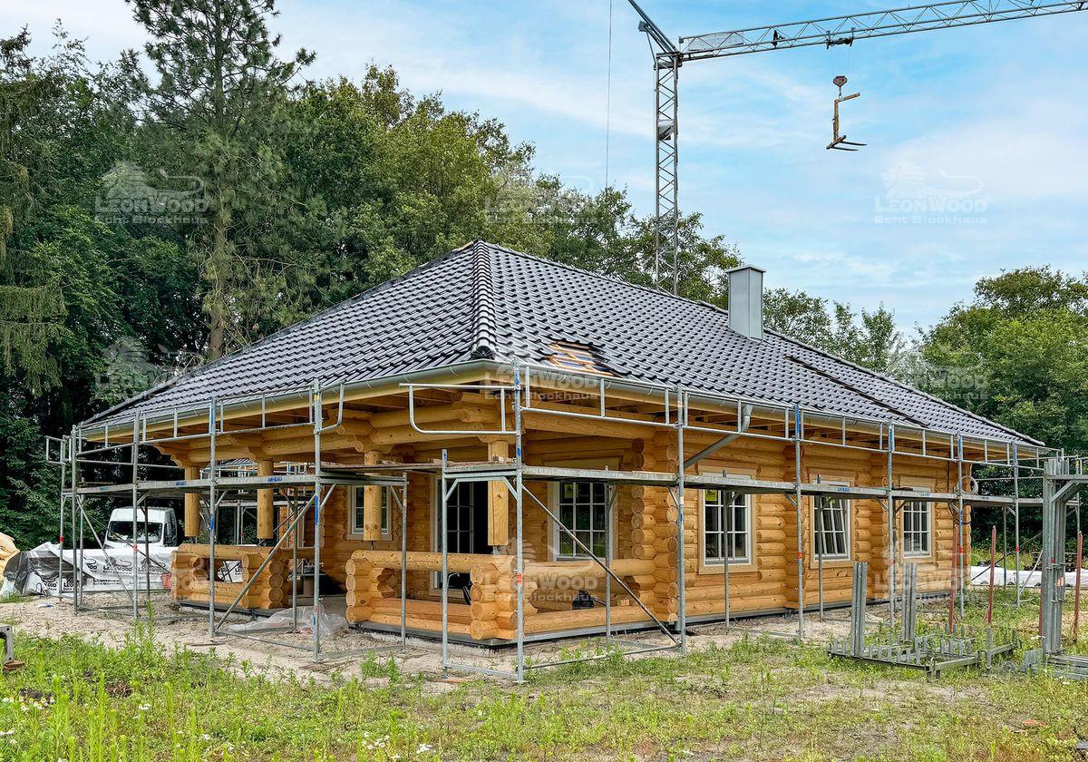 Hier wurde kräftig individualisiert. Unser Bauherr aus dem Emsland hat sich das Rundstammhaus „Elch“ zum Vorbild genommen und nach seinen Bedürfnissen und Vorstellungen angepasst. Eine große Garage wird direkt an das Haus realisiert. Sie besteht, wie das Haupthaus, aus der Rundstammwand NordicRound*. Haupthaus und Garage werden von einem gemeinsamen Walmdach bedeckt, wobei der Teil über dem Haupthaus vollständig ausgebaut wird und zusätzliche Nutzfläche bietet. Auch im Innenraum wird später der Baustoff Holz dominieren. Neben Rundstamm-Innenwänden, bestellt unser Bauherr auch alle Innentüren sowie eine Holzwangentreppe bei LéonWood®, natürlich alles aus Massivholz. Der Kork-gedämmte Polar-Fußboden wird später für ein wohliges Laufgefühl im ganzen Haus sorgen. Bei so viel Individualität wollte unser Bauherr auf eines allerdings nicht verzichten: die für den Haustypen „Elch“ typische, überdachte Terrasse mit massivem Rundbohlengeländer – der Hingucker des Rundstammhauses! Insgesamt stehen unserem freigeistigen Bauherren knapp 160m² Wohnfläche zur Verfügung.