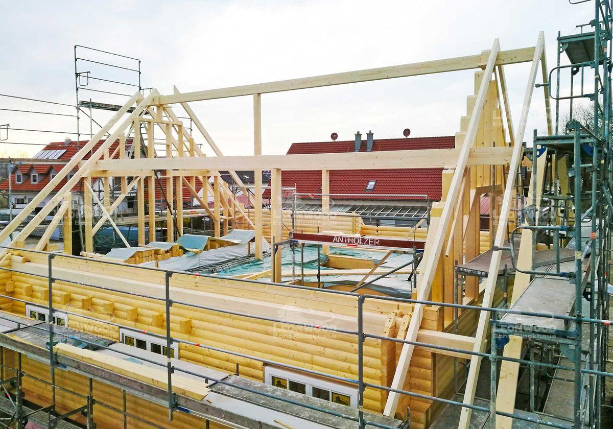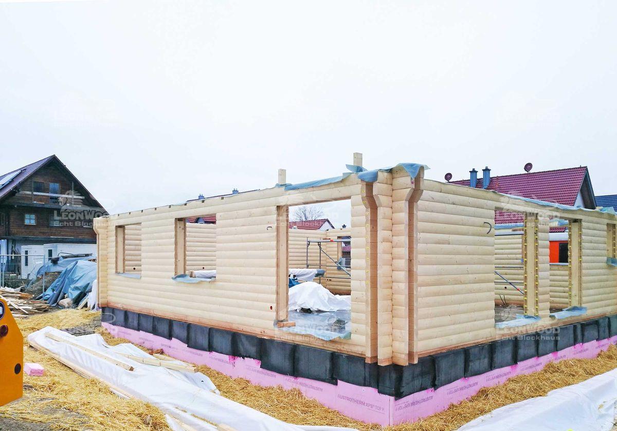 Das individuelle Bauen von Blockhäusern ist für uns bei LéonWood® kein Problem. Wir bieten unseren Bauherren eine kompetente Beratung und erstellen gemeinsam einen Plan fürs neue Zuhause. In Niederbayern ist jetzt ein Holzhaus mit klaren Linien entstanden. Der individuelle Neubau mit 170 m² Wohnfläche erstreckt sich auf zwei Etagen. Durch die BIO-Doppelwand DuoPlus* mit D-Profil wird eine Rundstammoptik erzeugt und die Natürlichkeit des Holzes nachempfunden. Das klassische Satteldach mit Sparren-Pfetten-Dachstuhl passt sich mit seiner 45° Neigung perfekt in die Architektur der Nachbarschaft ein. Die gläserne Giebelseite erzeugt einen modernen Stil und durchflutet die Galerie im Obergeschoss großzügig mit Tageslicht. Der offene Blick auf den Dachstuhl erzeugt einen hohen Raum und Luftigkeit im Haus. Wohngesunde baubiologische Materialien aus Holz, Hanf und Kork werden als Dämmmaterialien eingesetzt. Das Niedrigenergiehaus ist zusätzlich mit dem Polar-Fußboden von LéonWood® ausgestattet. Ein Carpot mit Geräteraum schließt sich direkt an das Haus an.
