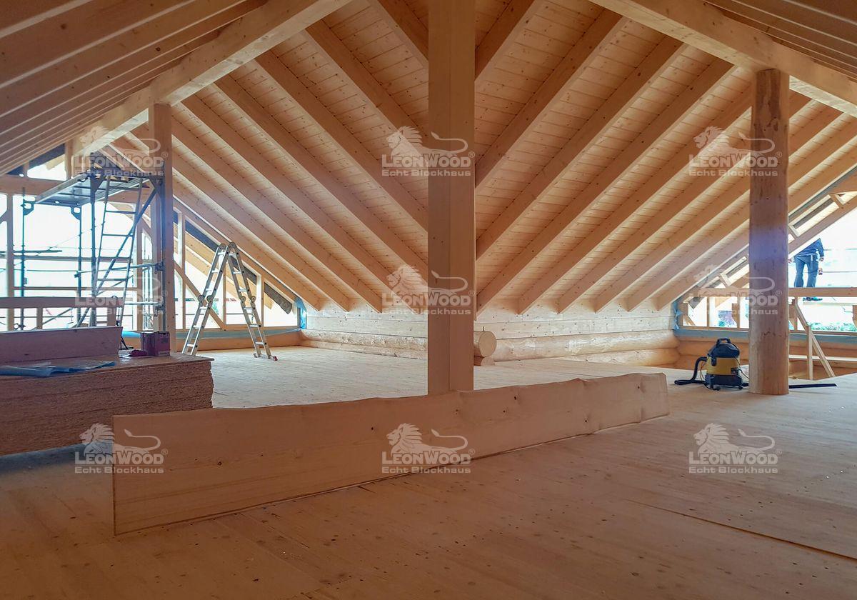 Spricht man von Holzhäusern, denkt ein Großteil sicher an die richtig dicken Stämme, die sich in unterschiedlichen Durchmessern übereinander und zu einem gewaltigen Koloss aus Holz auftürmen. So kennt man es aus Kanada und so prägte sich das Bild über Häuser dieser Bauweise. LéonWood® kann das auch! Als einer der wenigen deutschen Hersteller bietet der Blockhausbauer aus der Metropolregion Berlin/Brandenburg seinen Kunden ebenfalls die Naturstammbauweise an. Jedes Haus ist eine Maßanfertigung, jedes Haus ist ein Unikat. Die massiven Fichtenstämme werden nicht maschinell bearbeitet, sondern ausschließlich in Handarbeit behauen, geschält und geschliffen. Das Holz glänzt hier in seiner ursprünglichen Perfektion. Unsere Bauherrin aus Hessen hat sich den LéonWood®-Kundenliebling „Canada“ ausgeguckt, der als Naturstamm-Variante zum rustikalen Hingucker wird. Der Baustoff Holz spielt natürlich die Hauptrolle, wirkt der Naturstoff optisch nicht nur in den Außenwänden, sondern auch von Innen – als sichtbare Holzbalkendecke im Erdgeschoss bzw. als Sichtdachstuhl im Obergeschoss. Daneben hat sie sich für eine ökologische Dämmung aus Kork und Hanf entschieden, die maßgeblich zum gesunden Wohnraumklima beiträgt. Das rund 130m² große Erdgeschoss kann als komplett separate Wohnzone genutzt werden. Hier finden sich alle Räumlichkeiten des täglichen Bedarfs. Im über 70m² großen Obergeschoss sind dann ergänzende Zimmer realisiert worden, die gut und gerne für geschäftliche Zwecke genutzt werden können. Generell präsentiert sich der Wohnraum dieses „Yukon Canada“ hell und offen. Besonderes Schmankerl: ein Galeriebereich mit offenem Luftraum, der sich in eine der Giebelseiten schmiegt.