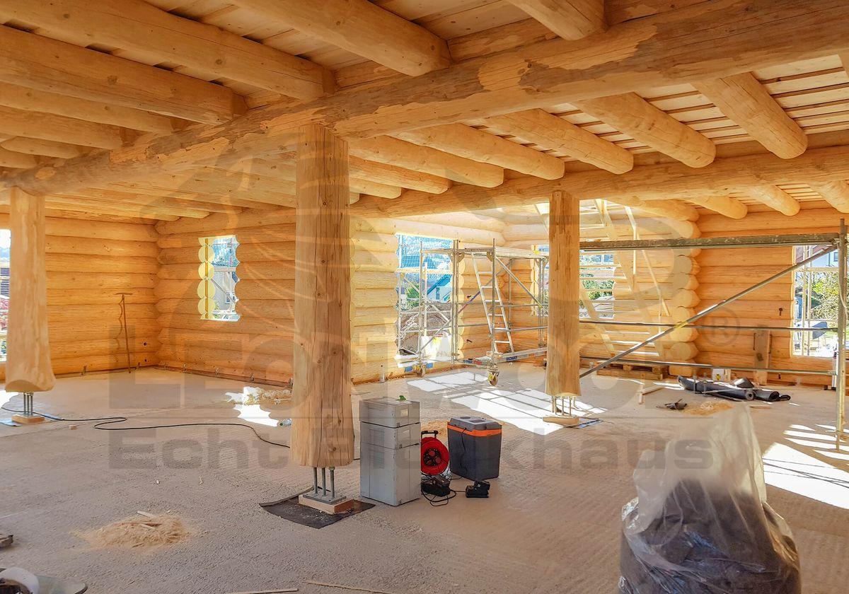 Sichtbare Holzbalkendecke als Naturstammvariante im EG;