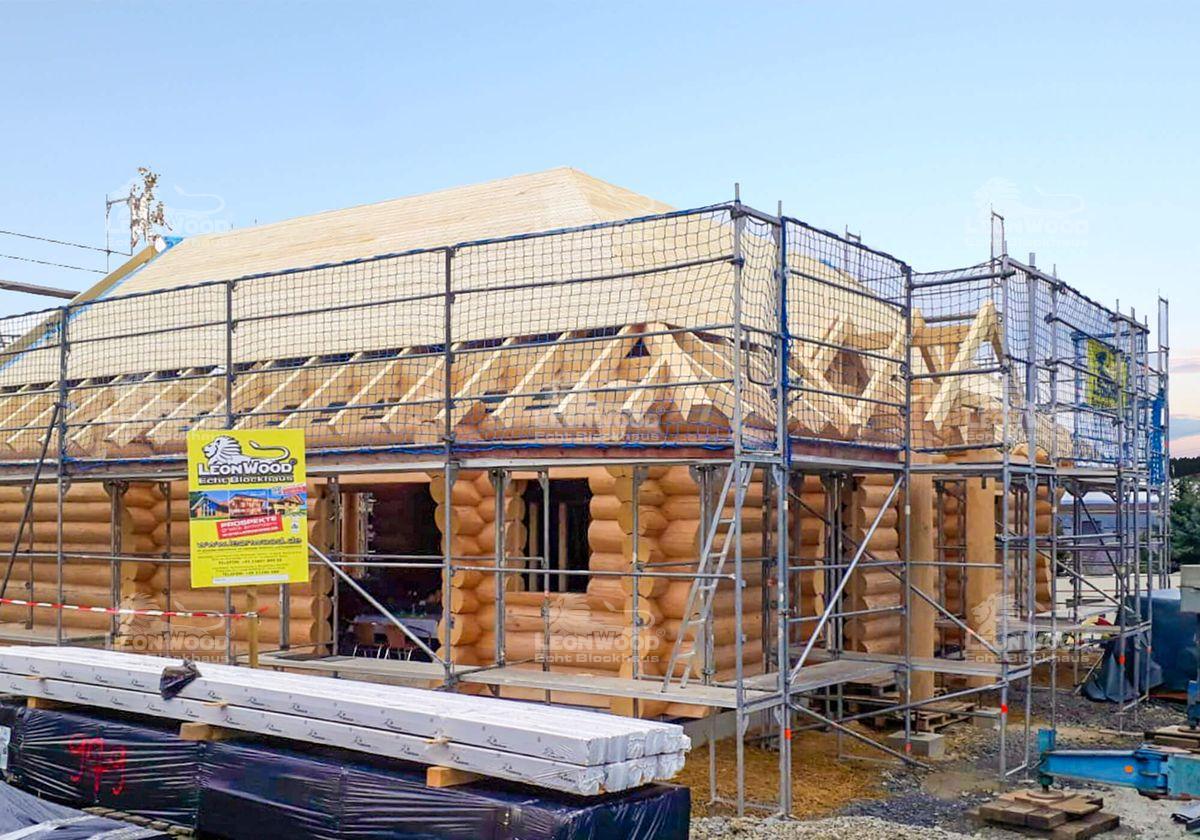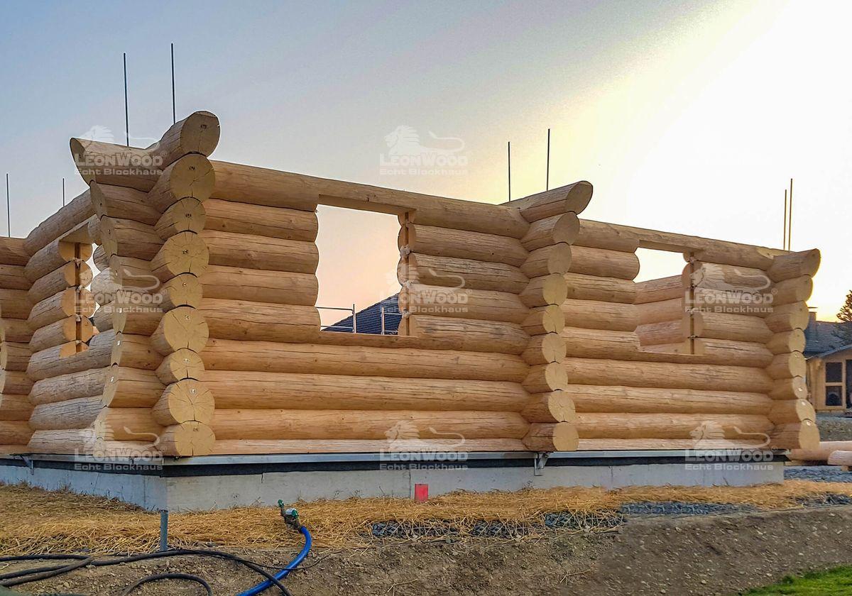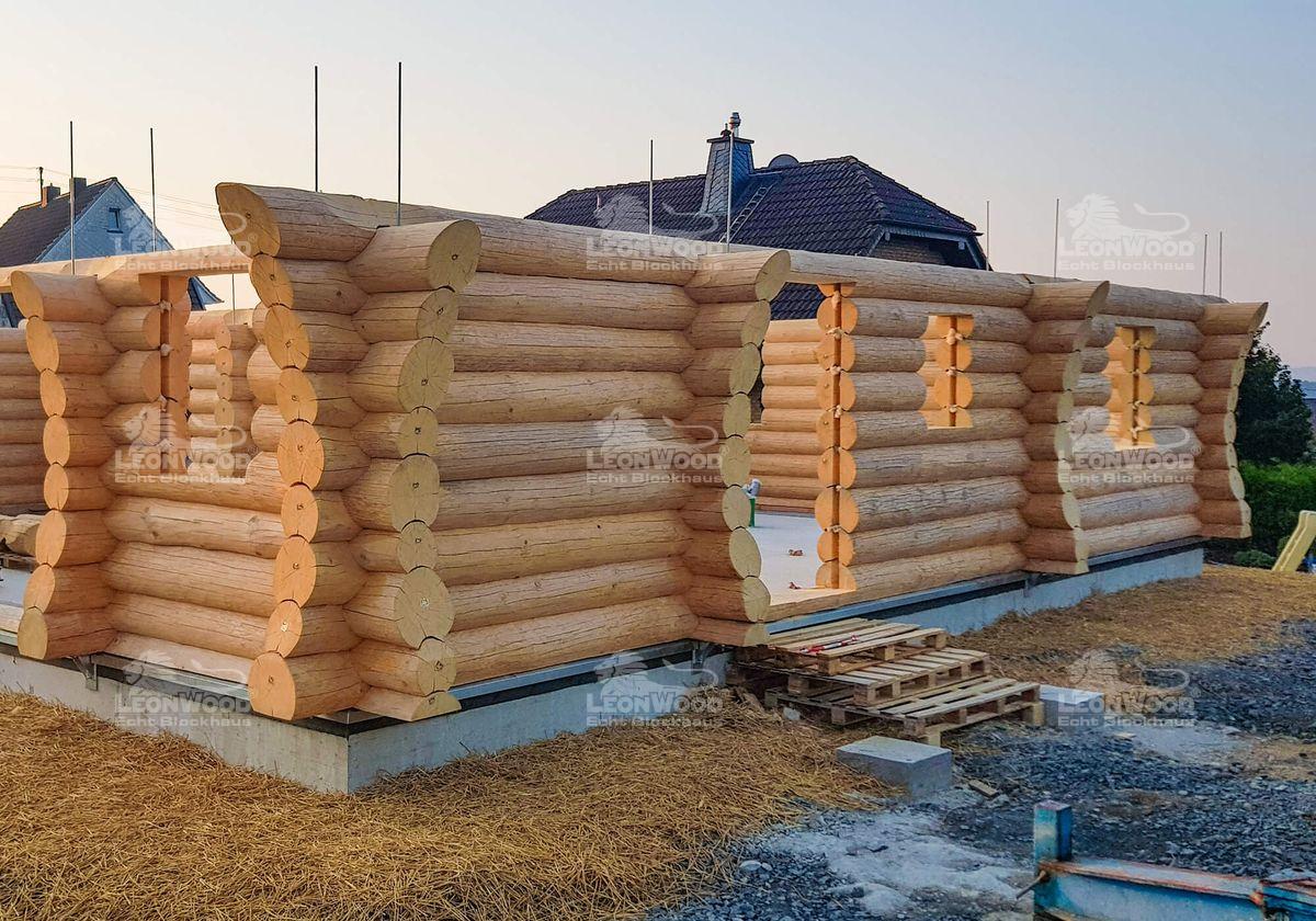 Unser Bauherr muss es wissen: bereits sein Vater ist stolzer Besitzer eines Naturstammhauses von LéonWood® und damit für ihn wohl das perfekte Referenzobjekt. Wie schon beim Vater entschied sich unser Bauherr mit Partnerin für das Winkelbungalow „Canada“, das vor allem wegen seiner Flexibilität und Wandelbarkeit der optimale Haustyp für viele Bauherren ist. Dieses Haus ist mit 195m² etwas größer als das der älteren Generation. Das Dachgeschoss ist vollständig ausgebaut und verfügt – wie beim elterlichen Holzhaus – über einen Galeriebereich. Zum Wohnbereich hin geöffnet, lässt er optische Weite spüren. Zwei Zimmer und ein Familienbad befinden sich in der oberen Etage. Das Erdgeschoss wartet dann mit einem fast 70m² großen Wohnzentrum auf. Kochen, Essen, Wohnen – alles läuft hier zusammen, alles ist hier eins. Ein HWR für die Haustechnik ergänzt das Untergeschoss genauso wie ein Büro, ein Dusch-WC und eine weiterer Abstellkammer. Im Winkel des Hauses kann eine teilüberdachte Terrasse entstehen. Zwei massive Naturstammstützen im Erdgeschoss haben nicht nur statische Funktion, sondern setzen gleichzeitig Akzente. Eine weitere Naturstammstütze befindet sich im Obergeschoss direkt über ihrem Pendant im Erdgeschoss. Der Blick gleitet automatisch an ihnen entlang und direkt zum Sichtdachstuhl hinauf. Naturstammhäuser sind aus vielerlei Hinsicht besonders: sie stehen für den Inbegriff von Natürlichkeit, weil es sich hier um echte Handarbeit handelt. Ein Naturstammhaus wird gleich zwei Mal gebaut: einmal im Werk zur Fertigung und dann erneut auf dem Grundstück des Bauherren.
