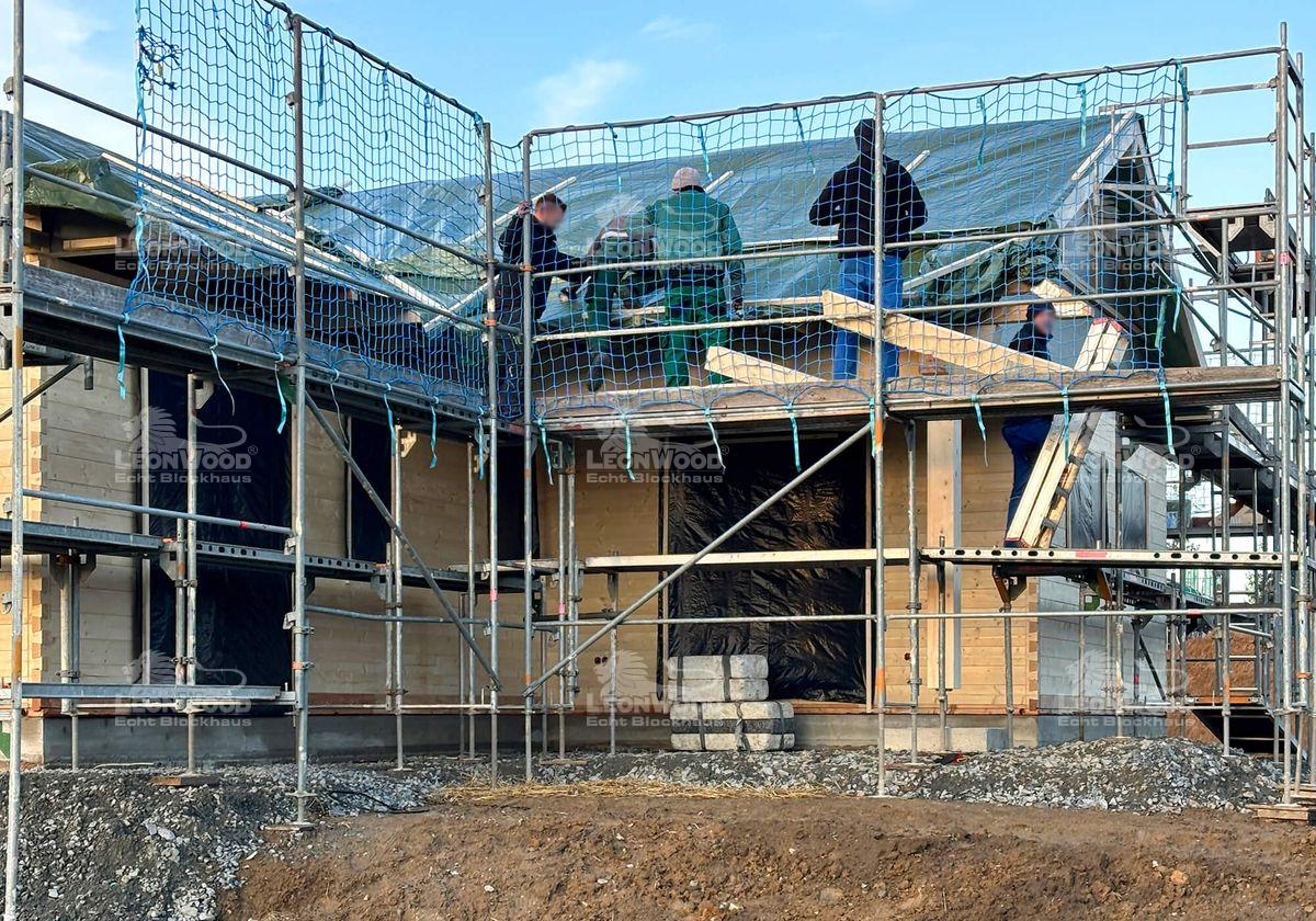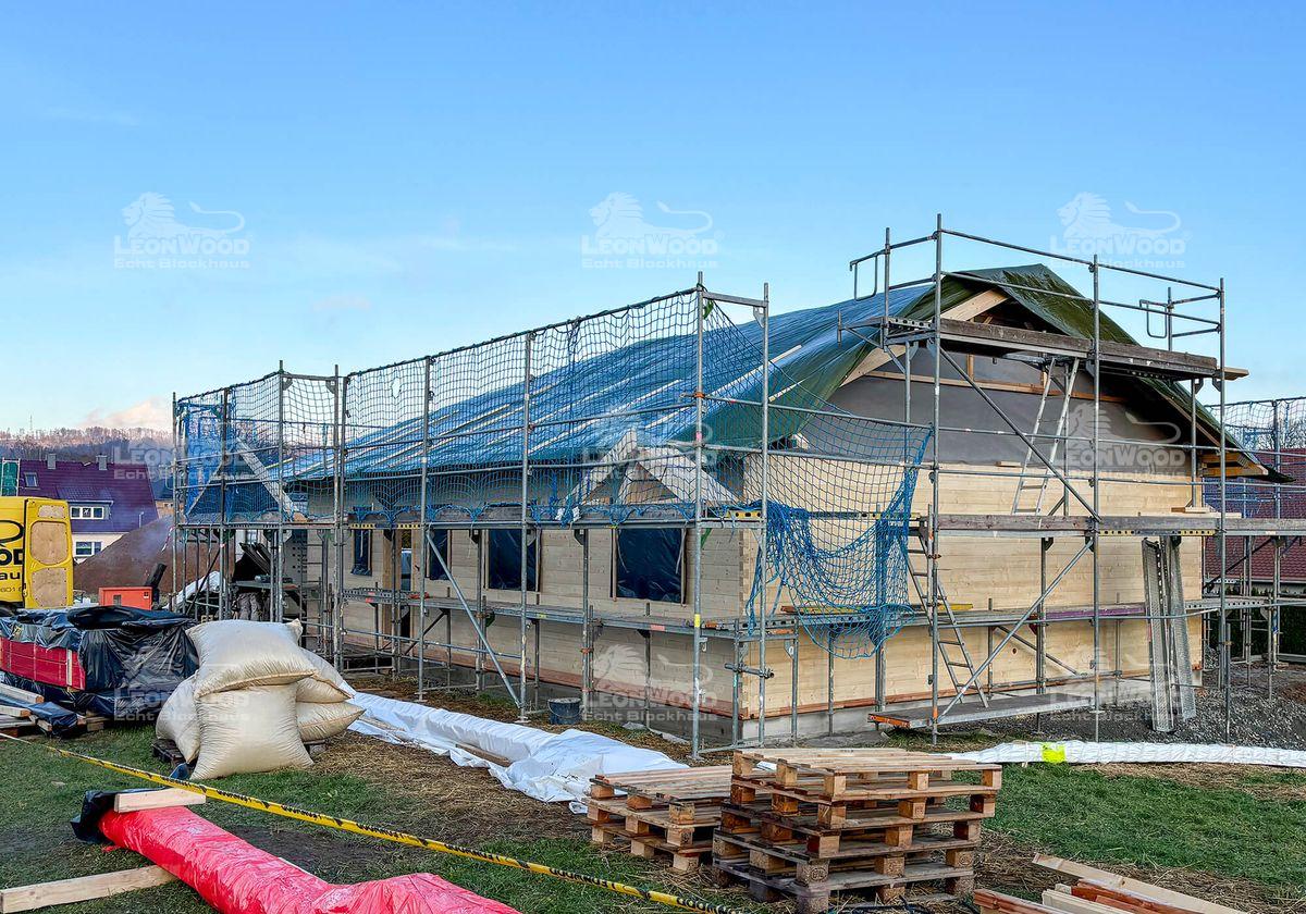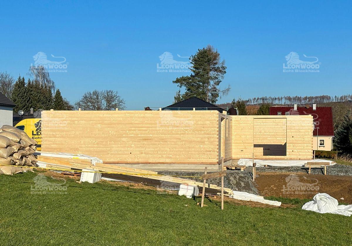 Kundenliebling „Canada“: auch unsere sächsischen Bauherren hat es dieses Blockhaus angetan. Sie realisieren sich den ebenerdigen Bungalow-Klassiker in die Nähe von Bautzen. Aber bei ihrem Eigenheim kommt keinesfalls Langeweile auf: sie entscheiden sich beispielsweise für die gerade Eckverbindung Tiroler Schloss, die einen straighten Look mit sich bringt, aber eine sehr alte, zimmermannsmäßige Verbindung ist. Weiße Fenster mit Sprossenkreuz fügen sich wunderbar in die Holzfassade ein. Hauseingangstür und Nebeneingangstür im Sonderfarbton Fernblau setzten dagegen bunte Akzente. Unter dem flachen Satteldach lassen sich im Dachboden bequem saisonale Dinge des Alltags verstauen. Die Giebel zieren anheimelnde Zitronenfenster. Unsere Bauherren können sich bald auf rund 120m² Wohnfläche ausleben.
