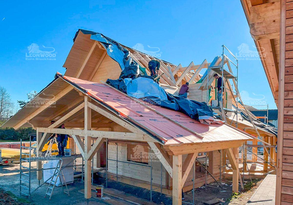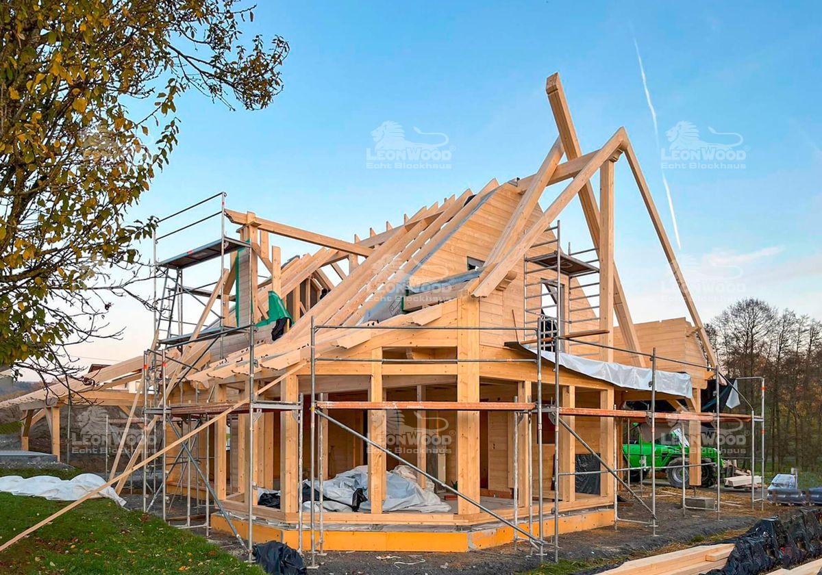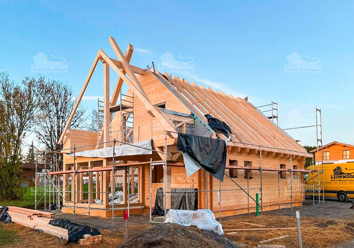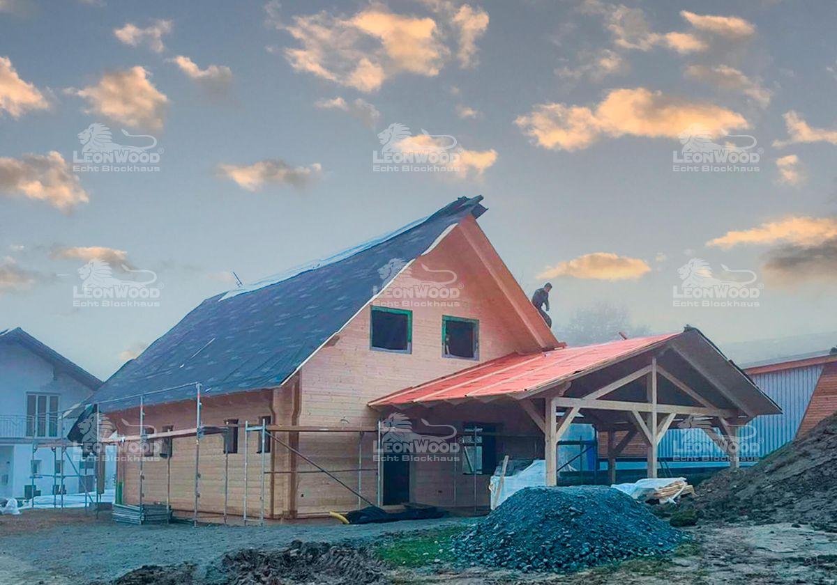 Unser Bauherr scheint ein wahrer Holz-Freund zu sein. Wo es optisch nur ging, hat er sich für den warmen Naturstoff Holz entschieden. Neben der äußeren Hülle bestehen auch die Innenwände im Erdgeschoss aus Massivholz. Giebel, Gaube, Kniestock sowie Innenwände im Obergeschoss sind zwar als Ständerkonstruktion realisiert, der Optik wegen verschalt unser bayerischer Bauherr all diese Elemente aber mit massiven Blockbohlen oder mit Blockpaneel. Alles wirkt so wunderbar homogen und aus einem Guss. Typisch für den hier gebauten Haustypen „Alicante“ ist der vollverglaste Wintergarten mit darüber befindlichem Balkon. In diesem Fall wurde letzterer aus konstruktiven Gründen vergrößert. Das Geländer steuert unser Bauherr selbst bei. Highlight im Innenraum ist der nach Kundenwunsch konstruierte Galeriebereich mit offenem Luftraum über dem Wohnbereich. Hier ist die Freiheit zur individuellen Selbstentfaltung leicht spürbar. Ein angeschlossener Doppelcarport vervollständigt das Gebäude-Ensemble. Unser Bauherr verfügt über rund 150m² Entfaltungsfläche.