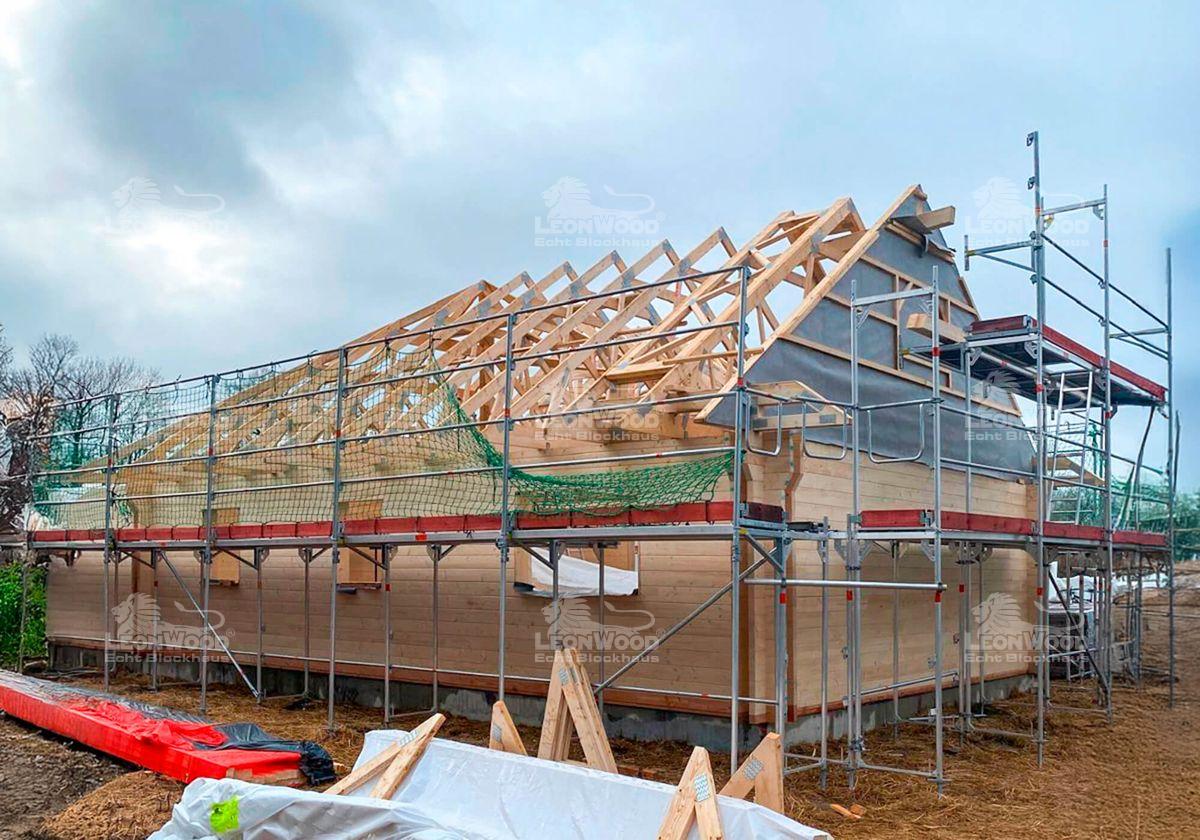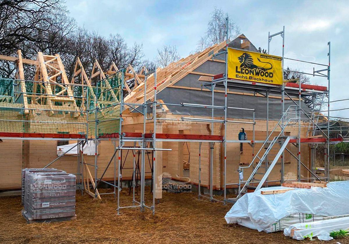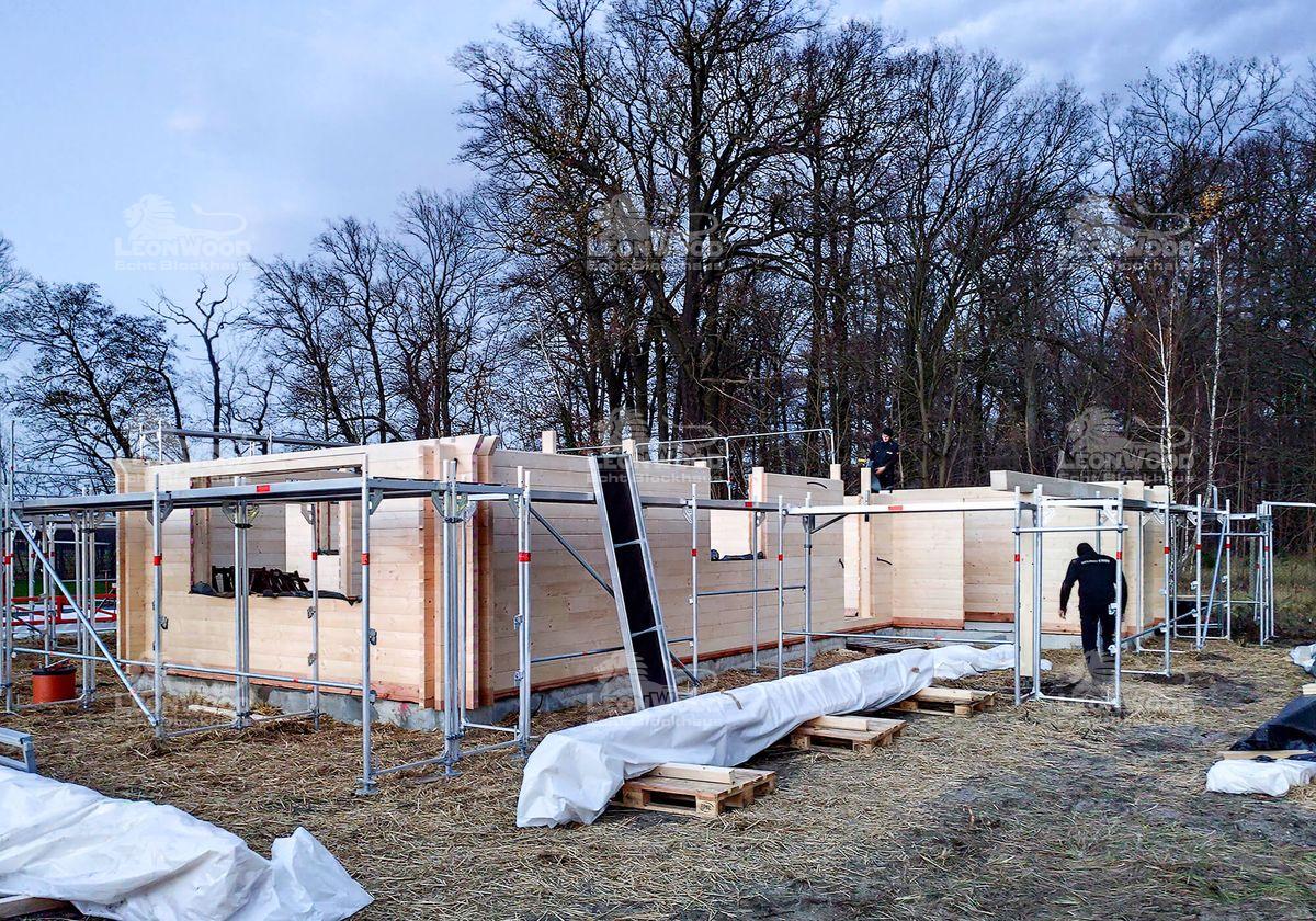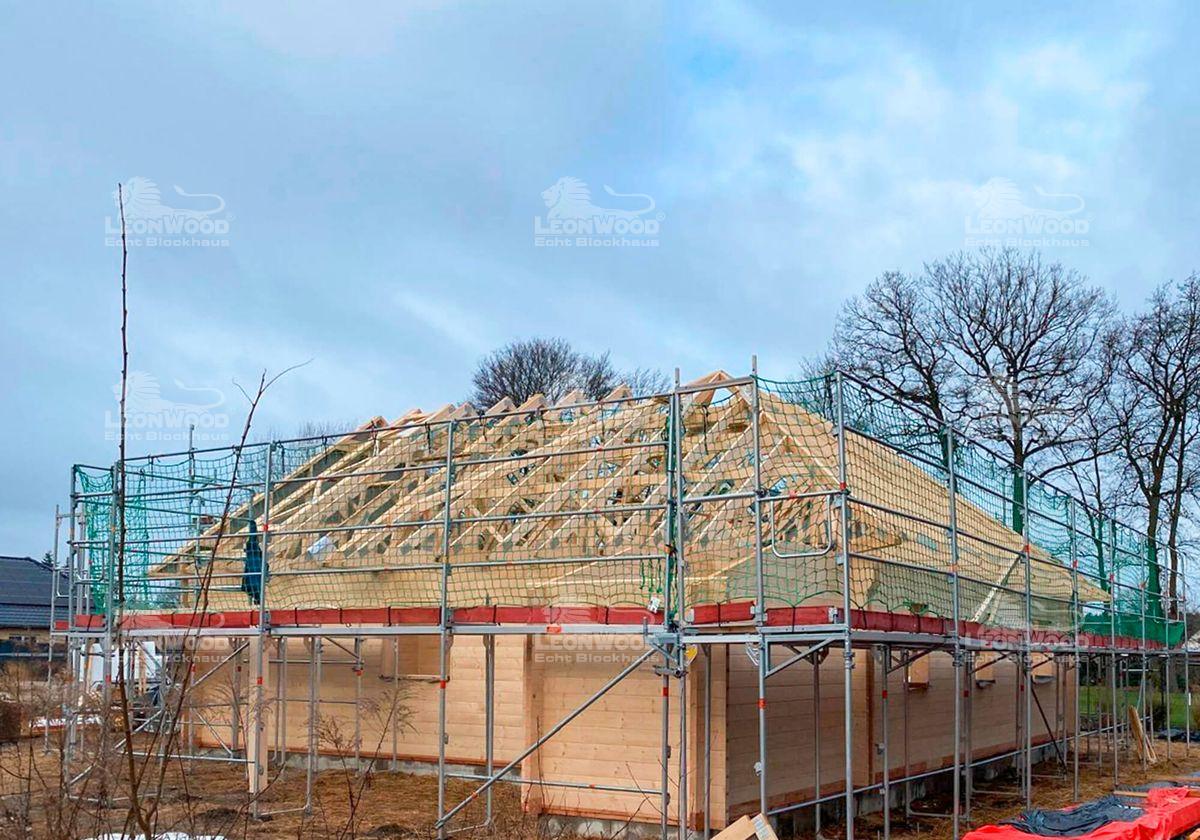 Und wieder mal ein Heimspiel für LéonWood®: dieses Blockhaus vom Typ „Canada 100“ wird unweit des Hauptsitzes in der Niederlausitz errichtet. Es ist ein Winkelbungalow mit ebenerdigem Plan und verfügt über einen großzügigen Grundriss von 12,10 x 12,10 m. Im Winkel des Hauses befindet sich ein teilüberdachter Bereich, der sich optimal für das Anlegen einer Terrasse eignet. Unsere Brandenburger Bauherren haben sich für die BIO-Doppelwand DuoPlus* als Wandvariante entschieden und können sich auf hervorragende Dämmeigenschaften freuen. Die Konstruktion besteht zwei massiven, jeweils 68mm starken Blockbohlen aus Fichte sowie einem dazwischen liegendem Dämmstoffraum für Korkgranulat. Das Wandsystem wurde in einem wissenschaftlichen Experiment der Hochschule Lausitz als hoch isolierend und behaglich temperierend bewertet. Das Satteldach mit einer Neigung von 35° bietet nicht nur Stabilität, sondern auch konstruktiven Holzschutz durch große Dachüberstände. Die beiden Giebel werden je durch ein Zitronenfenster geschmückt – ein trautes Details in der sonst geradlinigen Konstruktion. Ein Carport wurde mit Hilfe eines Schleppdachs direkt an das Haus konstruiert. Ein Geräteraum vervollständigt das Ensemble. Unsere Bauherren können sich in Zukunft auf gemütlichen 100m² Wohnfläche ausleben.