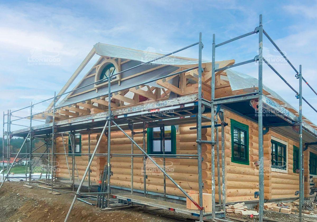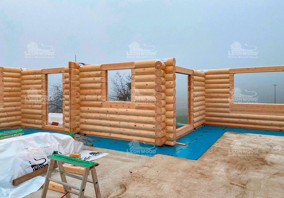 In der Oberpfalz, unweit der Hochschulstädte Amberg und Weiden, entsteht derzeit ein Rundstammhaus vom Typ „Canada 120“. Unsere Bayerischen Bauherren realisieren es sich mit der Rundholzwand NordicRound*, die aus 25 Zentimeter starken Kiefernstämmen besteht. Auf dem Winkelbungalow sitzt ein flach geneigtes Satteldach auf, das in beiden Giebeln durch ein anheimelndes Zitronenfenster geziert wird. Im Winkel des Hauses kann eine Terrasse angelegt werden, sie ist teilweise überdacht. Die ebenerdige Bauweise ist bereits für das Leben im Alter optimiert, alle Räumlichkeiten finden sich bequem auf einer Ebene. Das Dach bietet Stauraum für Habseligkeiten, die sich nicht im täglichen Gebrauch befinden. Insgesamt verfügt dieses Rundstammhaus über rund 120m² Wohnfläche.