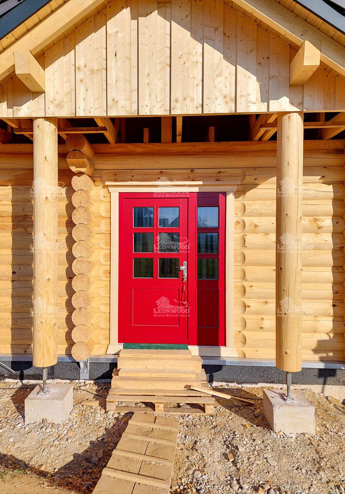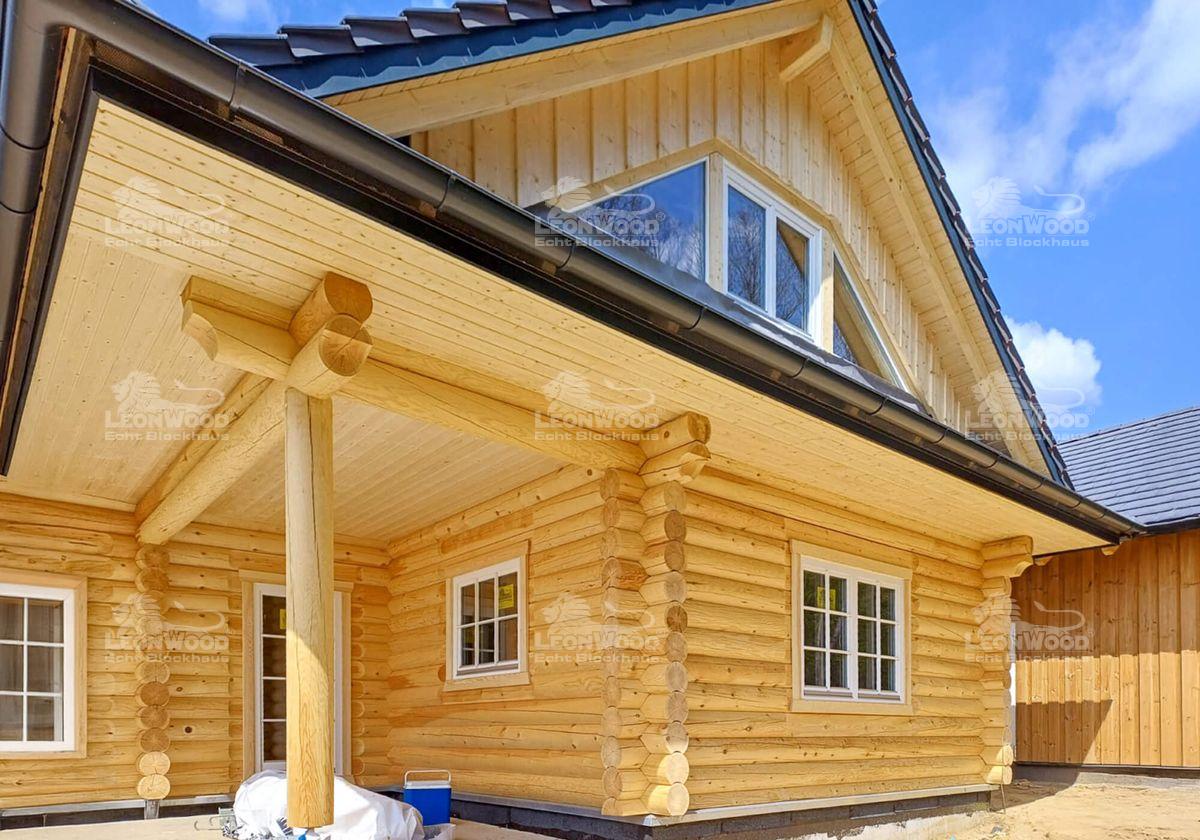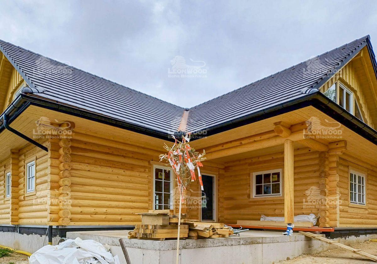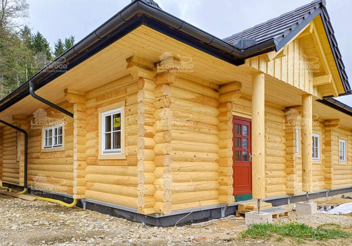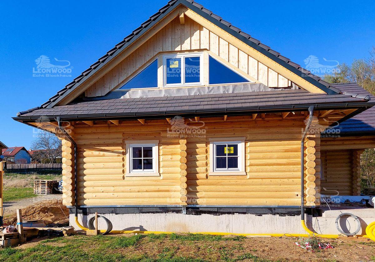 In der Österreichischen Steiermark entsteht derzeit ein Rundstammhaus mit Wow-Effekt. Unser Bauherr realisiert sich das Winkelbungalow „Canada 120“ mit der Rundholzwand NordicRound*. Stamm um Stamm türmen sich die Außenwände empor, sie bestehen aus nordischer Kiefer im Durchmesser von 25 Zentimetern. Sie haben nicht nur eine besonders rustikale Optik, sondern sorgen auch für eine hervorragende Wärmedämmung und ein natürliches Raumklima. Das voll ausgebaute Dachgeschoss bietet zusätzliche 90 m² Wohnraum, was den großzügigen Charakter des Hauses unterstreicht. Das offene Wohnraumkonzept im Erdgeschoss vereint Wohn-, Koch- und Essbereich in einem Raum. Das so geschaffene Zentrum des Hauses nimmt über die Hälfte der Grundrissfläche ein und schafft eine helle, freundliche Atmosphäre. Eine praktische Hauseingangsüberdachung getragen von massiven Rundstämmen schützt vor Witterungseinflüssen. Für optimalen Komfort sorgt die ökologische Dämmung des Fußbodens mit Korkgranulat, das für beste Dämmwerte und ein stets angenehmes Raumklima sorgt. Insgesamt bietet das Haus über 200 m² Wohnfläche und zeigt, wie Holzbau nachhaltiges, energieeffizientes und gesundes Wohnen ermöglicht.