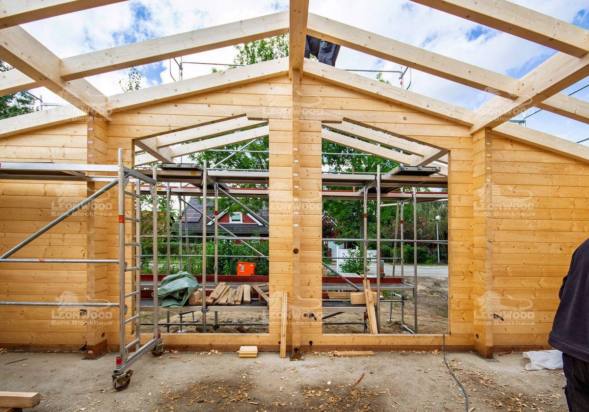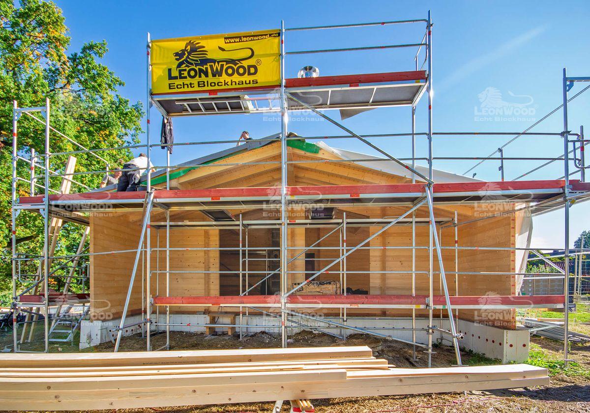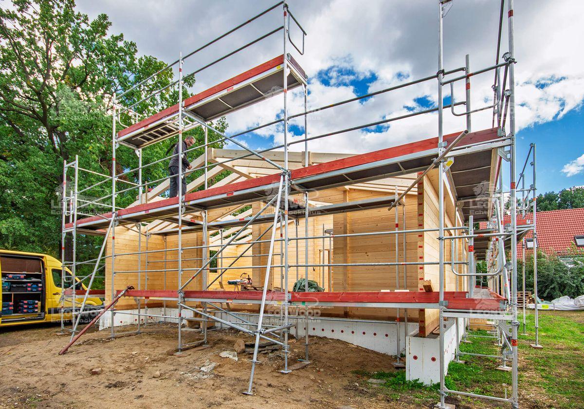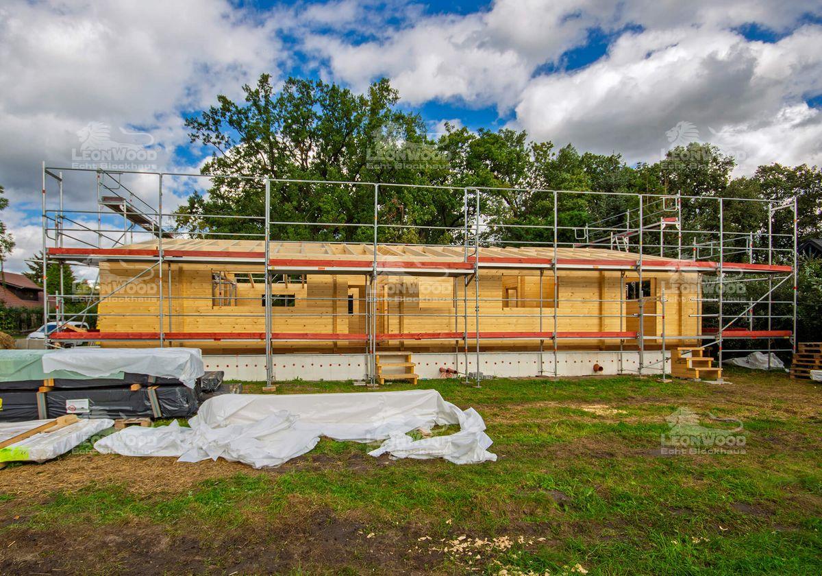 Hier baut ein LéonWood®-Kollege. Nur ein paar Meter vom neuen Geschäfts- und Besucherzentrum im kleinen Dörfchen Maust bei Cottbus entsteht der ganz neue Holzhaus-Typ „Billund“, der als Prototyp mit ganz innovativer Wandkonstruktion von den LéonWood®-Machern entworfen wurde. Die sogenannte Cross Insulated Construction (kurz CIC) besteht aus einem mehrschaligem Wandsystem: die innere Schicht wurde mit massiven Fichtenholzbohlen gefertigt – ganz nach bewährter Blockhaus-Tradition. Auf diese folgt eine Ständerkonstruktion inklusive 200mm Dämmebene mit ökologischen Holzfaserdämmplatten. Nach außen hin abschließend werden Unterdeckplatten ebenfalls aus Holzfasern montiert, die dann individuell beplankt werden – hier aus einer Kombination aus senkrechten Holzlatten und einem blechernen Stehfalzsystem. Anders als bei herkömmlichen LéonWood®-Haustypen gibt es beim „Billund“ an den Traufseiten keinen Dachüberstand. Der Look ist nordisch, reduziert inspiriert und bringt ein ganz puristisches Antlitz mit sich. Einzig die Schmuckgiebelseite weist mit einem weit überkragenden Dach einen großen Dachüberstand auf, der gleichzeitig als Terrassenüberdachung für den knapp 20m² großen Freisitz dient. Große Fensterfronten erhellen den dahinter befindlichen Wohnbereich mit viel Tageslicht. In den Innenräumen dominiert dann ebenfalls der Naturstoff Holz: die Innenwände bestehen wie die innere Schicht der CIC aus Massivholzbohlen. Der Dachstuhl ist sichtbar, durch die steigenden Raumhöhen herrscht ein ganz besonderes luftiges Flair im gesamten Haus. Insgesamt verfügt dieses „Billund“ über rund 125m² Wohnfläche mit einem praktischen Raumkonzept, das unser Kollege selbst entworfen hat. Wir sind schon gespannt auf das Endresultat!