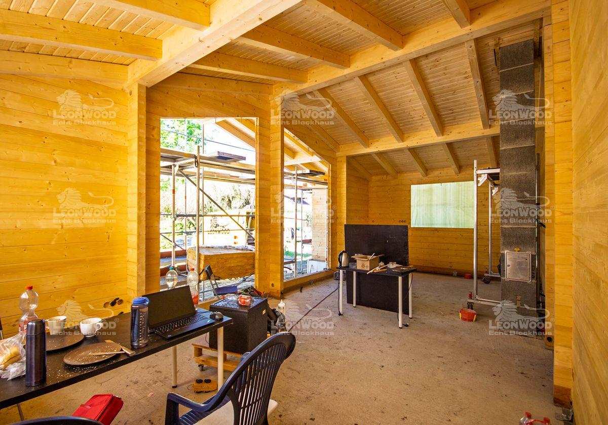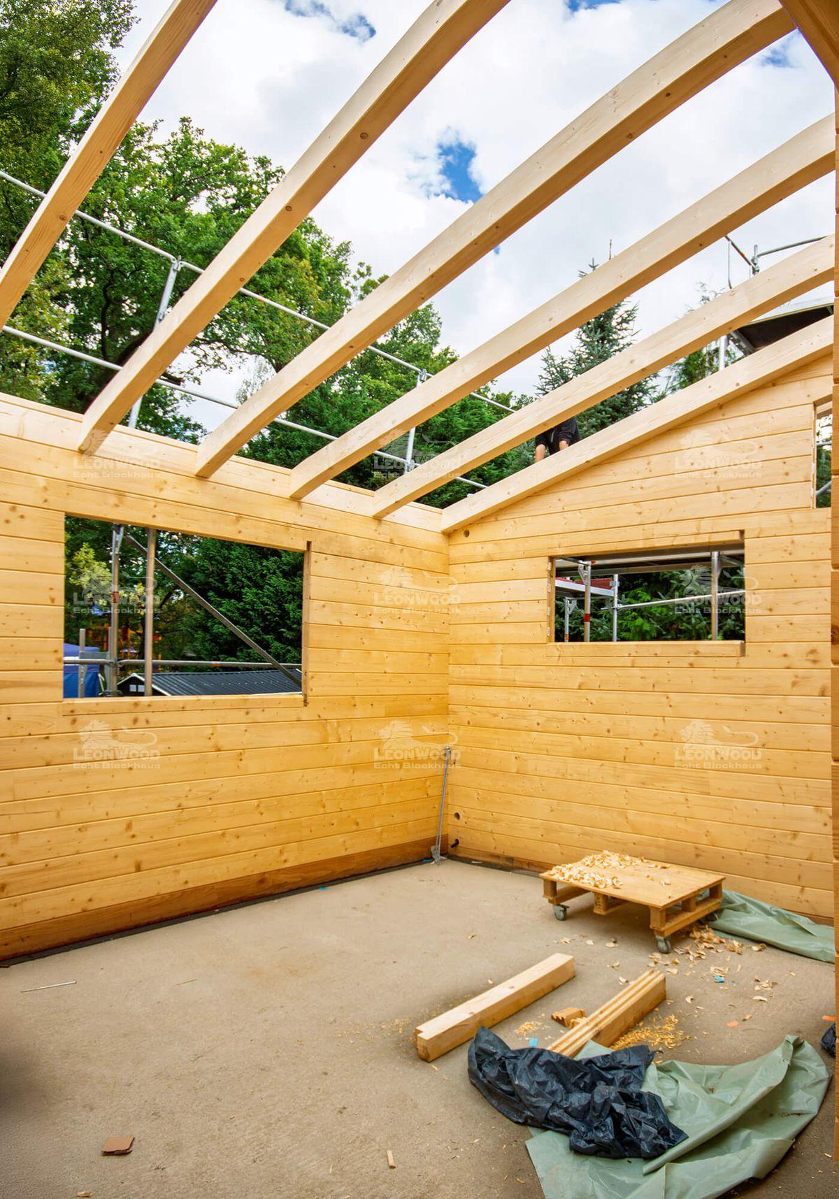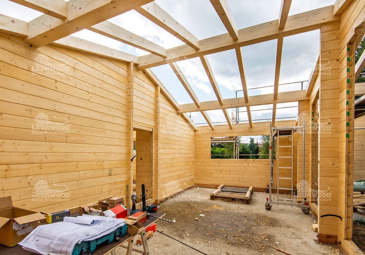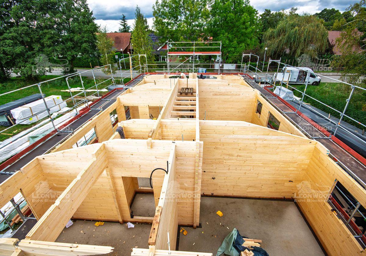 Hier baut ein LéonWood®-Kollege. Nur ein paar Meter vom neuen Geschäfts- und Besucherzentrum im kleinen Dörfchen Maust bei Cottbus entsteht der ganz neue Holzhaus-Typ „Billund“, der als Prototyp mit ganz innovativer Wandkonstruktion von den LéonWood®-Machern entworfen wurde. Die sogenannte Cross Insulated Construction (kurz CIC) besteht aus einem mehrschaligem Wandsystem: die innere Schicht wurde mit massiven Fichtenholzbohlen gefertigt – ganz nach bewährter Blockhaus-Tradition. Auf diese folgt eine Ständerkonstruktion inklusive 200mm Dämmebene mit ökologischen Holzfaserdämmplatten. Nach außen hin abschließend werden Unterdeckplatten ebenfalls aus Holzfasern montiert, die dann individuell beplankt werden – hier aus einer Kombination aus senkrechten Holzlatten und einem blechernen Stehfalzsystem. Anders als bei herkömmlichen LéonWood®-Haustypen gibt es beim „Billund“ an den Traufseiten keinen Dachüberstand. Der Look ist nordisch, reduziert inspiriert und bringt ein ganz puristisches Antlitz mit sich. Einzig die Schmuckgiebelseite weist mit einem weit überkragenden Dach einen großen Dachüberstand auf, der gleichzeitig als Terrassenüberdachung für den knapp 20m² großen Freisitz dient. Große Fensterfronten erhellen den dahinter befindlichen Wohnbereich mit viel Tageslicht. In den Innenräumen dominiert dann ebenfalls der Naturstoff Holz: die Innenwände bestehen wie die innere Schicht der CIC aus Massivholzbohlen. Der Dachstuhl ist sichtbar, durch die steigenden Raumhöhen herrscht ein ganz besonderes luftiges Flair im gesamten Haus. Insgesamt verfügt dieses „Billund“ über rund 125m² Wohnfläche mit einem praktischen Raumkonzept, das unser Kollege selbst entworfen hat. Wir sind schon gespannt auf das Endresultat!