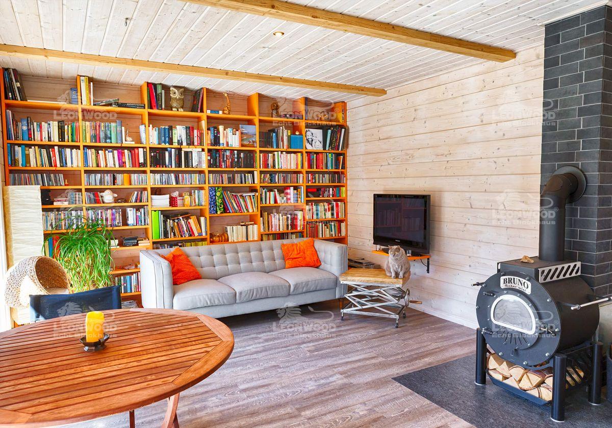 Thomas Milzow ins Büro gelangt ist, weiß Linke nicht mehr genau. Was er noch weiß ist, dass die Chemie von Anfang an stimmte, dass sich alles richtig anfühlte: „Wir konnten alles selbst entwickeln, wie wir bestimmte Sachen wollten“, berichtet der Schauspieler. „Eigentlich hatten wir den Blockhaus-Typen ‚Flatwood Green‘ im Blick. Bei einem Baustellenbesuch haben wir dann den Haustyp ‚Victoria‘ erkundet. Uns hat gleich, der zusätzliche Stauraum im Dachgeschoss überzeugt.“ Überzeugt haben die beiden auch die ökologischen Aspekte: „Wir wollten von Anfang an auf Gipskarton verzichten. Wir haben uns also für Blockbohlen-Innenwände entschieden“, berichtet Thomas Linke. „Vom Dämmen mit Schafwolle und vor allem mit Kork – wie in der