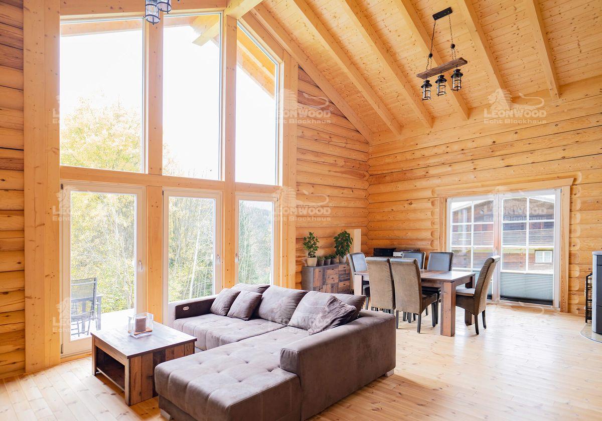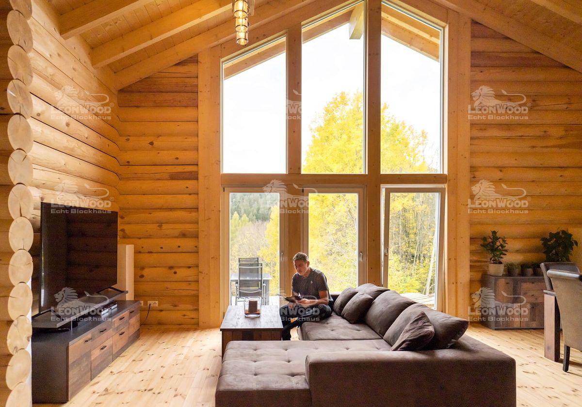 Warum der Haustyp „Mexico“, fragen wir: „Das war einfach der Traum“, sagt Christian und erinnert sich an das Bild von damals, das ganz ähnlich war. „Ich wollte auf jeden Fall ein offenes Haus, was frei ist. Und auch die Galerie, wo ich schlafen kann, war mir sehr wichtig.“ Das Haus sollte nicht zu groß sein, stattdessen wünschte er sich eine gemütliche Atmosphäre und so wenig Innenwände, wie möglich. Auch die Rundstämme hat er von dem Traumbild übernommen: „Ich habe mir gesagt, wenn ich schon einen Traum habe, dann erfüll ich ihn mir jetzt auch genau so!“ Das Grundstück in exponierter Lage war auch wie geschaffen für die markante Giebelverglasung, die den Haustypen „Mexico“ ausmacht. Von seiner großen Terrasse, die daran anschließt, hat er nun einen tollen Blick „man sagt bei uns, in die kleinen Berge, zum großen Arber hingewandt. Und ja, das ist eigentlich perfekt!“