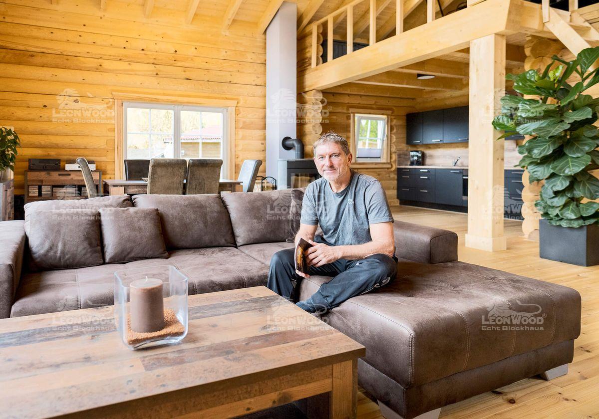 Die Idee eines eigenen Blockhauses entstand bereits vor vielen Jahren. Christian war am Ende seiner Zwanziger, als er zufällig einen Katalog entdeckte, in dem LéonWood® vertreten war. Darin fand er ein Blockbohlenhaus aus Rundstämmen mit Galerie – ein Bild, das ihn sofort faszinierte und nicht mehr los ließ. Damals dachte er: „Wenn ich mal im Lotto gewinne, baue ich mir so ein Haus.“ Zu diesem Zeitpunkt war er bereits mit Haus und Familie versorgt. Der Traum blieb. Doch das Leben hatte eine andere Wendung für ihn vorgesehen: die Trennung von seiner Frau war ein Rückschlag. Das gemeinsame Haus musste verkauft werden. Aber der gelernte Bürokaufmann blieb zuversichtlich, denn „ich brauchte ja schließlich wieder ein Dach über dem Kopf.“ Er erinnerte sich zurück an seinen Traum von vor 30 Jahren: „Wie war das damals nochmal? Und dann fiel mir wieder ein, dass es LéonWood® war. Und dann hat das so seinen Lauf genommen.“