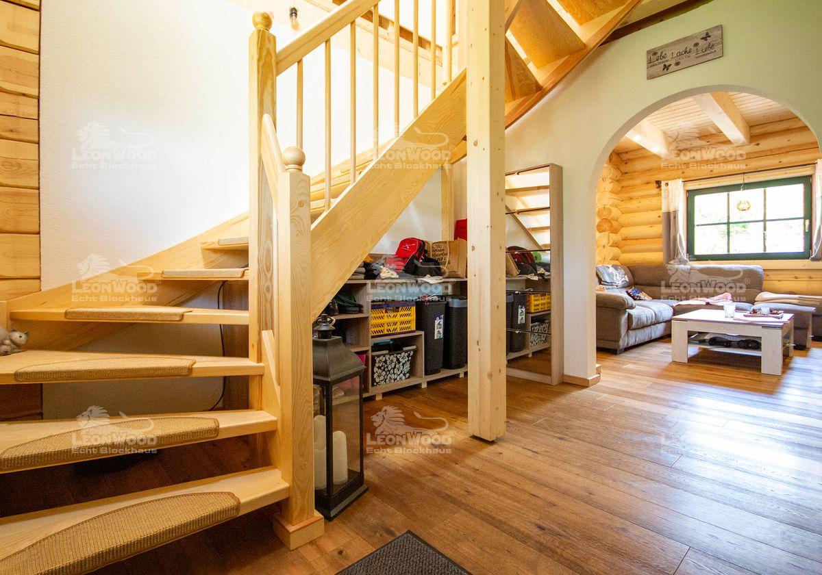 Geplant haben die beiden ihr Haus im Prinzip alleine. „Ich habe mir so ein Programm runtergeladen“, blickt Mirko zurück. „Und ich bin ein Fan von Symmetrien. Also beispielsweise die ganzen Verkämmungen hier draußen, die sind alle im gleichen Abstand. Das strahlt Ruhe aus.“ Viel Licht musste ins Haus, weswegen das Paar mit extra vielen Fenstern geplant hat. Durch einen großen Rundbogen, der den Wohn-Koch-Bereich vom Flur trennt, ist eine Sichtachse mitten durch das Holzhaus entstanden: „Wenn man ins Haus hineinkommt, kann man direkt wieder nach draußen schauen. Das war uns wichtig“, beschreibt Nicole. Auch die Rundstammwand NordicRound* hatte die beiden begeistert. Die haben sie im Musterhaus „Mikado“ gesehen: „Die hat nochmal eine urtümlichere Ausstrahlung, wo wir dann wieder aufs Naturnahe zurückkommen“, sagt die Heilpraktikerin.