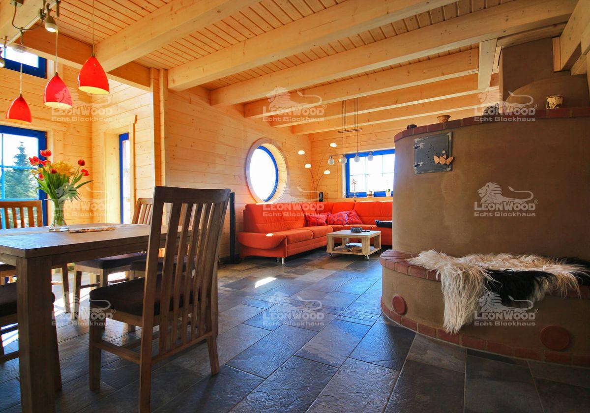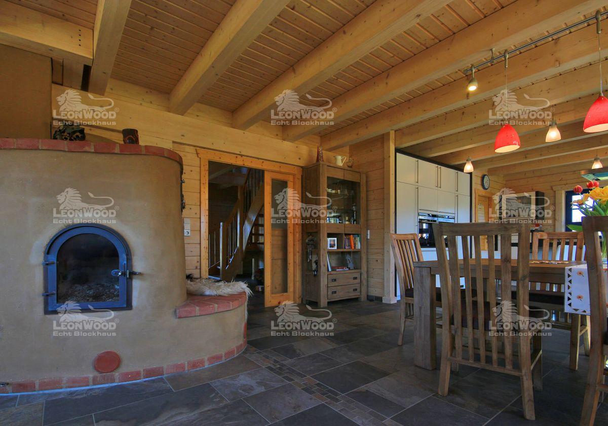 Natürlichkeit zieht sich durch das ganze Holzhaus. Der Boden im Erdgeschoss ist aus Naturstein, während im Obergeschoss ein Korkfußboden den Füßen schmeichelt. Sarodniks, die viel Wert auf natürliche und gesunde Baustoffe legen, haben sich für die nachhaltige Biodoppelwand® entschieden, die mit expandiertem Korkgranulat eine dauerhaft angenehme Wohnatmosphäre schafft. Sie hält die wohlige Wärme eines besonderen Highlights im Haus: der Lehmgrundofen im Wohnzimmer. Im Obergeschoss wurde mit Hanf gedämmt und Schafwolle verdichtet. Die Energiebilanz ihres Familienhauses zaubert Frau Sarodnik ein Lächeln ins Gesicht: