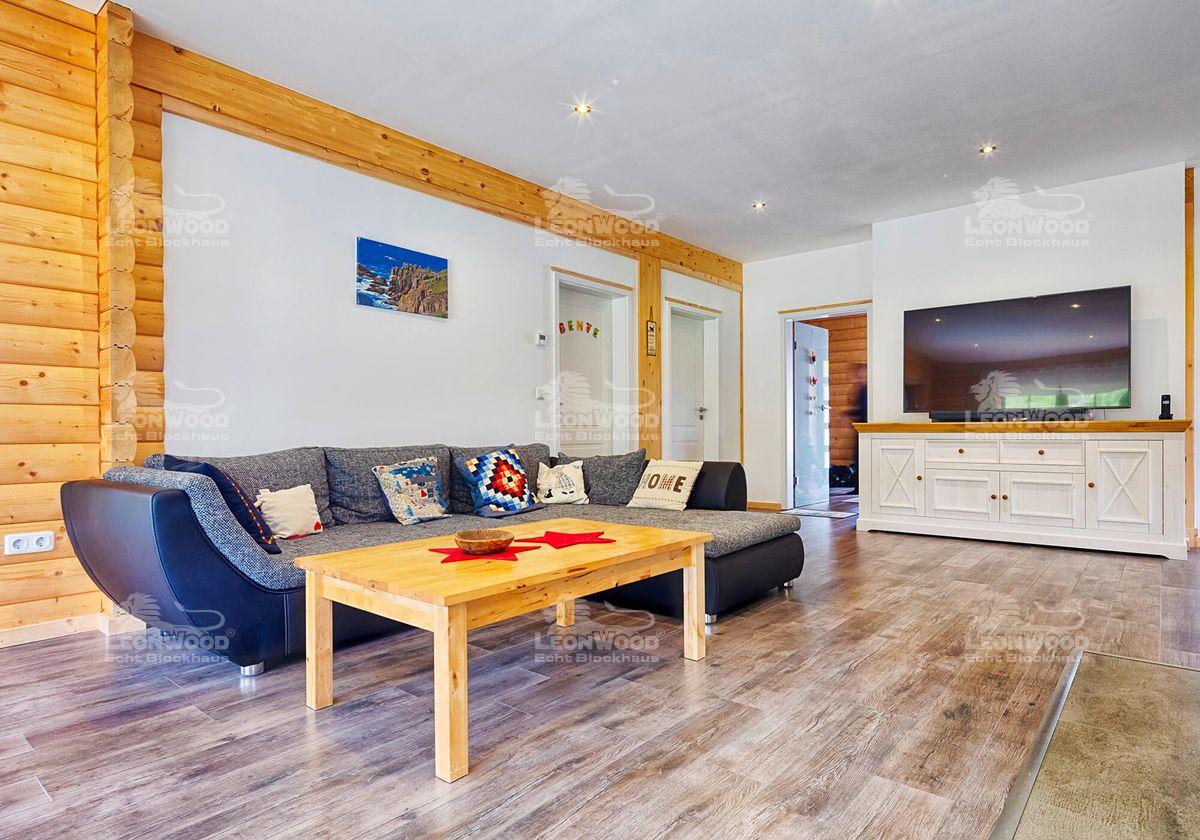 Unser Bauherr wirkt rundum zufrieden mit seinem neuen Blockhaus und verteilt lobende Worte. „Die Lebensqualität ist ausgezeichnet. Was wir auf jeden Fall bestätigen können, ist die Aussage, dass das Wohnklima sehr gut ist. Durch das Holz fühlt es sich wärmer an. Der Ausgleich der Luftfeuchtigkeit funktioniert wunderbar – da arbeitet das Holz gut mit. Neben der Wärmedämmung, von der wir absolut überzeugt sind, ist auch die Geräuschdämmung sehr gut. Bei der Heizung (Wärmepumpe) merkt man recht deutlich, wie effektiv das Ganze ist,“ sagt Daniel anerkennend. Auch das Zusammenspiel von Wärmepumpe und Photovoltaik-Anlage funktioniere einwandfrei, was den überraschend geringen Energieverbrauch erkläre. „Vom Strom her verbrauchen wir wirklich wenig. Über den gesamten Sommer, das Frühjahr und den Herbst beziehen wir sehr wenig aus dem Netz, weil das alles die Sonne regelt,“ freut sich der Bauherr.