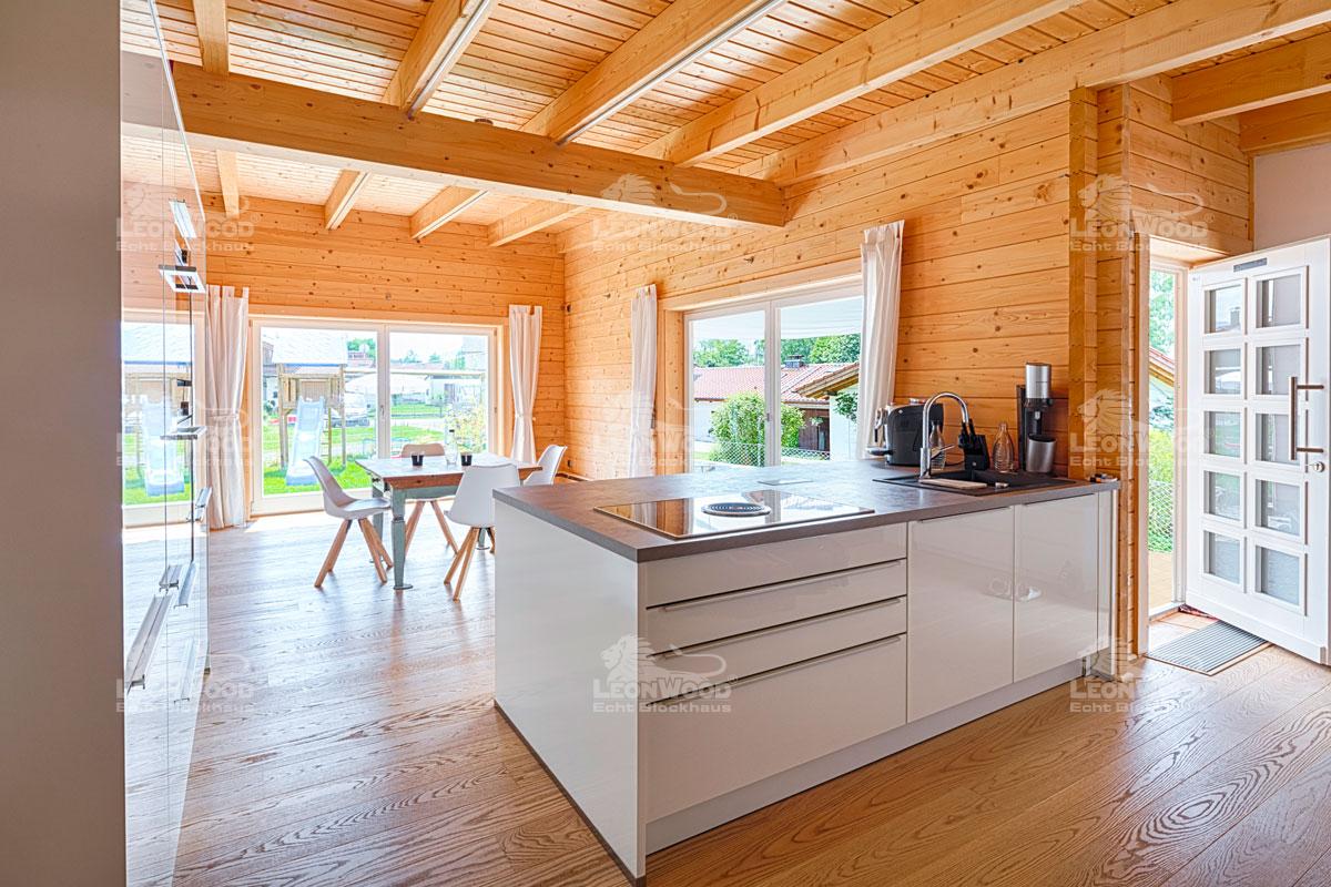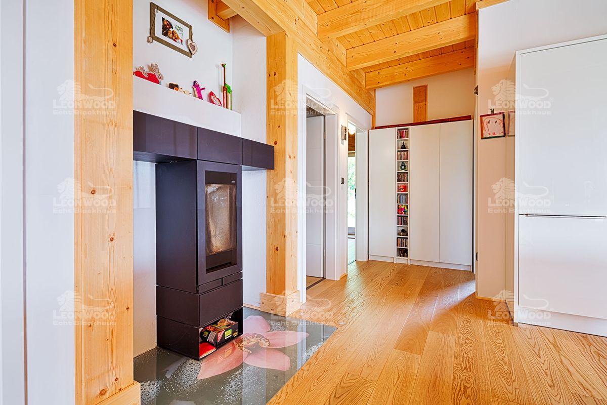 Zeitdruck hatte Franz Schweiberer allerdings bei der Fertigstellung des Hauses, welches sogar komplette Barrierefreiheit ermöglicht. Aufgrund des Schimmelproblems in der alten Wohnung wollte unsere Bauherrenfamilie damals so schnell wie möglich in das neue und atmungsaktive Haus einziehen. Ende August wurde der Bausatz geliefert und innerhalb einer Woche aufgestellt. Da ein Holzhaus nach Zusammensetzen der Bauteile keine Trocknungsphase benötigt, konnte ab September sofort der Innenausbau begonnen werden. Dies liegt unter anderem am Verzicht von Estrich als Boden. Stattdessen entschieden sich die Bauherren für den Polar-Fußboden von LéonWood®. Die Vorteile des korkgedämmten Fußbodens liegen auf der Hand: „Die Heizkosten passen, da kann ich nicht jammern. Und es ist immer kuschelig warm.“ Nach Fußbodeneinbau und Errichtung der Innenwände folgte die Verlegung des Parketts, die Ausstattung eines Bades sowie die Einrichtung der Küche. Einen Tag vor Weihnachten konnte die Familie dann endlich einziehen: „Wir hatten damals eine kleine Wohnung und konnten keinen Christbaum aufstellen. Deswegen hatten wir das Ziel, dass wir Weihnachten schon drin sind.“ So haben sie ihr sportliches Ziel, innerhalb von vier Monaten nach Bausatzlieferung einzuziehen, erreicht und sich selbst ein schönes Weihnachtsgeschenk gemacht.