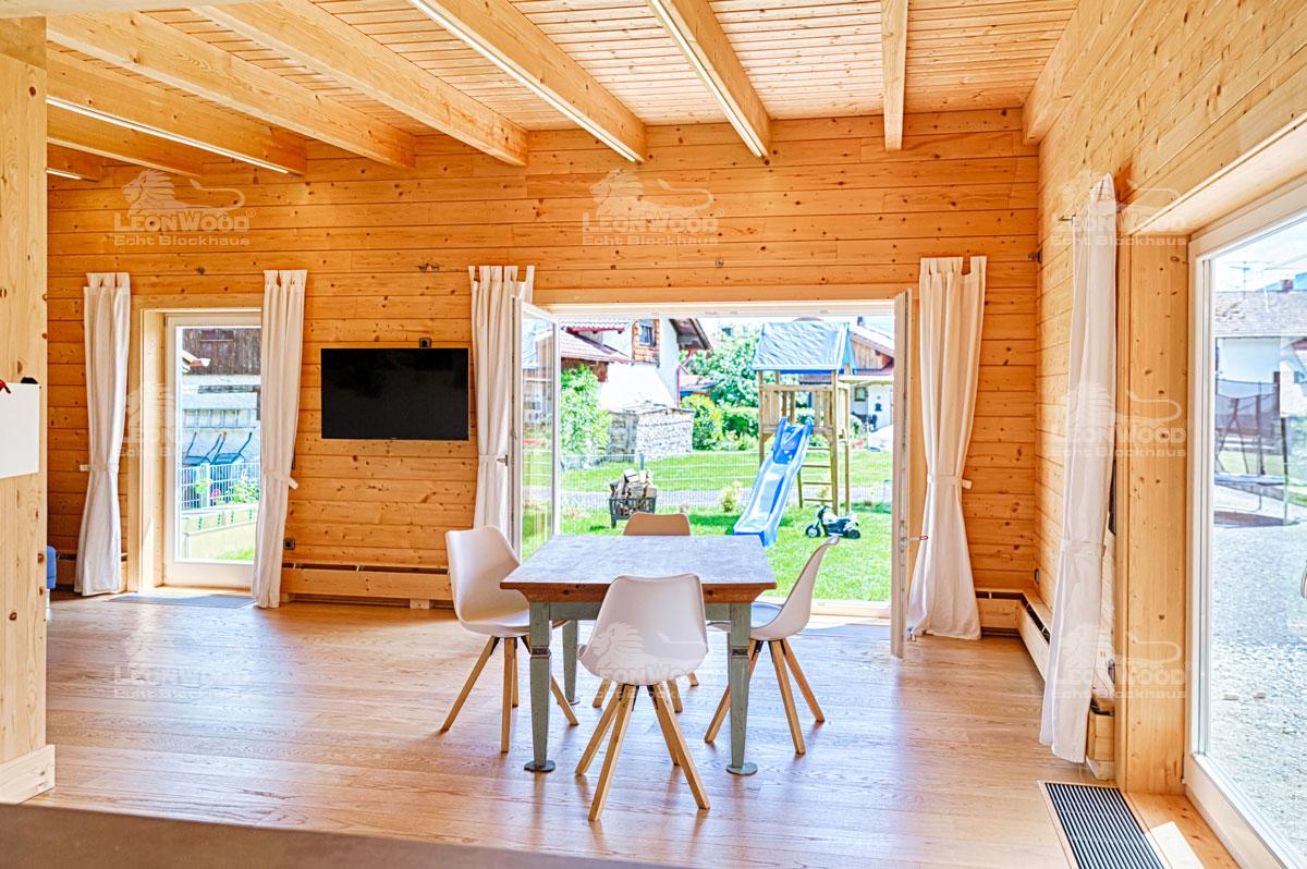 Minimalistische und klare Strukturen zeichnet das „Flatwood Green 90“ von LéonWood® aus. Großflächige und bodentiefe Fenster erhellen auf natürliche Weise die Räumlichkeiten und lassen die sichtbaren Dachbalken besonders strahlen. Das oben aufsitzende Flachdach rundet den Bauhaus-Stil ab. „Beim Flatwood war das Carport ursprünglich mit dabei. Dieses haben wir aber damals als Wohnraum realisiert“, erzählt Franz Schweiberer. Anstelle des Carports wurde der Wohnraum des Hauses also erweitert und bietet deshalb ihm und seinen zwei Kindern rund 105m² Wohnfläche auf einer Ebene. „Die Kinder lieben das Holzhaus.“, schwärmt er.