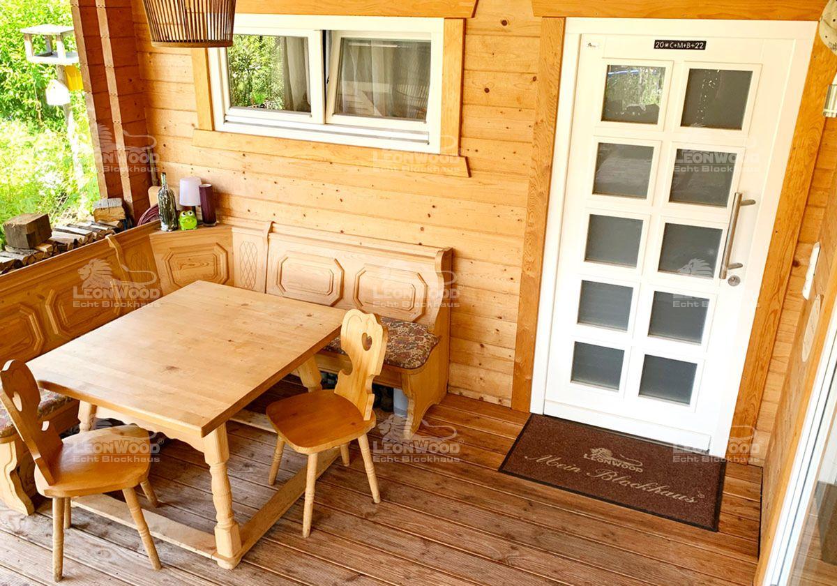 Franz Schweiberer kann man als bayerische Frohnatur beschreiben, der als gelernter Maler und Raumausstatter eine Passion für das Bauen mit Holz gefunden hat. Beim Hausbau und auch beim Innenausbau hat er selbst viel Hand angelegt und Eigenleistung erbracht, nicht zuletzt um Kosten einzusparen. Den gelieferten Bausatz ordnungsgemäß zusammenzuzimmern, fiel ihm mit Hilfe des Richtmeisters leicht: „Das kann man ja selber aufbauen. Das ist im Endeffekt wie Lego für Erwachsene, weil es durchnummeriert ist“, lacht er. Auch die Überdachung vor der Hauseingangstür hat Franz Schweiberer selbst erweitert und später sogar eigenhändig eine Terrasse bzw. Veranda gebaut, denn er liebt den typisch amerikanischen Stil mit Veranda vor dem Haus: „Also, so wie man da so vor der Haustür sitzen kann. Das ist scho‘ schee. Das Vordach ist jetzt verlängert worden und geht bis zum Hausende. Somit hab‘ ich noch eine mega überdachte Terrasse. Auf der Veranda steht nun eine Eckbank und noch ein Sofa, weil ich gerne draußen schlafe“, erzählt Franz Schweiberer glücklich von seinem neusten Terrassen-Projekt. „Im Sommer ist das mega und die Kinder lieben es auch, draußen zu schlafen.“ So lässt sich der Wohnraum in den warmen Sommermonaten auch nach draußen erweitern.