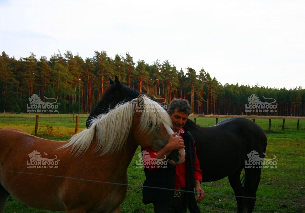 Wir, das LéonWood®-Team, bestehend aus Herrn Walkowiak (Baubiologe), Herrn Littel (Projektleiter) und mir (Redaktion BlockhausZeitung), schauen nicht schlecht, als wir in Rehain bei Finsterwalde ankommen. Mitten in den Wäldern und Wiesen des Elbe-Elster-Kreises führt uns ein holbriger Weg in ein 20-Seelen-Dörfchen. Wer Ruhe und Natur sucht, wohnt hier genau richtig. Das LéonWood®-Blockhaus fällt sofort ins Auge. Ein ganzes Holzhaus-Ensemble ziert das Grundstück am Waldrand. Einzug hielten neben den zwei Katzen auch die beiden Pferde des Paares. Damit diese ein Dach über der Mähne haben, realisiert LéonWood® den Bauherren zusätzlich eine Blockhaus-Scheune mit Stall.