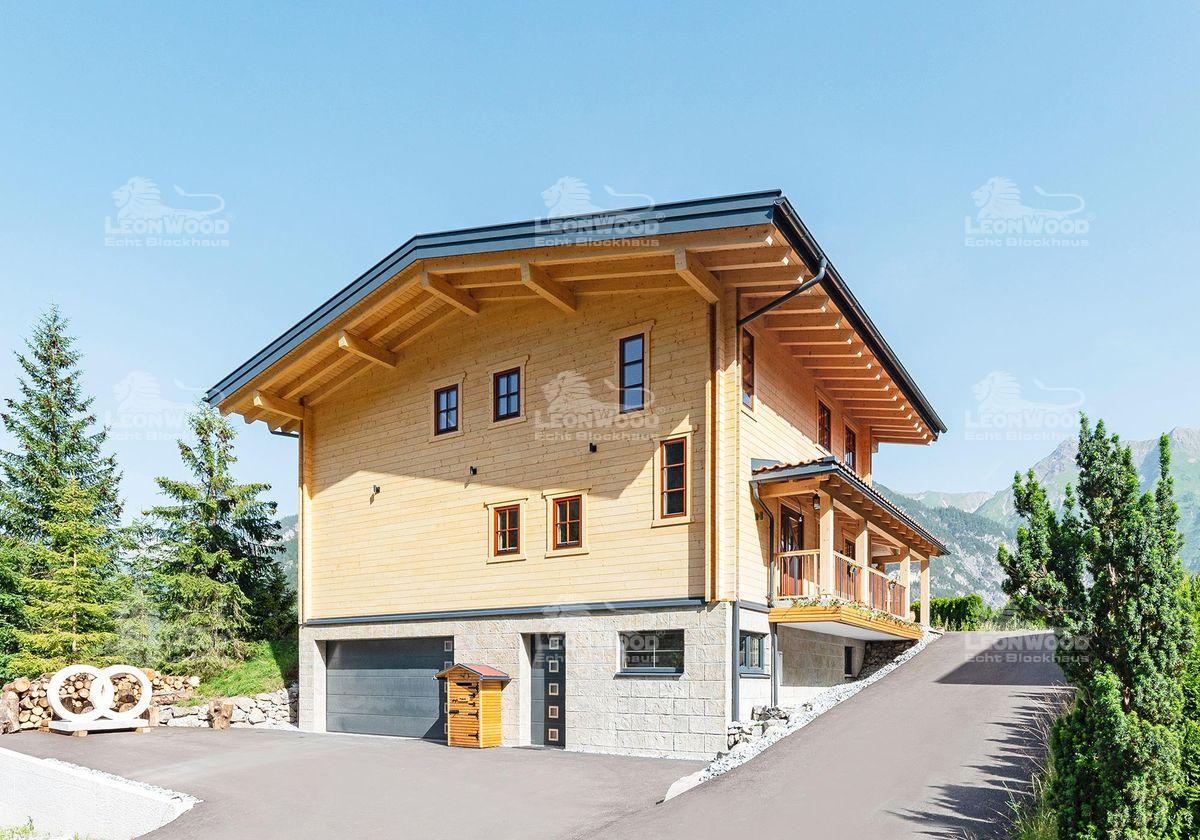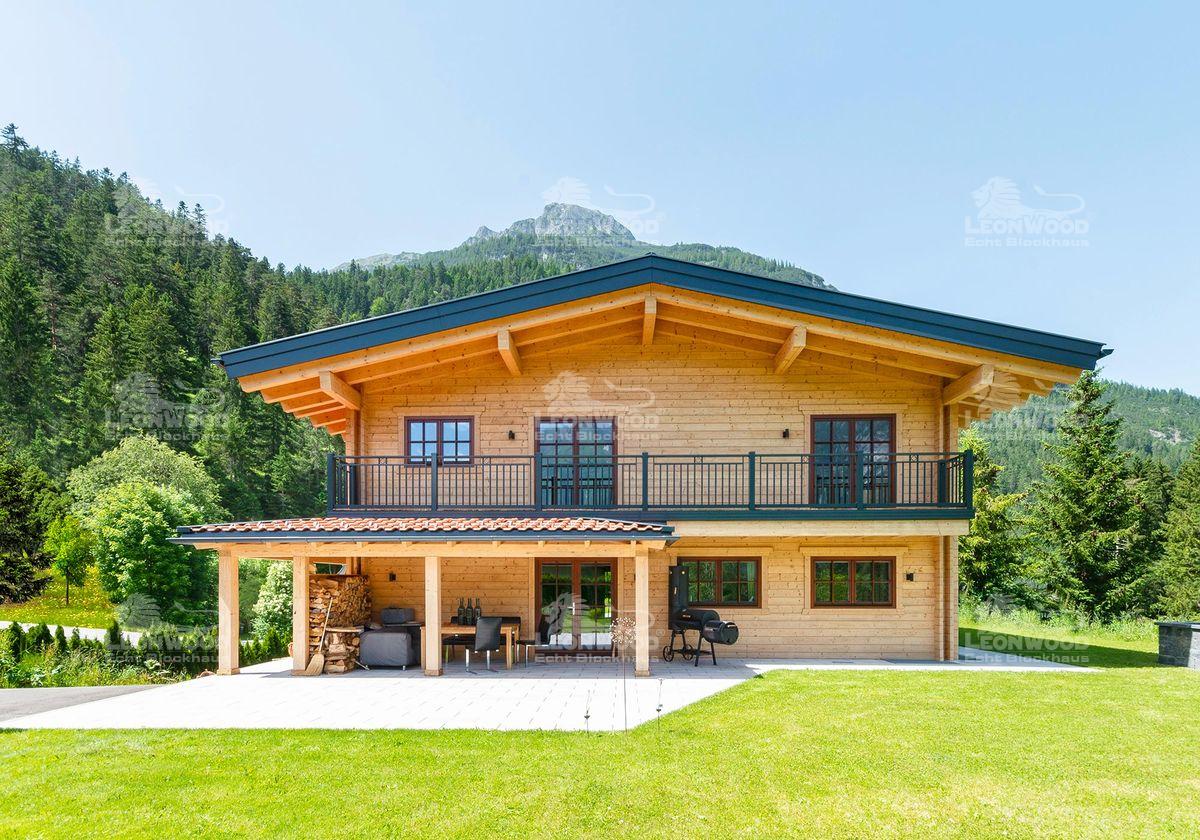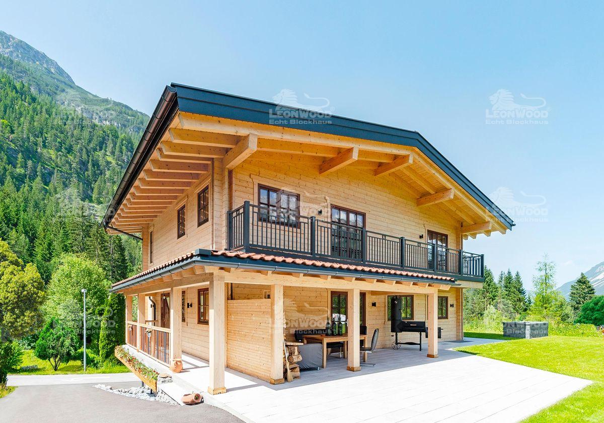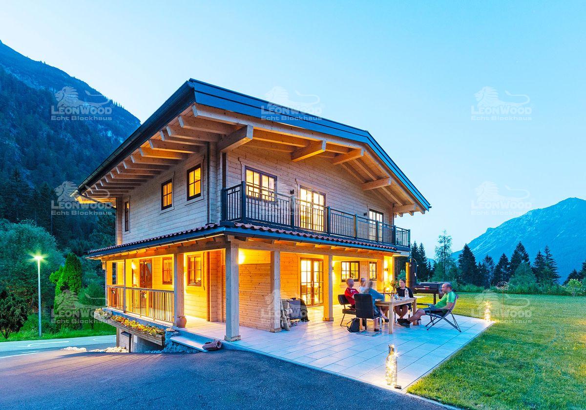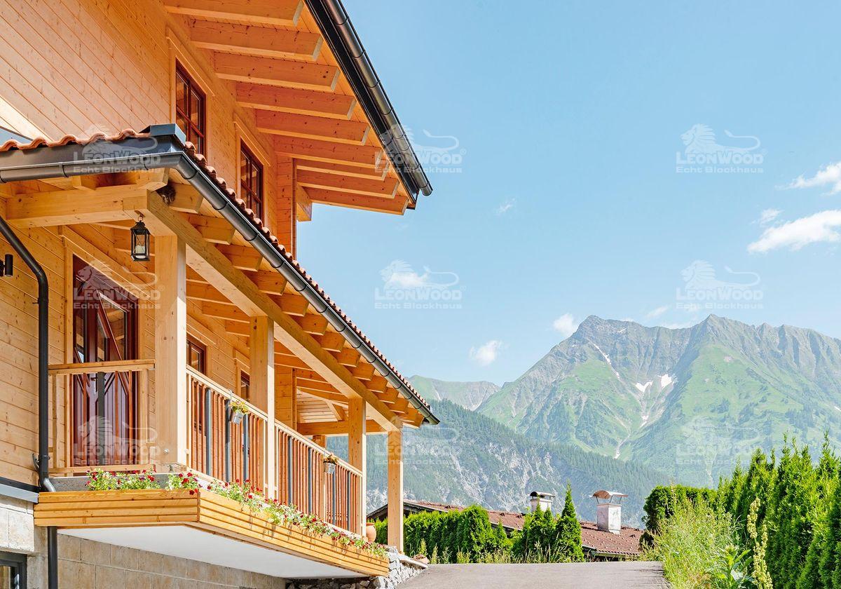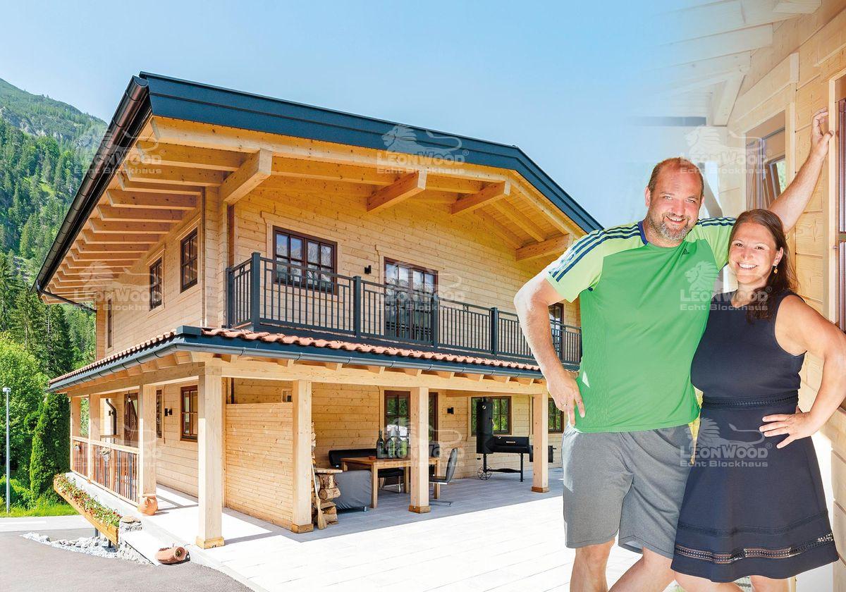 „Das Raumklima ist überwältigend. Und im Grunde, haben wir unser kleines Schloss gebaut“, erklärt Sabrina im Interview mit LéonWood® begeistert. Das kleine Schloss aus Holz steht mitten in den Tiroler Bergen – umgeben von grünen Wäldern und riesigen Bergspitzen. Das Ehepaar Tobias und Sabrina baute hier das LéonWood®-Blockhaus „Villa Siena“. „Wir wollten nichts verschnörkeltes, nichts veraltetes… einfach, schlicht und doch elegant – mit einem gewissen Charme“, sagt Tobias. So verliebten sie sich bei der Suche nach Blockhäusern im Internet relativ schnell in diesen Haustyp. Die „Villa Siena“ zeichnet sich vor allem durch das umlaufende Vordach zwischen den Etagen aus. Sabrina und Tobias lachen: „Wir haben es ‚Tütü‘ genannt. Uns hat das nicht gefallen. Wir wollten natürlich einen großen Balkon haben. Also haben wir eben das Vordach zum Teil mit Balkon gestaltet und noch bis zur Haustüre hin erweitert. Es dient gleichzeitig als Regenschutz für die Fassade. Das ist sehr gut. Deswegen ist unser Dachüberstand auch größer als ursprünglich vorgesehen.“ Von der Terrasse bis zum Hauseingang wird das Vordach von massiven Blockbohlen gestützt und erinnert an einen südländischen Säulengang. Der breite Balkon an der Giebelseite bringt Tiroler Architektur mit ein. Von hier hat man einen weiten Blick auf die spektakuläre Naturkulisse.