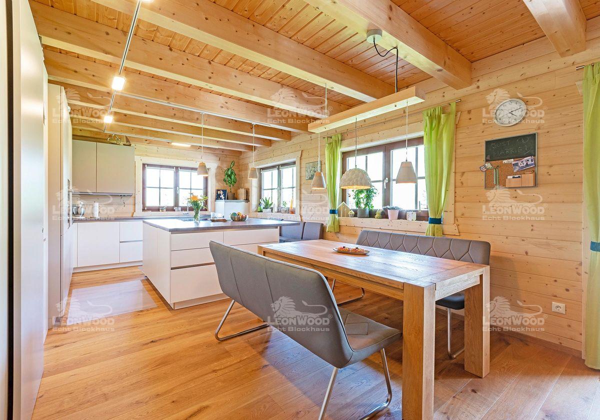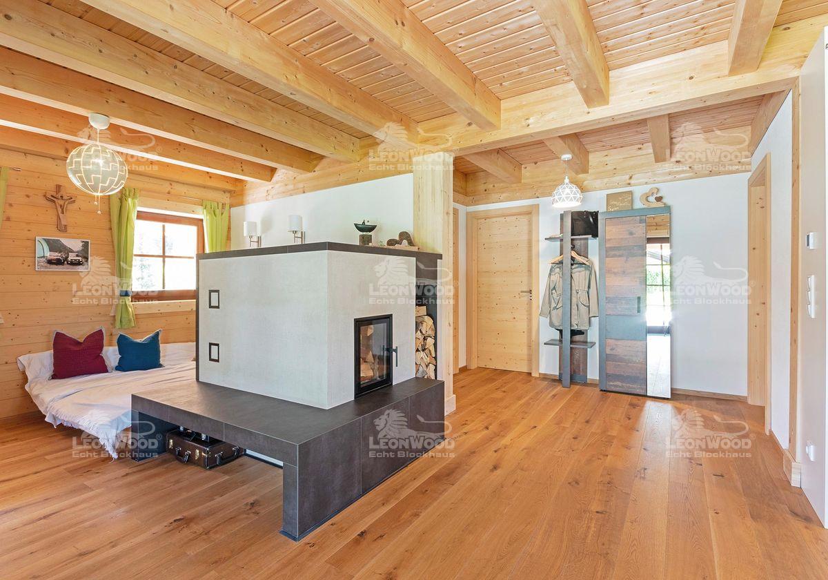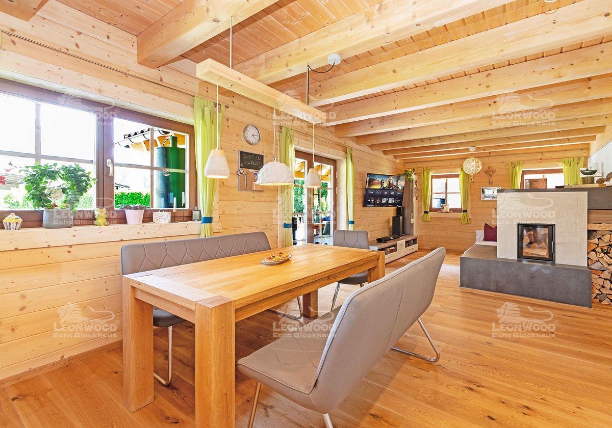 Nicht nur die Optik war den Beiden wichtig, sondern auch die Isolierung des Hauses. Tobias ist von der zweischaligen Blockbohlenwand mit Korkdämmung von LéonWood® beeindruckt, weshalb er sich auch für den Blockhaushersteller entschied: „Mir gefällt an der Wand so gut, dass die Wandstärke mit 27cm eigentlich nicht so dick ist und trotzdem ist die Isolation super – ohne künstlichen Dämmstoff und natürlich. Man sollte ja auch an die nächste oder übernächste Generation denken.“ Holz und Kork sind nachwachsende und warme Baustoffe, die das Wohnen von Natur aus behaglich und gemütlich machen. Die ursprüngliche Wärme der Materialien macht sich auch nach ein paar Tagen ohne Heizen bemerkbar. Schnell lässt sich das Haus selbst im tiefsten Winter mit dem Kachelofen wieder auf Wohntemperaturen aufheizen.
