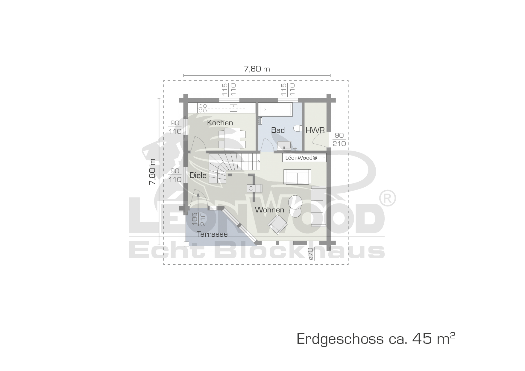 Mit unserem Blockhaus „Adria“ entscheiden Sie sich in der Standardausführung für ein Blockhaus mit mittlerer Wohnfläche. Die auf zwei Etagen verteilten 104 m² eignen sich für Paare oder auch kleine Familien. Das Erdgeschoss verfügt über eine offene Küche, in die Sie problemlos eine Essecke integrieren können. Daran schließt sich ein geräumiges Wohnzimmer an, von dem aus man auf die große Terrasse gelangt, die in den Sommermonaten zu Grillpartys, Sonnenbädern oder einfach nur zum Relaxen an der frischen Luft einlädt.
