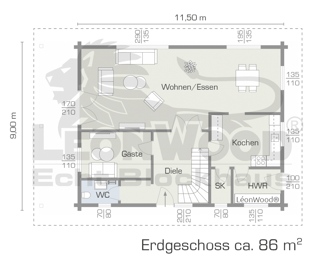 Der Preis beinhaltet den Blockhaus-Bausatz nach Standard-Grundriss, die Lieferung an eine frei erreichbare Baustelle in Deutschland sowie die aktuell geltende MwSt. für Deutschland. Bilder enthalten Sonderausstattungen.