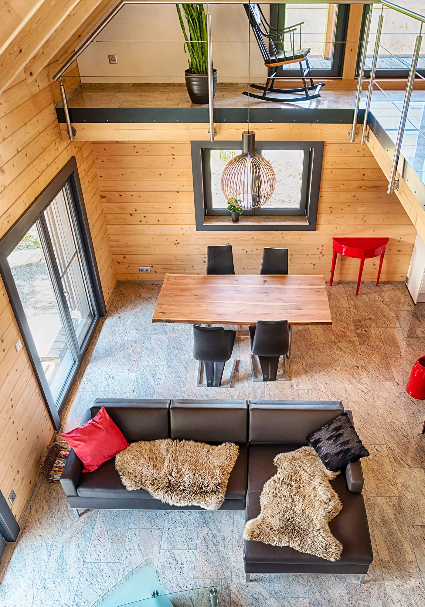 Das Massivholzhaus „Classic 150“ lädt ein, ohne aufdringlich zu wirken. Moderne Elemente sorgen hier für eine zeitgemäße Optik und werden mit gestandener Handwerkskunst kombiniert. Mit seinem roten Satteldach, den blauen Fenstern und der blauen Hauseingangstür ist das Blockhaus bereits von außen ein Blickfang, der niemandem entgeht. Die Edelstahlbrüstung am Balkongeländer setzt optisch einen modernen Kontrast zum Landhausstil während die bodentiefen Balkonfenster viel Licht ins Innere des Hauses fallen lassen.