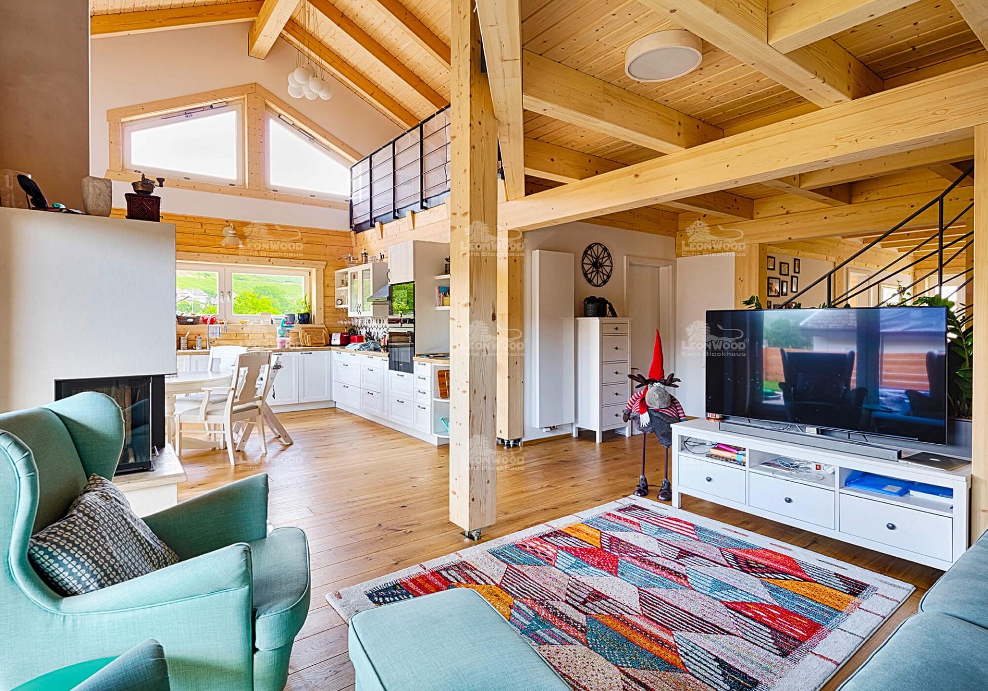 Wie bei allen LéonWood®-Blockhäusern, spielt der Baustoff Holz auch beim „Enztal“ die Hauptrolle. Dem urbanen Lebensgefühl entsprechend, ist der Naturstoff hier aber dennoch nicht allzu dominant. Das Holz leitet die Blicke und mündet in der sichtbaren Holzbalkendecke im Erdgeschoss sowie im Sichtdachstuhl im Obergeschoss. Das heimelige Wohngefühl kommt ganz von alleine.
