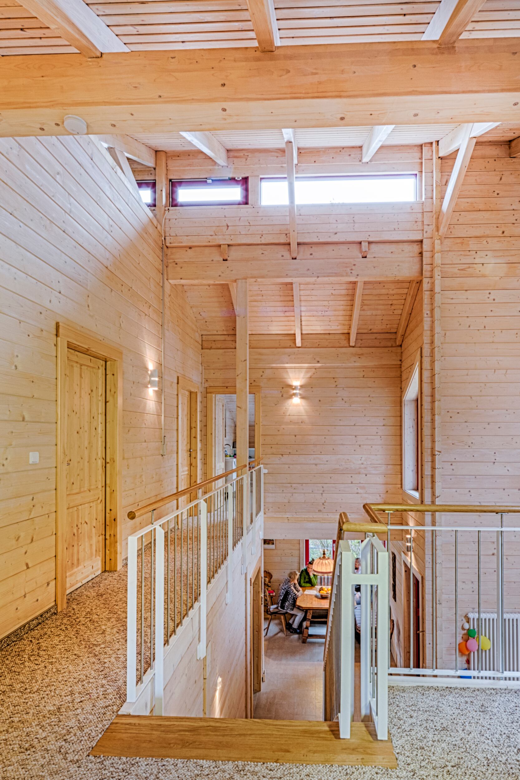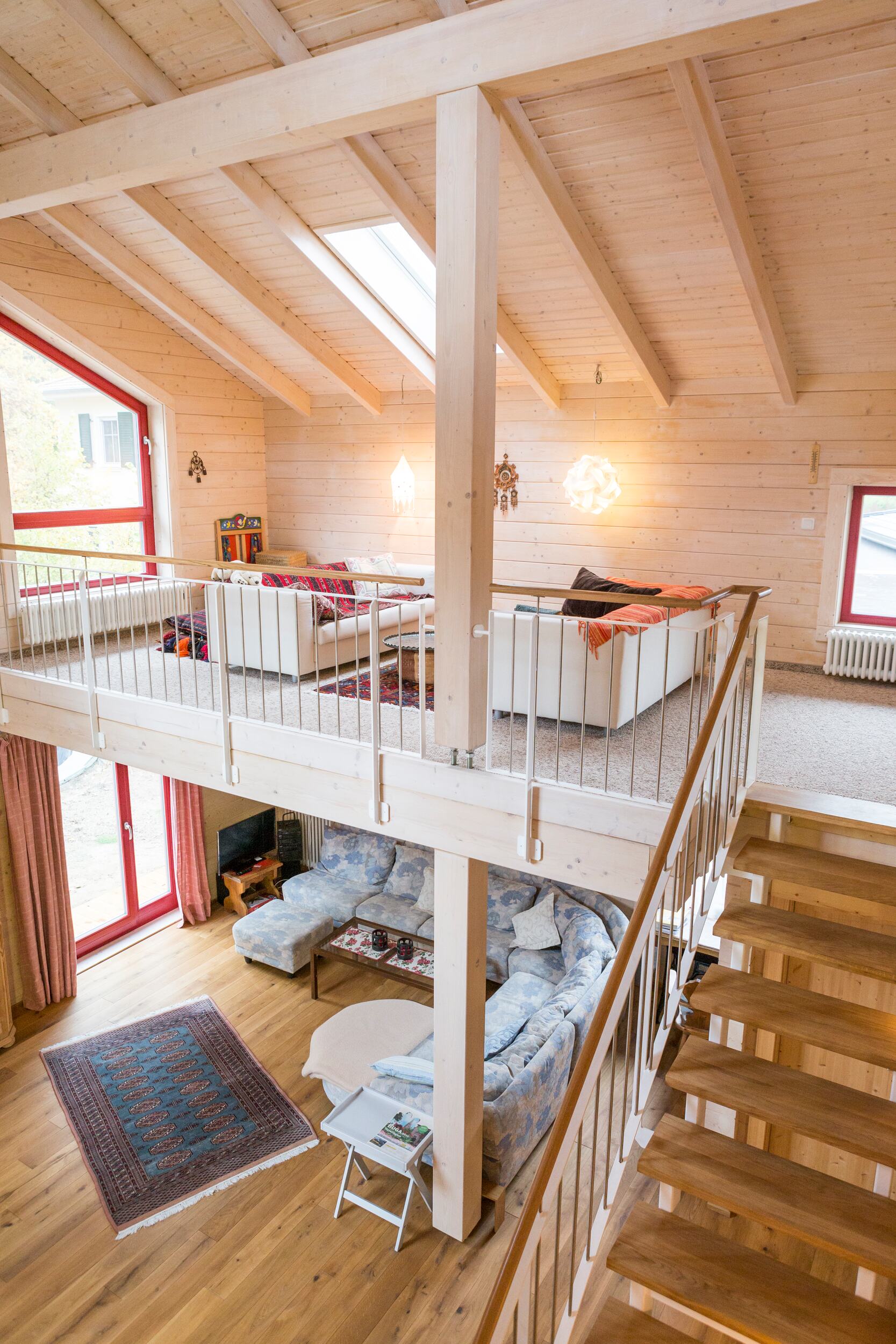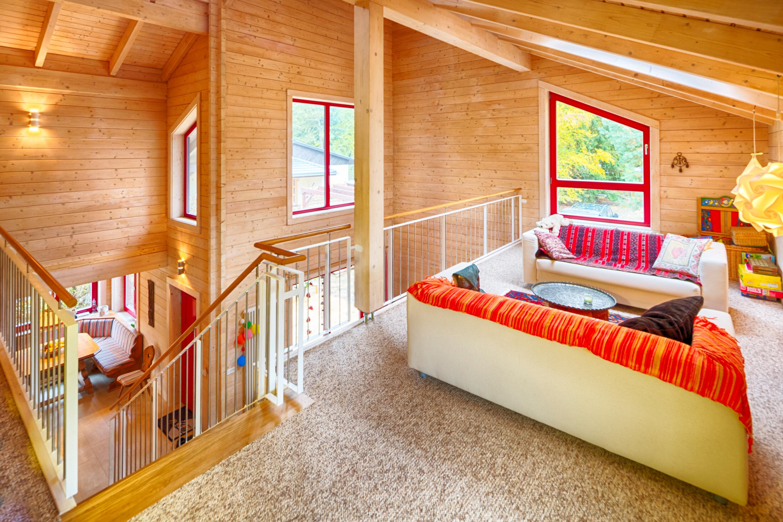 Während der Außenanstrich eine kühle Eleganz auf den Betrachter vermittelt, lässt die helle Lasur im Innenraum das Holzhaus regelrecht strahlen. Licht gelangt durch die zahlreichen großen Fenster in jede Ecke des Hauses – ein warmes, wohliges Wohngefühl lässt die Bewohner entspannen. Das Erdgeschoss ist offen gehalten: von der Hauseingangstür gelangt man direkt in die offene Küche mit Sitzecke sowie in den Wohn-/Essbereich. Von hier auch blickt man direkt bis unters Dach – die Galerie lässt optisch atmen und vermittelt die Freiheit, die den Menschen im Alltag oft fehlt. Auch Schlaf- und Badezimmer sowie ein Hauswirtschaftsraum und ein Gäste-WC finden im Erdgeschoss Platz. Hier wurde bereits an die Zukunft und an das Leben im Alter gedacht – es kann sich somit komplett im Erdgeschoss abspielen.