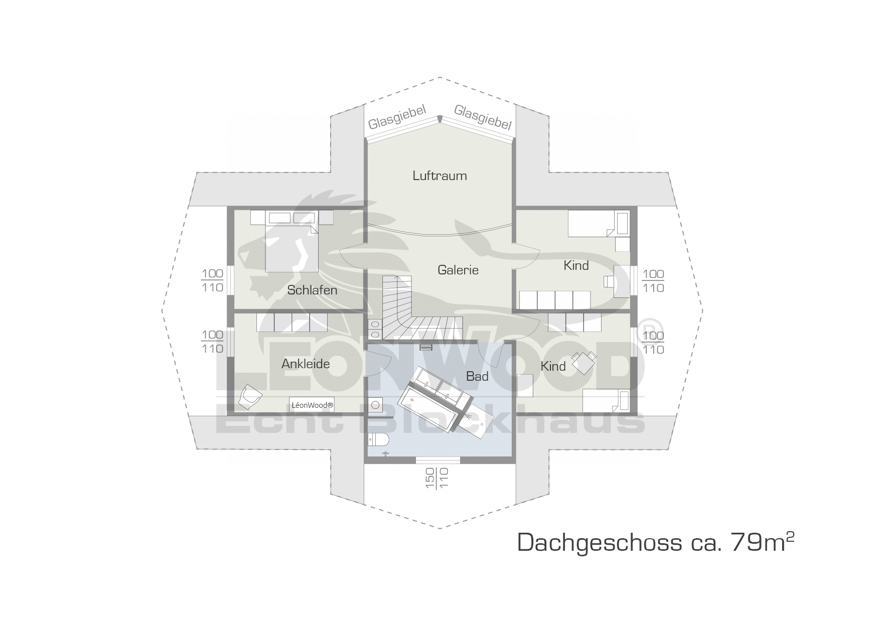 Die Optik dieses Eigenheims besticht vor allem durch die hausprägenden Schiffsgiebel, die an beiden Hauptstirnseiten, sowie an beiden Erkern angelegt sind. Diese sogenannten Schwebegiebel verleihendem ganzen Haus eine erhabene Ausstrahlung und machen es zu etwas Besonderem. Der kreuzförmige Grundriss erinnert an sakrale Bauten, die alle Blicke Richtung Altar lenken. Bei diesem Blockhaus strebt alles zu der vollflächig verglasten Giebelseite hin, die sich in die hölzerne Stirnseite schmiegt. Ergänzt wird das Massivholzhaus im kanadischen Stil durch eine halb umlaufende Sonnenterrasse. Ein weiteres Detail: die Satteleingangsüberdachung auf Rundstammstützen, welche das Erscheinungsbild perfektioniert.