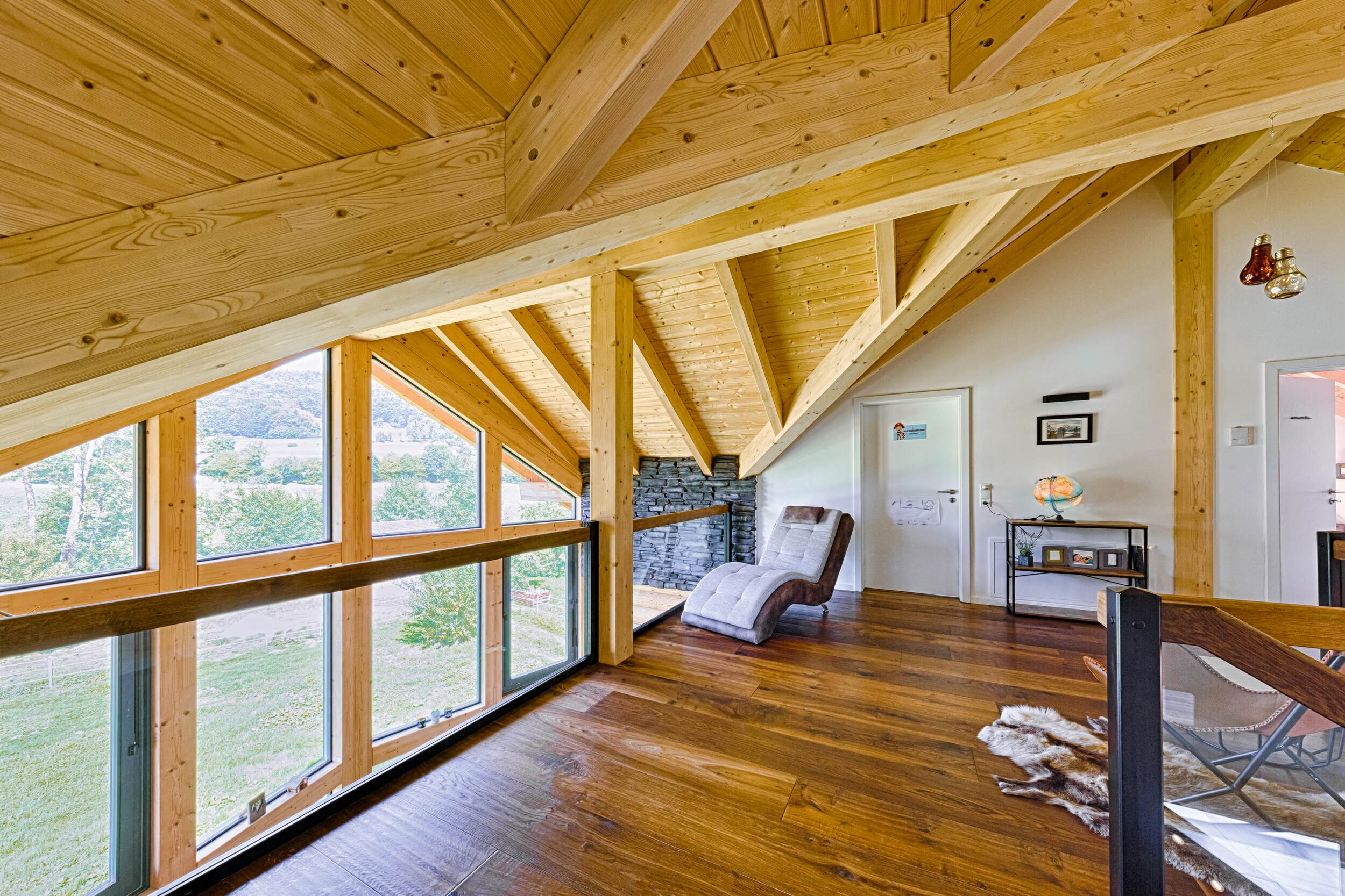 Auch hier dominieren symmetrische Strukturen. Alle Räumlichkeiten sind in etwa gleich groß. Einen zusätzlichen Ruhepol bietet der Galeriebereich. Man blickt auf massive, hölzerne Sparren und durch die große Fensterfront des Giebels – Natur pur, innen wie außen!