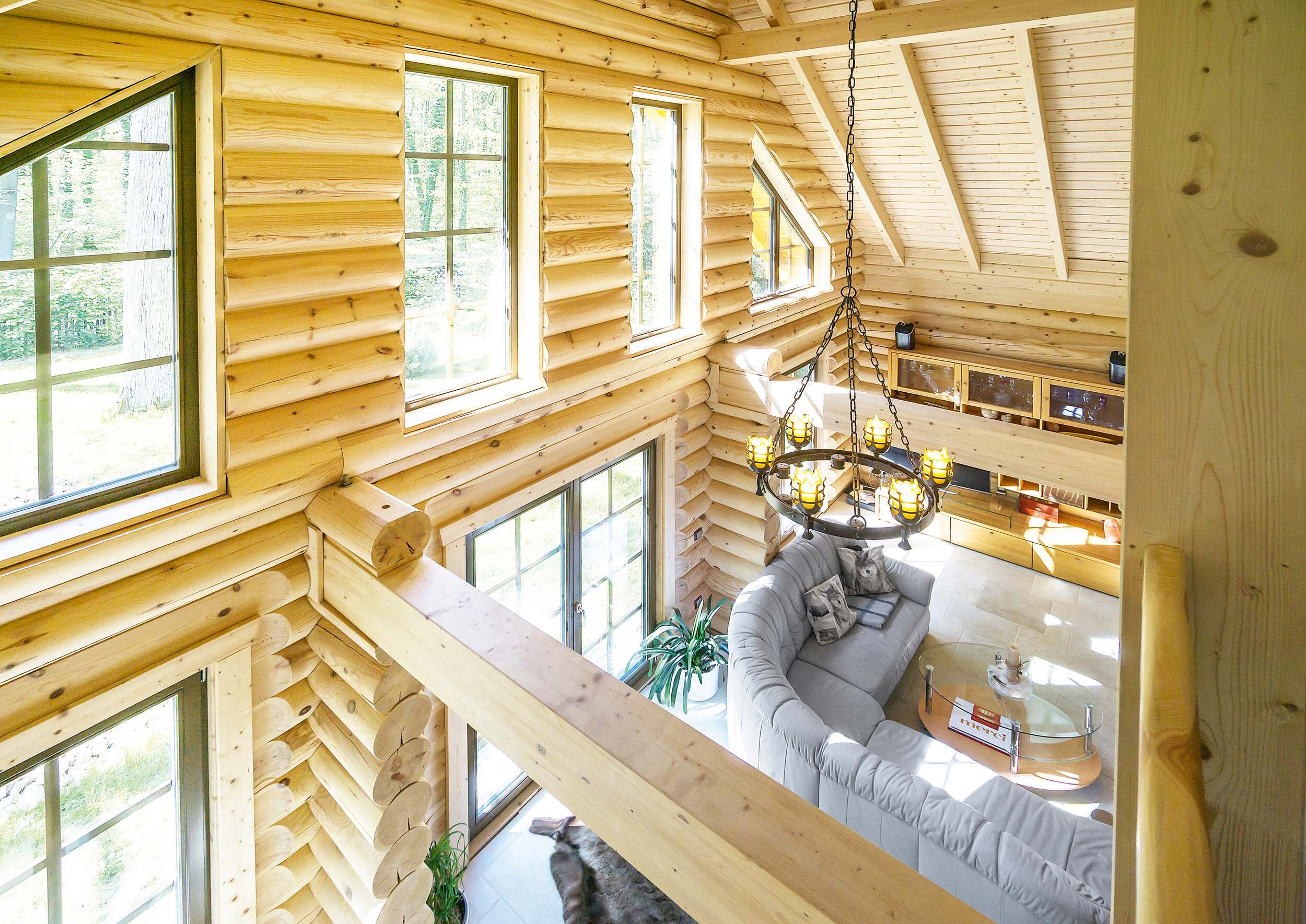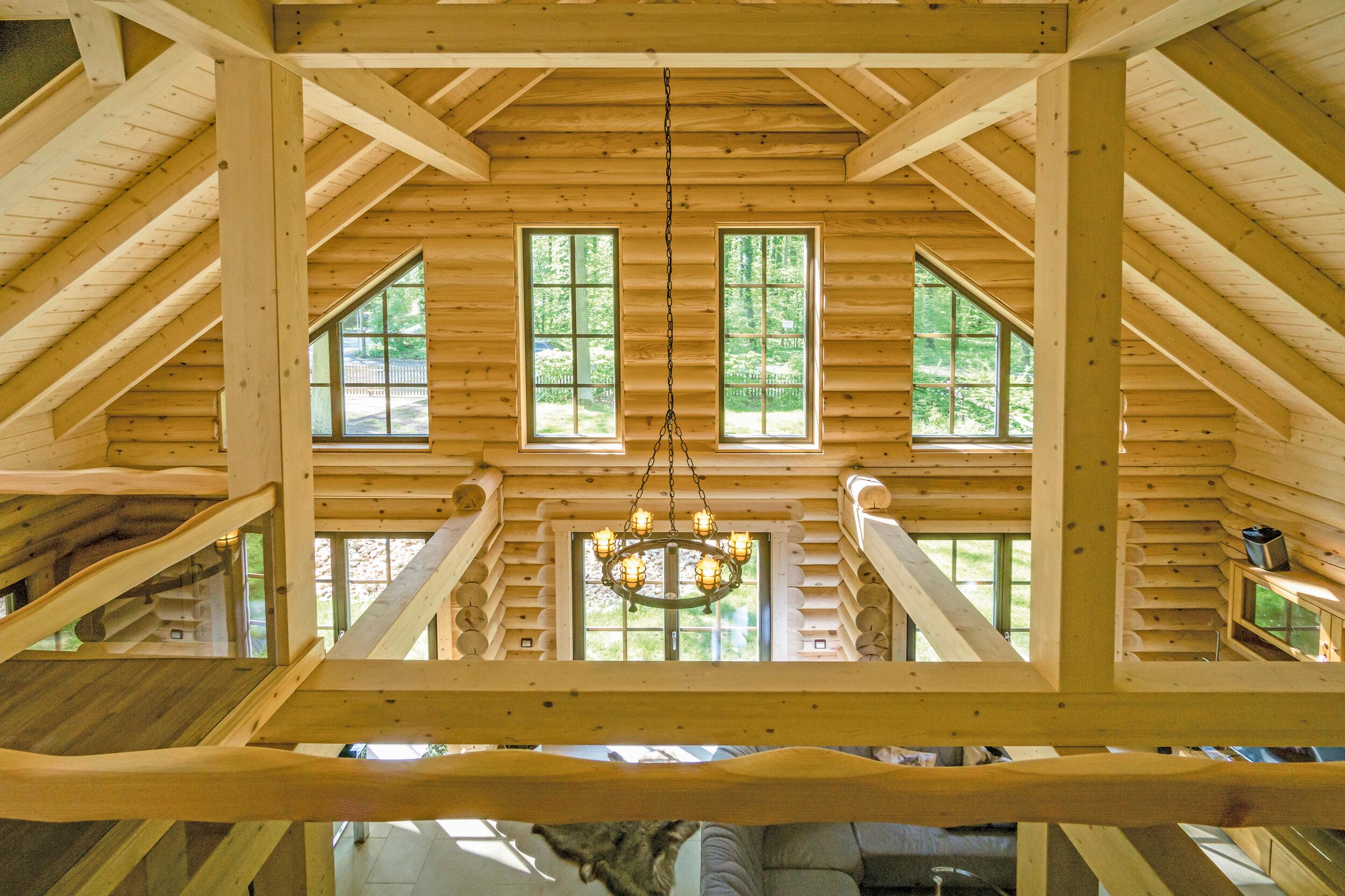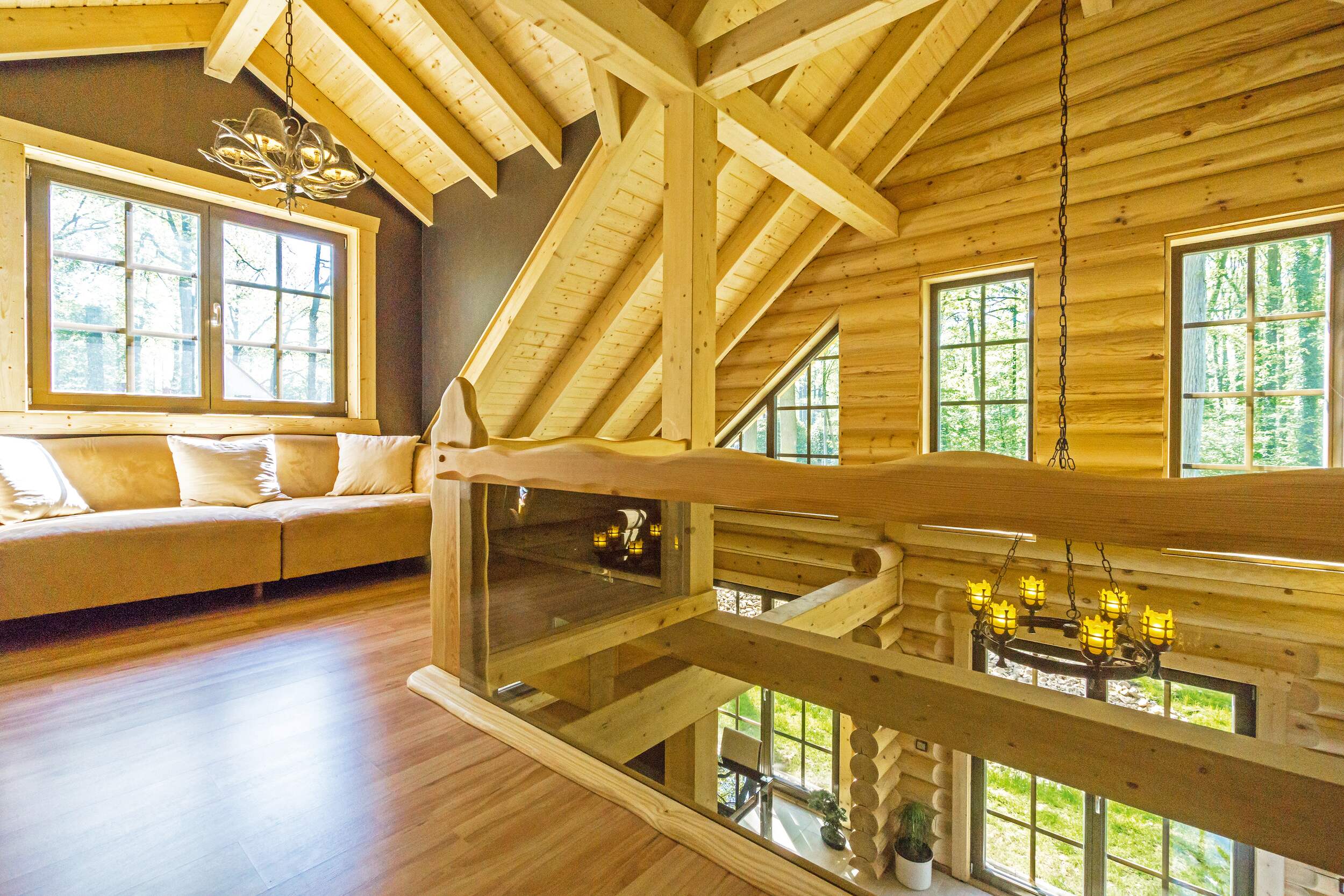 Ursprüngliche Rundstammbauweise mit 25 cm Polarkiefer NordicRound*, markanter Glasgiebel mit Galerie, sichtbare Holzbalkendecke