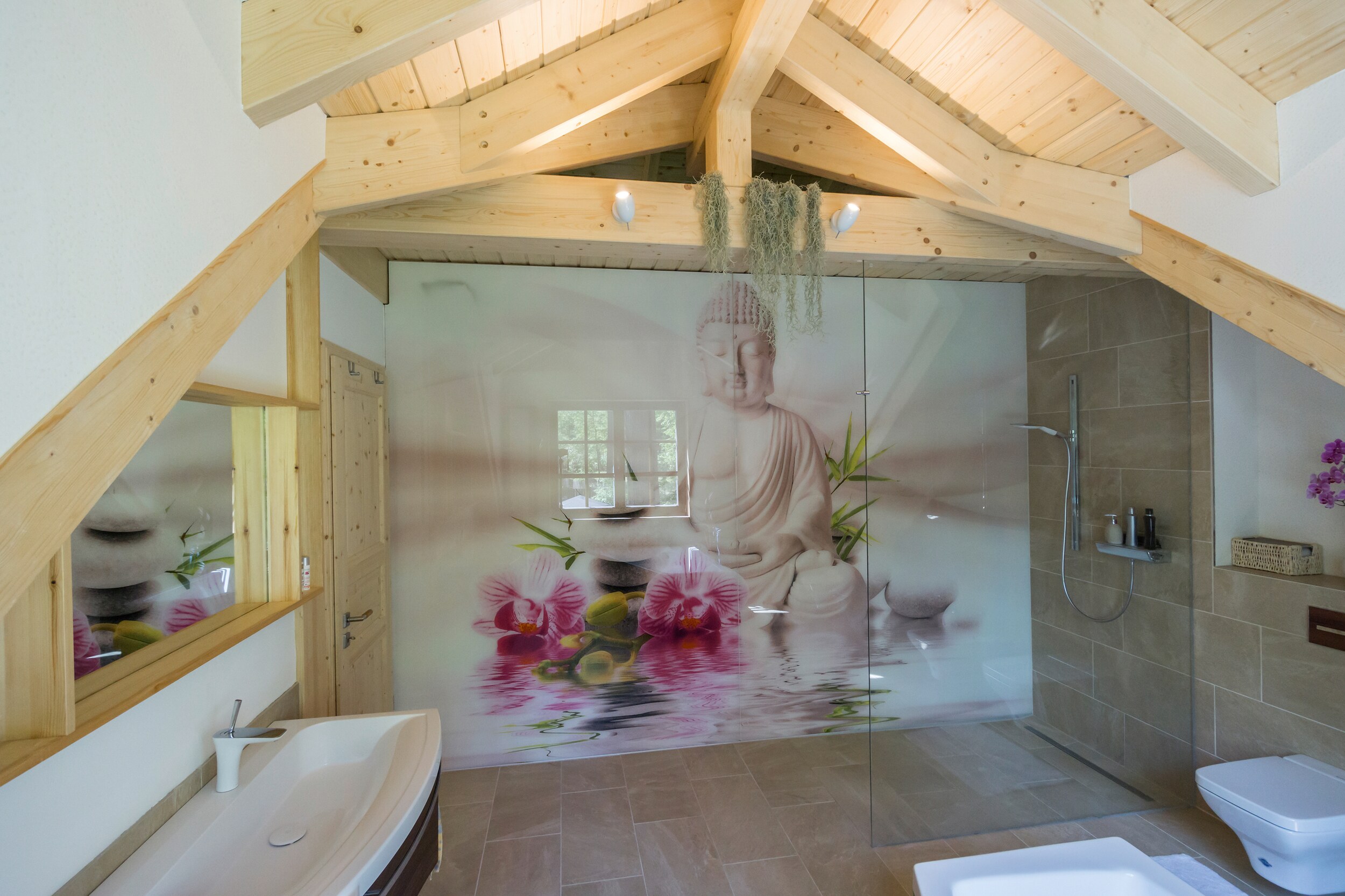 Über eine Treppe im Wohnbereich gelangt man in die Galerie mit den angrenzenden Räumlichkeiten im Dachgeschoß. Neben einem großen Badezimmer befindet sich ein weiteres Schlafzimmer. Auch in diesem Bereich des Hauses wurde mit Offenheit und Grenzenlosigkeit gearbeitet. Mit Blick auf den Fenstergiebel ist die Sicht nach draußen, in Richtung Natur frei.